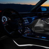 | Pogled na voznikov delovni prostor razkriva popolno digitalizacijo. Uporabniška izkušnja se približuje tablici oziroma pametnemu telefonu, avto se odziva tudi na glasovne ukaze, a ne slovenske. Klasičnih, mehanskih stikal na zgornjem, osrednjem delu sredinske konzole ni več. Je pa na spodnjem zaslonu prostor za bližnjice, ki si jih nastaviš tako kot na zaslonu pametnega telefona. Ne moremo mimo odličnega 12,3-palčnega sklopa prilagodljivih digitalnih merilnikov in naprednega projekcijskega zaslona. Ta v barvah na vetrobransko steklo pošilja vse ključne informacije, tudi navigacijske napotke. |