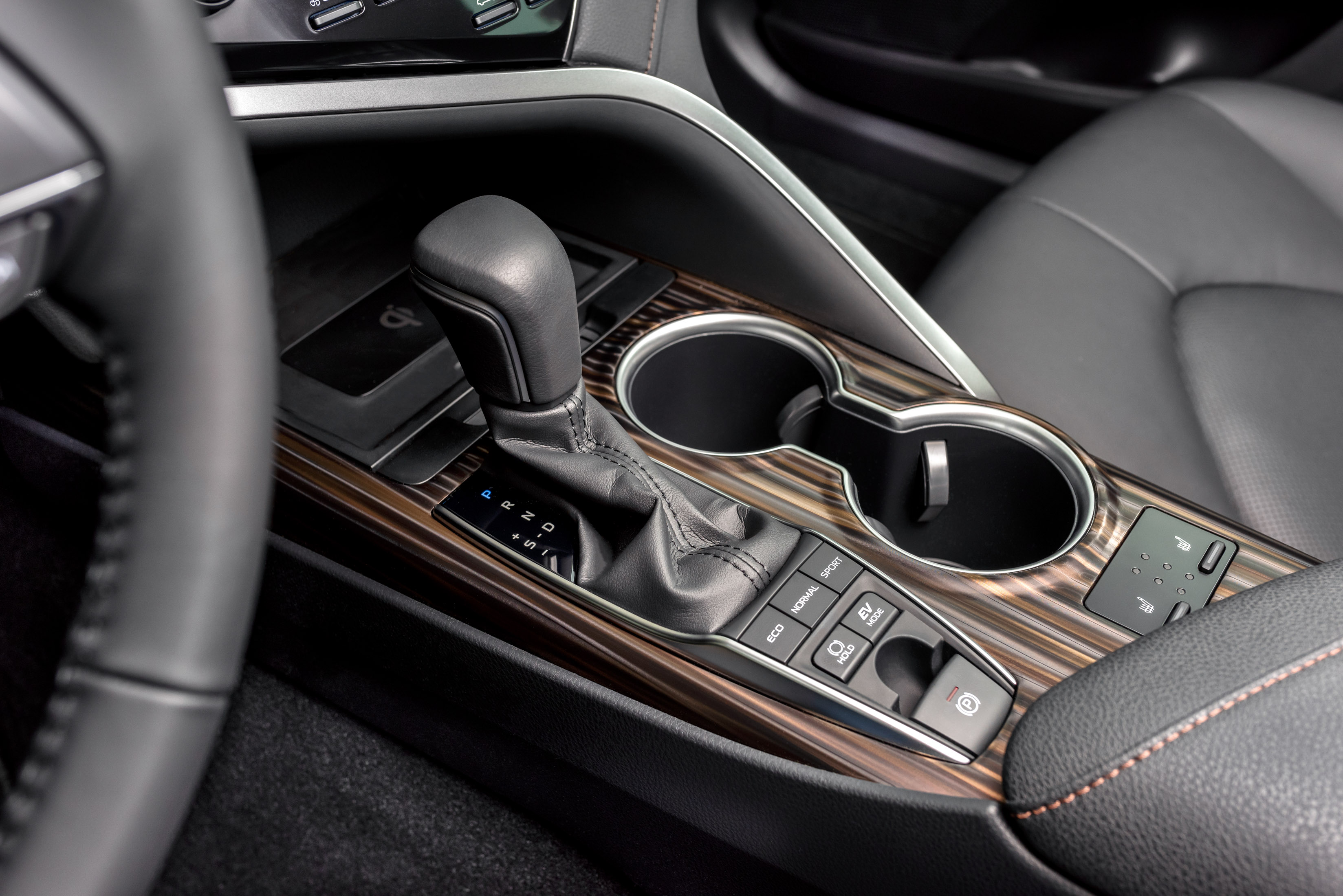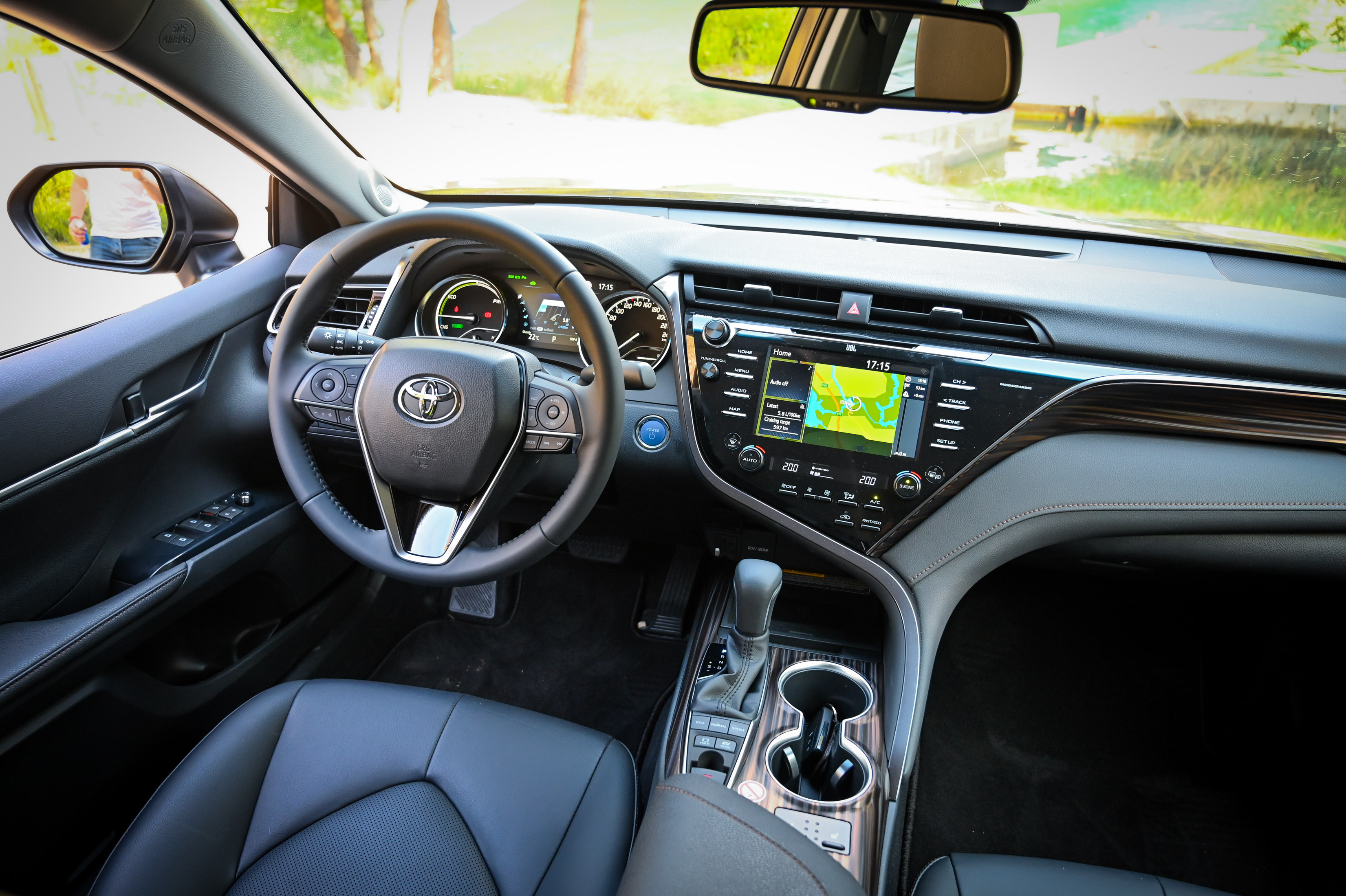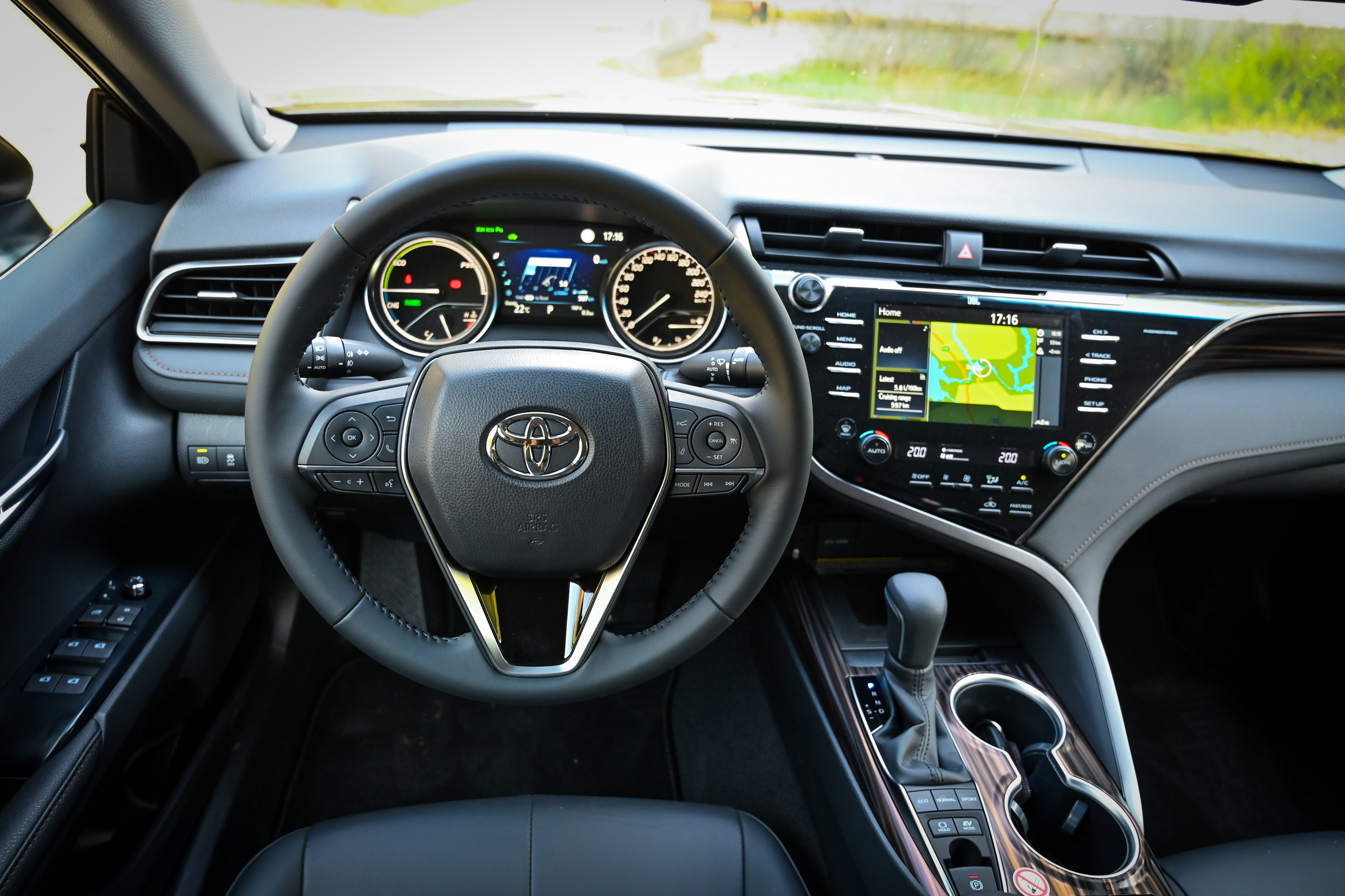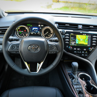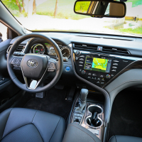Ergonomija voznikovega prostora je evropsko dosledna, armatura precej ameriška, a zanimiva z veliko utori oziroma držali za pijačo, USB priključki in s ploščadjo za brezžično polnjenje telefona. Komunikacijski center predstavlja osrednji 8-palčni zaslon na dotik. Vse ključne informacije camry namreč izpisuje v višini voznikovih oči na vetrobranskem steklu. Prilagodljiv projekcijski zaslon je velik kar 10 palcev. Pri vseh ravneh opreme bo del serijske opreme izdaten paket varnostnih pripomočkov toyota safety sense. Do hitrosti 50 km/h zna camry samodejno preprečiti nalet tudi s pešcem, do hitrosti 180 km/h z radarskim tempomatom samodejno vzdrževati varnostno razdaljo in v gneči do hitrosti 40 km/h slediti prometnemu toku - tudi s samodejno zaustavitvijo in ponovnim speljevanjem.