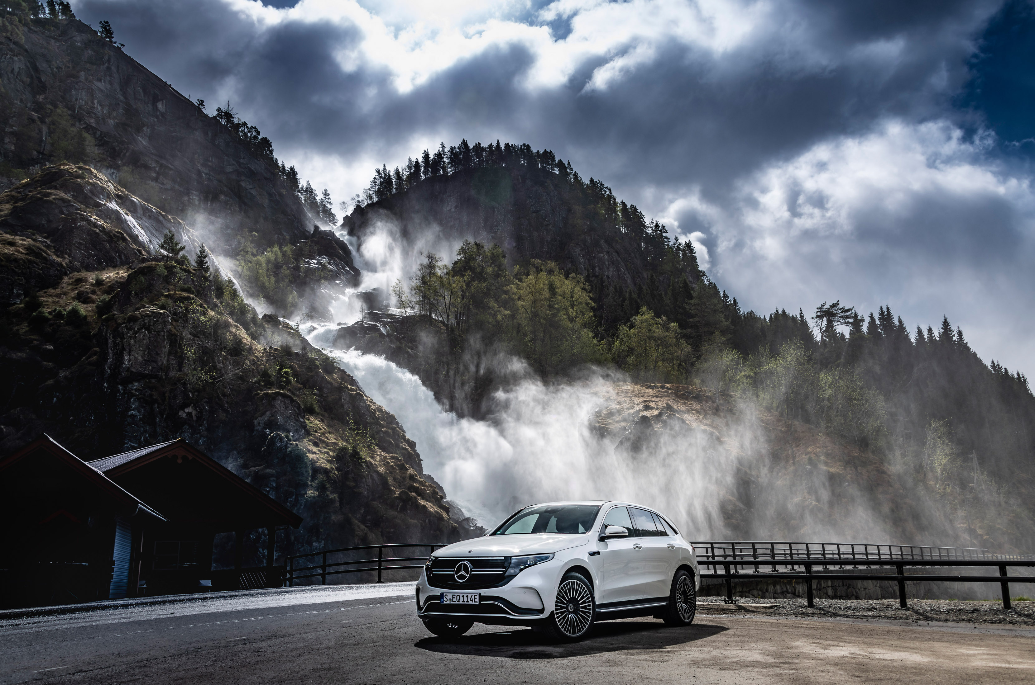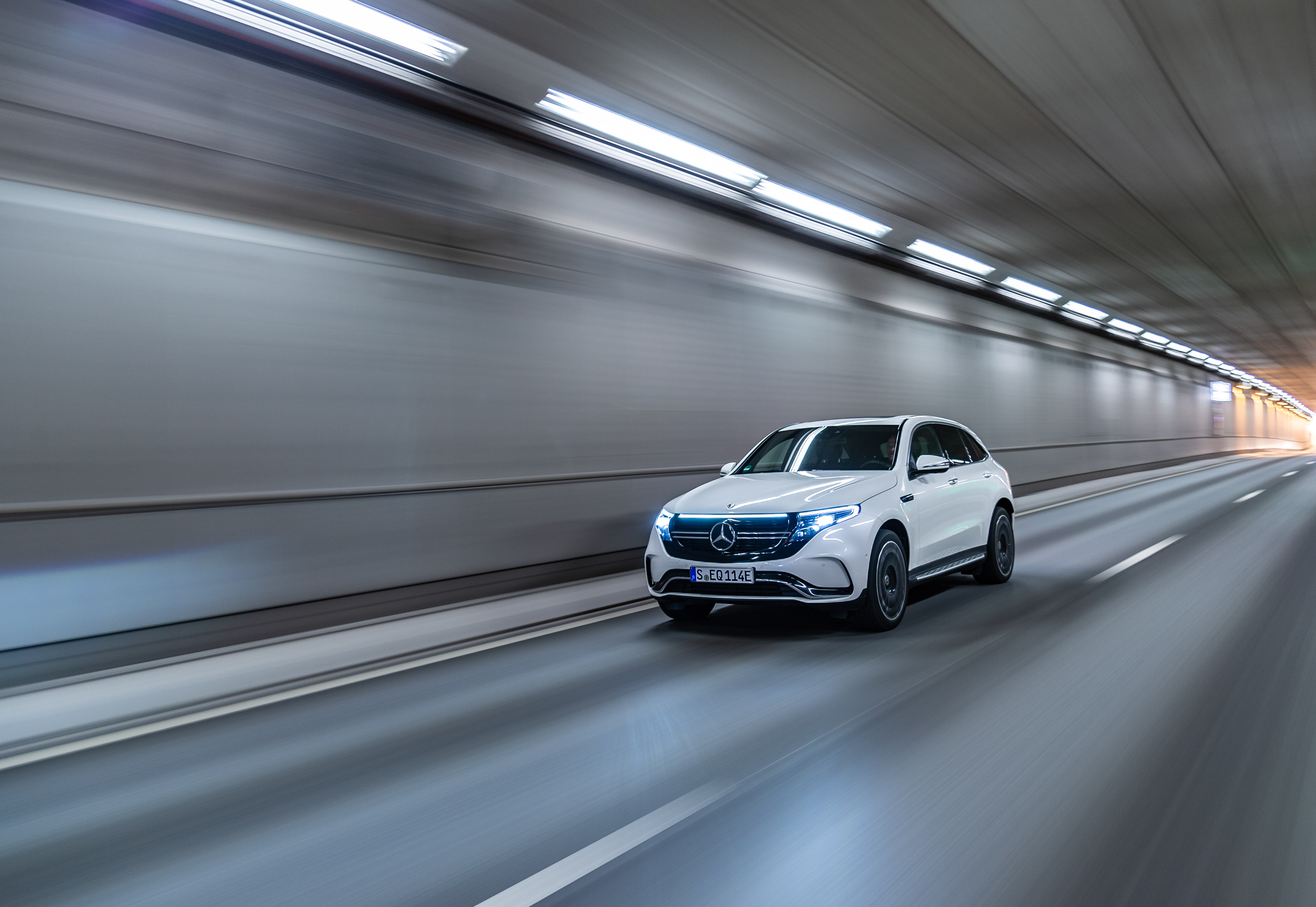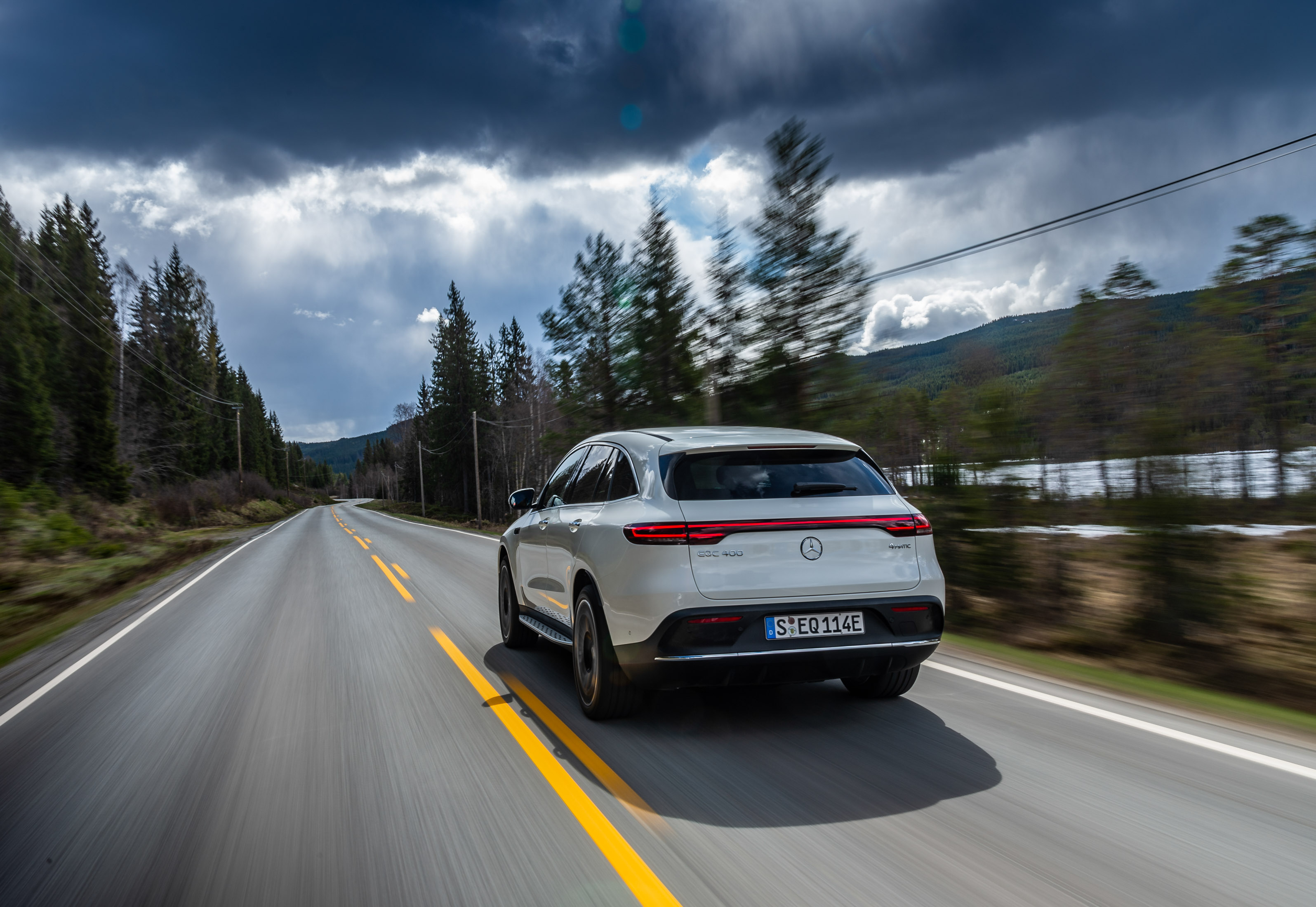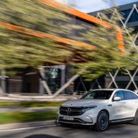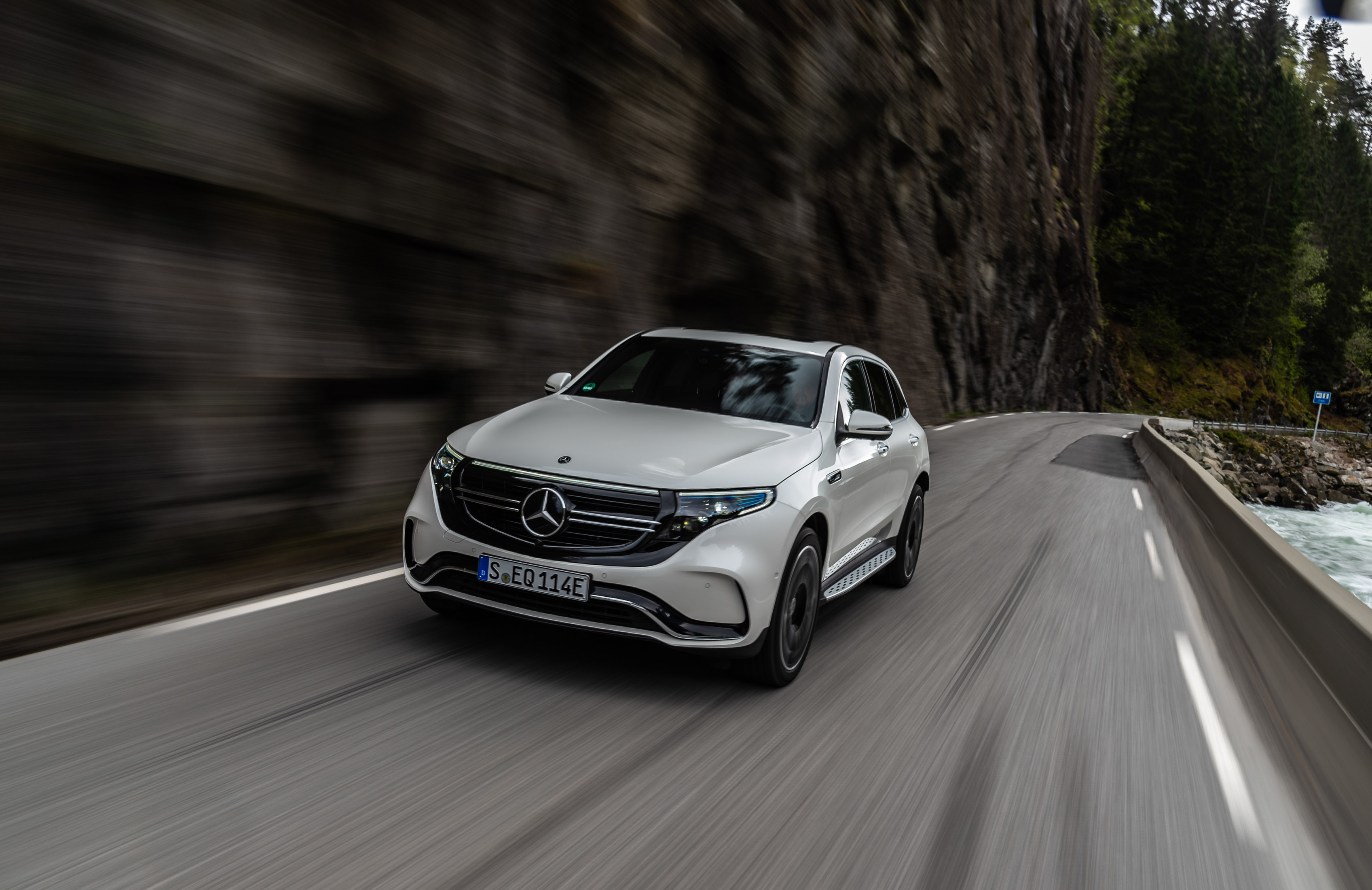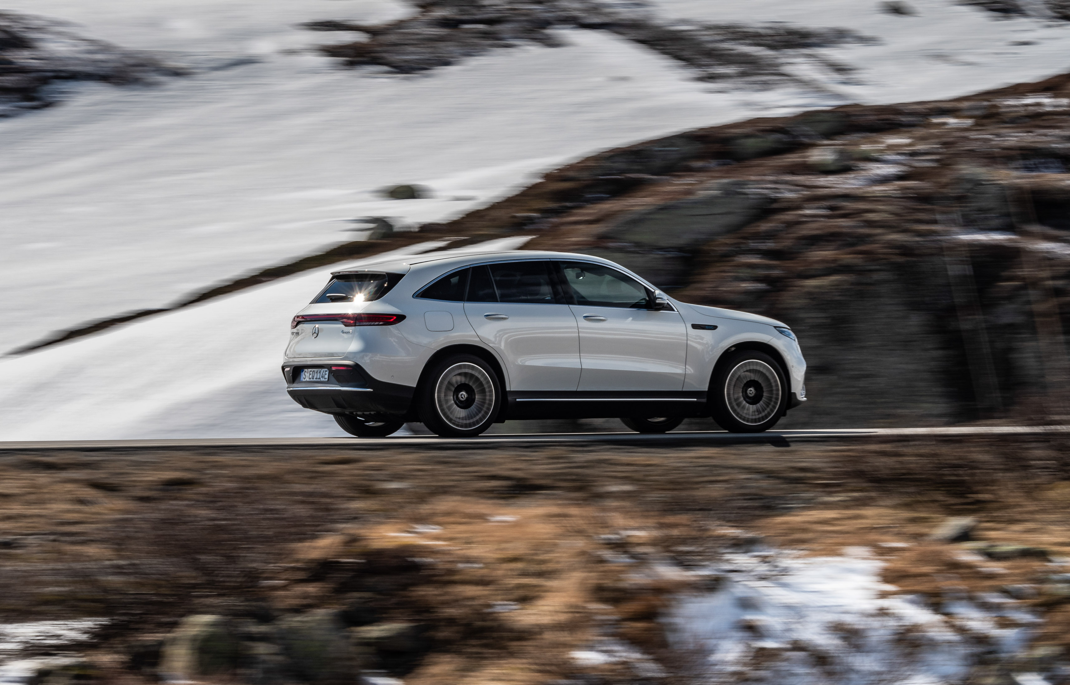 Avto poganjata dva električna motorja, po eden nad vsako osjo, kar omogoča učinkovit in odziven štirikolesni pogon. Sistemska pogonska moč 300 kW in kar 760 Nm navora zagotavljata odlične pospeške - do 100 km/h EQC pospeši v skoraj že dirkaških 5,1 sekunde. Največja hitrost je omejena na 180 km/h. Kljub masi 2,5 tone je EQC v vožnji prijetno lahkoten avto, le pri hitrih menjavah smeri se občluti njegova velika masa - četudi ima zaradi nizko vgrajenega akumulatorskega sklopa zelo nizko težišče.