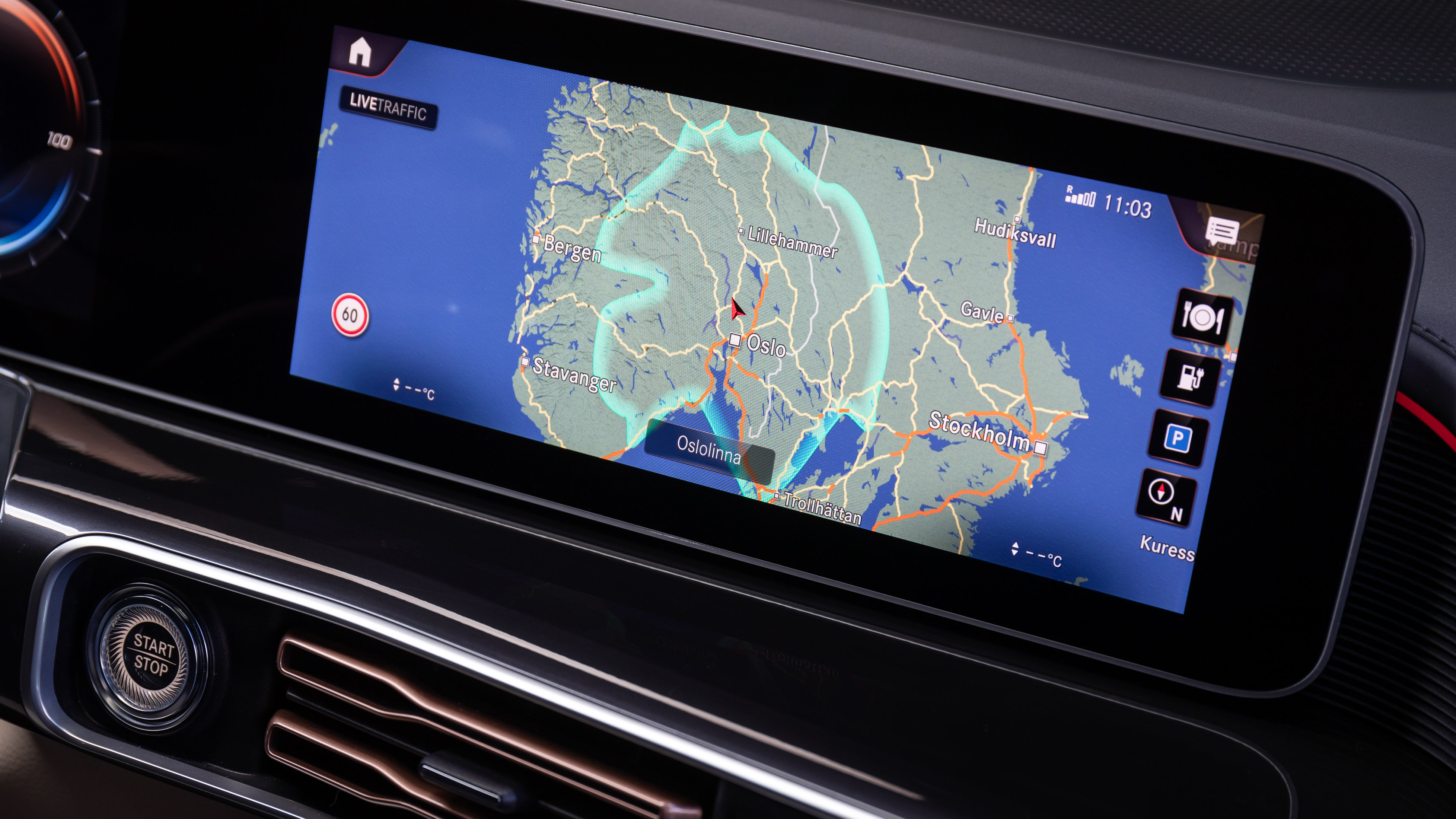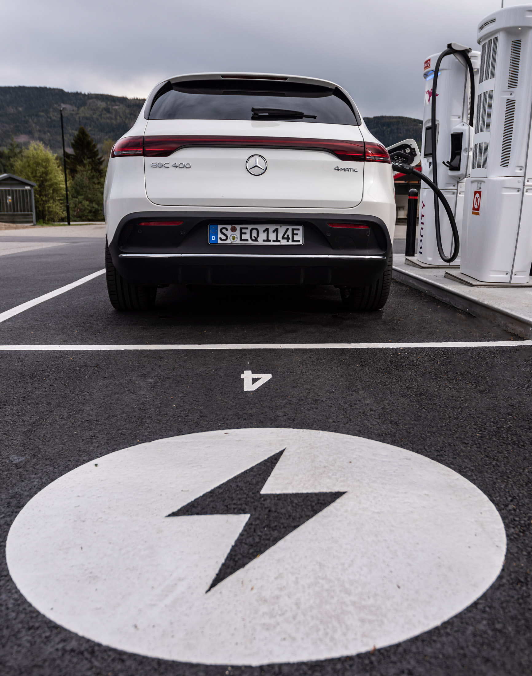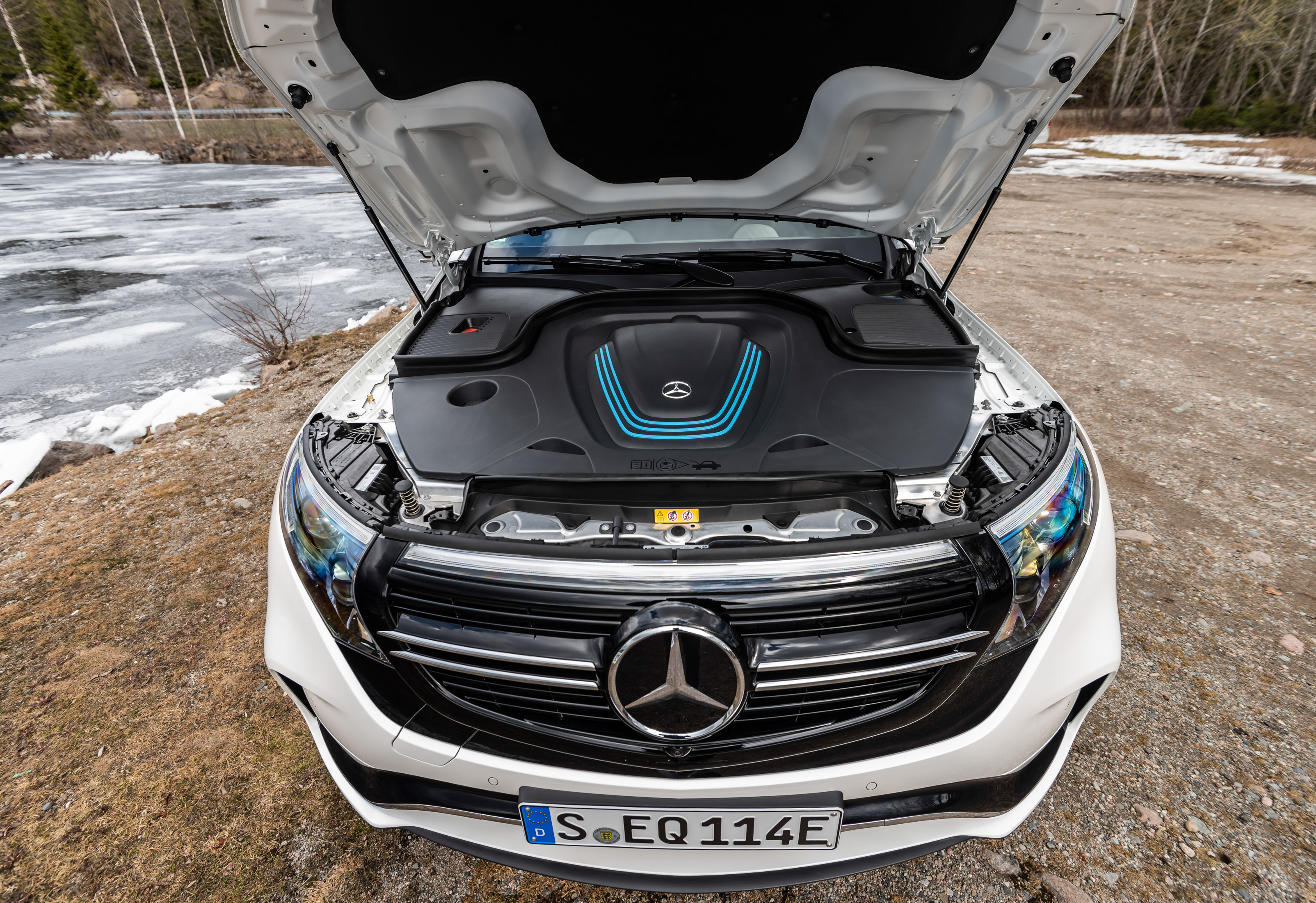 | Litij-ionski sklop akumulatorjev z zmogljivostjo 80 kWh je izdelek Daimlerjeve družbe Accumotive iz saškega Kamenza. Nominalna zmogljivost akumulatorjev je 210 Ah, največja napetost pa 408 V. Prek izmeničnega polnilnika, ki zmore le 7,4 kW, akumulatorski sklop od 10 do 100 odstotkov lahko napolnimo v 11 urah, precej hitreje pa gre prek enosmernega polnilnika: na 110 kW polnilnici lahko akumulatorje od 10 do 80 odstotkov napolnimo v 40 minutah. Na Ionityjevi ultrahitri polnilnici v okolici Osla smo avto polnili z nekaj več kot 100 kW. |