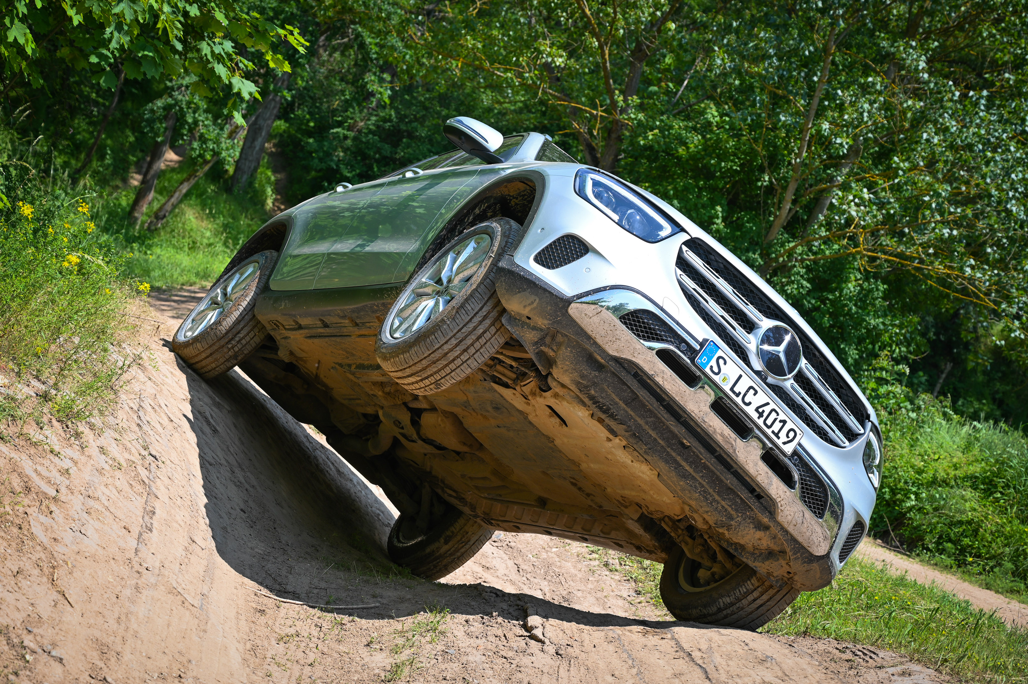To, kar zmore GLC zunaj asfalta, vsaj 90 odstotkov njegovih lastnikov nikoli ne bo preizkusilo v praksi. Off road terenski paket nudi tudi izdatno podporo terenski vožnji z merilniki naklona, kota volana, živo sliko s kamer in celo poseben terenski snop svetlobe prilagodljivih LED žarometov, ki sveti neposredno pred sprednji odbijač. Celovita elektronska podpora na strmini v celoti prevzame skrb za ustrezno hitrost, nadzor oprijema in delovanje zavor. Voznik se lahko popolnoma osredotoči zgolj na natančno usmerjanje avta mimo kamenja, korenin in drugih ovir na terenu. Sistem za nadzorovan spust po strmini deluje tudi pri vzvratni vožnji. Elektronsko nadzorovan 4matic štirikolesni pogon ima na sklopki dodatno zaporo (50 Nm). Avto ni zunaj asfalta prav nič manj suveren kot na avtocesti. Poglejte fotografije. Tudi, če je kolo visoko v zraku, ne izgubi oprijema in se zmore izvleči iz zelo težkih razmer brez reduktorja in mehanske zapore diferencirala. Najbolj impresivno pa je dejstvo, da je pogon povsem nezahteven za uporabo, saj je terenski program vožnje dosegljiv le z enim pritiskom na stikalo.