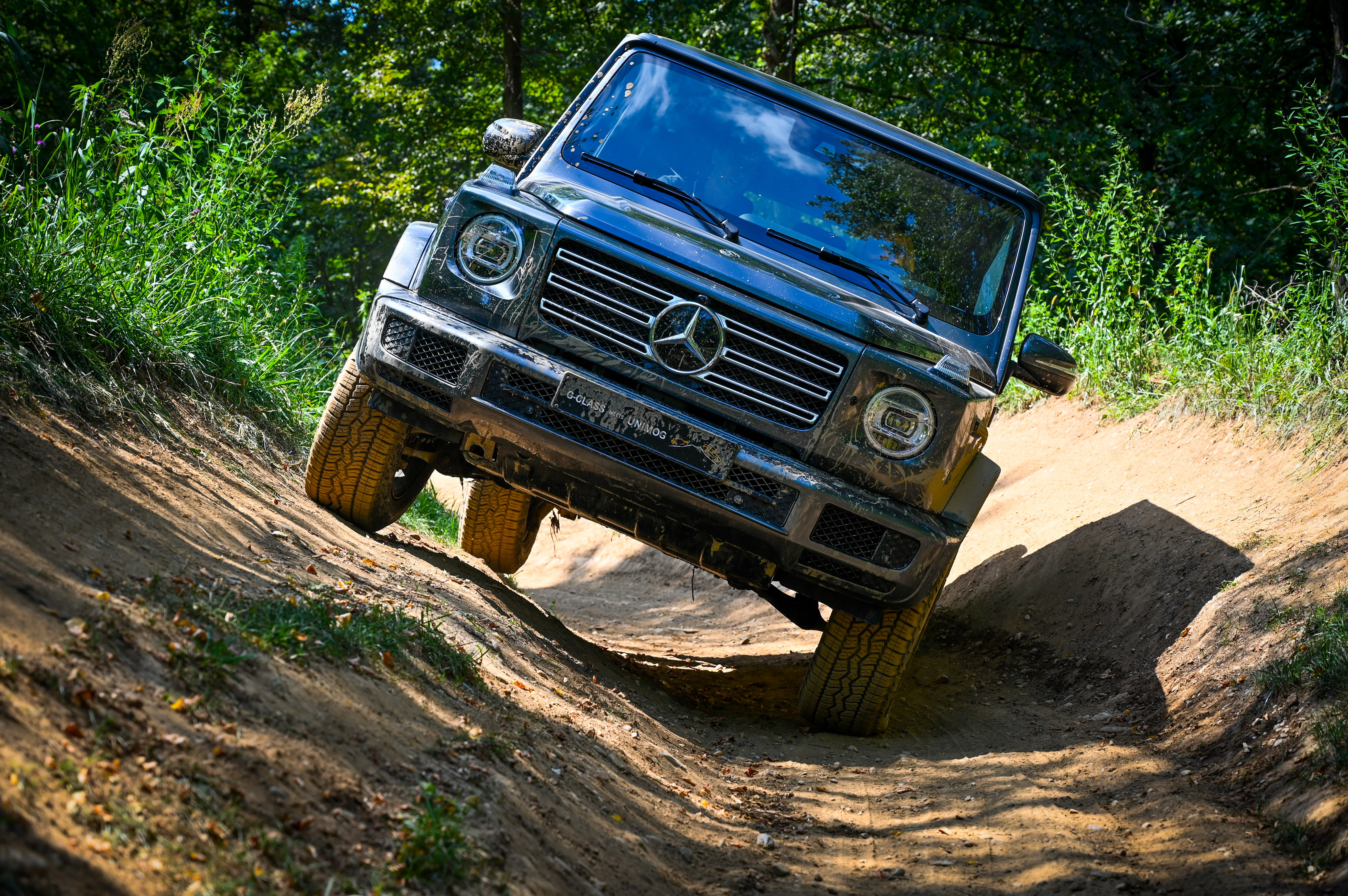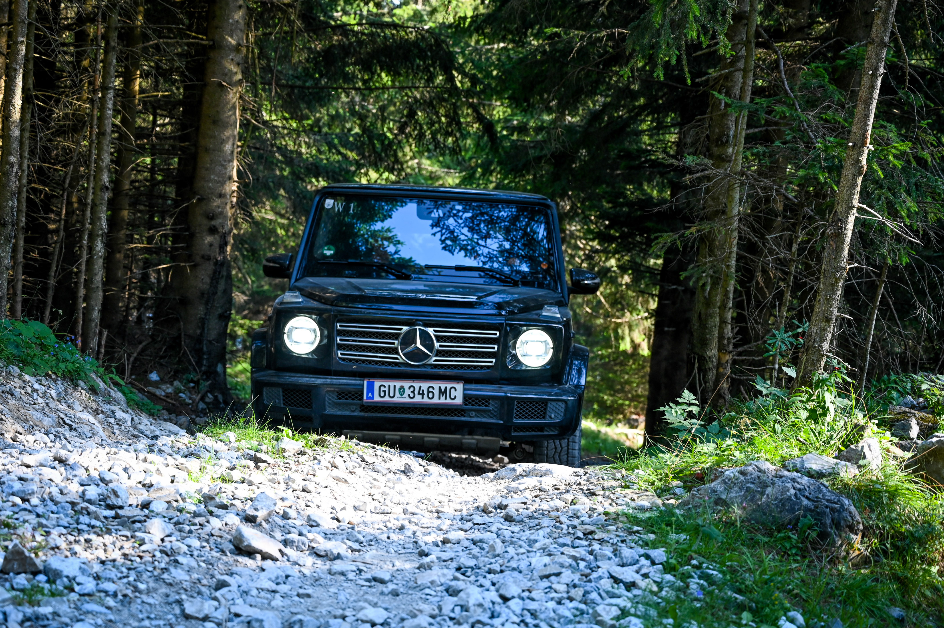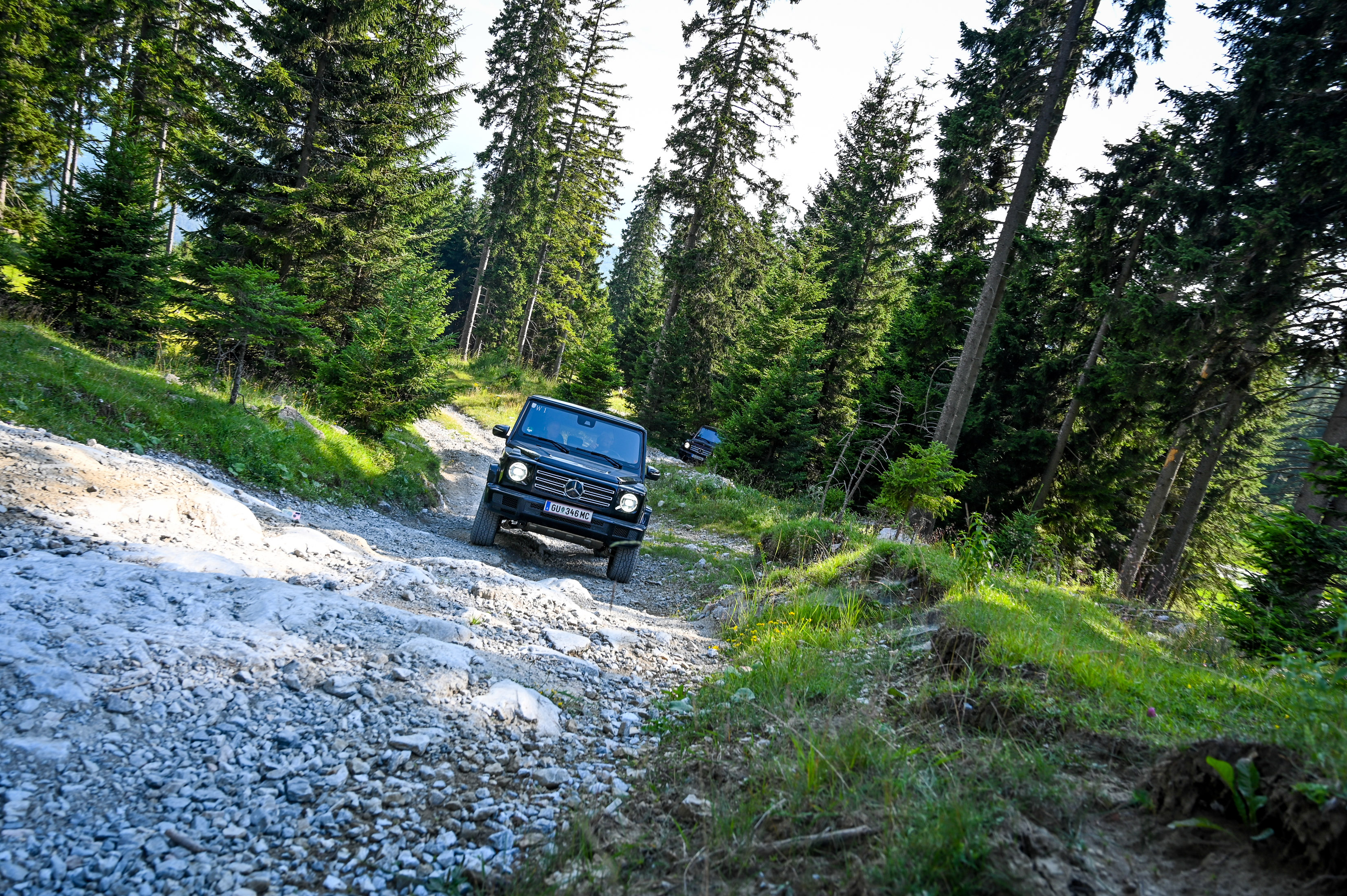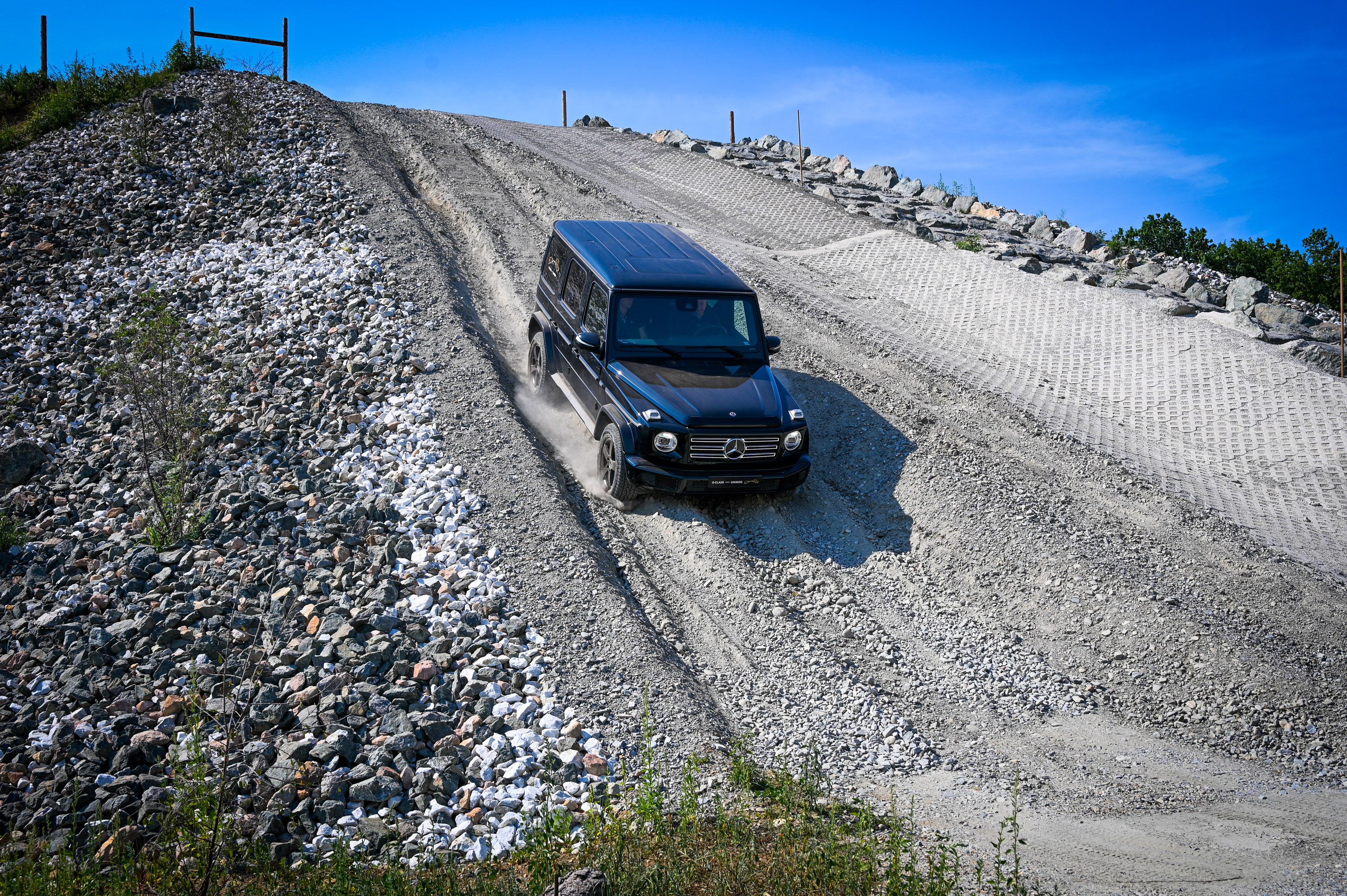 Terenske zmogljivosti razreda G so zares impresivne že na papirju. Izza volana pa številke postanejo občutki … Avto je izjemno zmogljiv in ob ekstremnih bočnih naklonih ali pri plezanju po 45-stopinjskem klancu telo dobesedno začuti učinek gravitacije. Težko je opisati, a kot voznik dejansko začutiš kako vsak razpoložljiv Nm išče pot do podlage. Najbolj impresivno je dejstvo, da večina terenskih pomagal v najtežjih razmerah deluje povsem mehansko, brez elektronskih pomagal. Stalni štirikolesni pogon v običajnih voznih razmerah 40 odstotkov navora pošilja na prednji kolesi, 60 odstotkov pa na zadnji kolesi. Pri vklopu sredinske zapore se pogon med prednjo in zadnjo osjo razdeli v razmerju 50:50. Vrtenje koles v prazno razred G učinkovito preprečuje z 100-odstotnima zaporama v prednjem in zadnjem diferencialu.