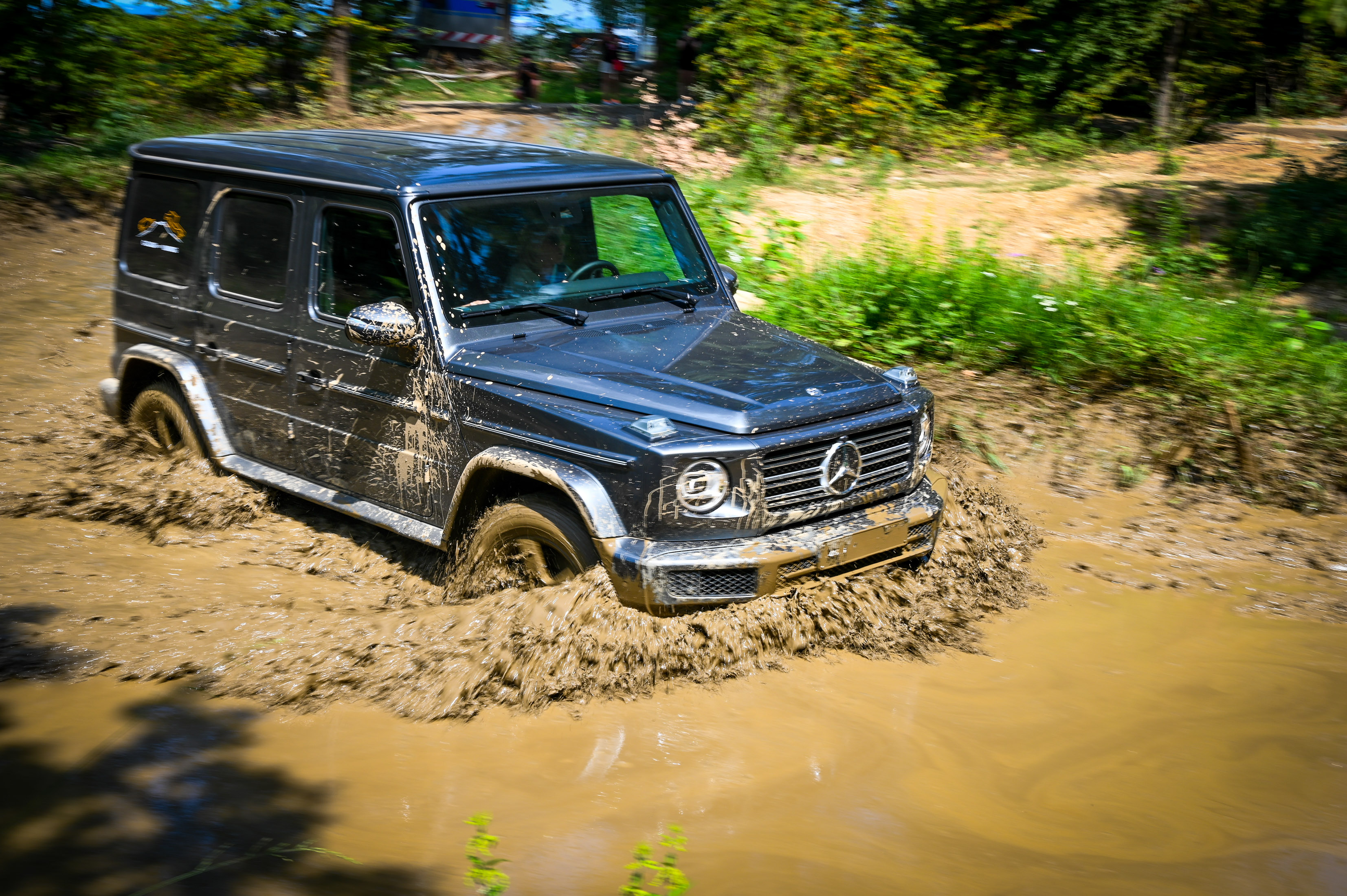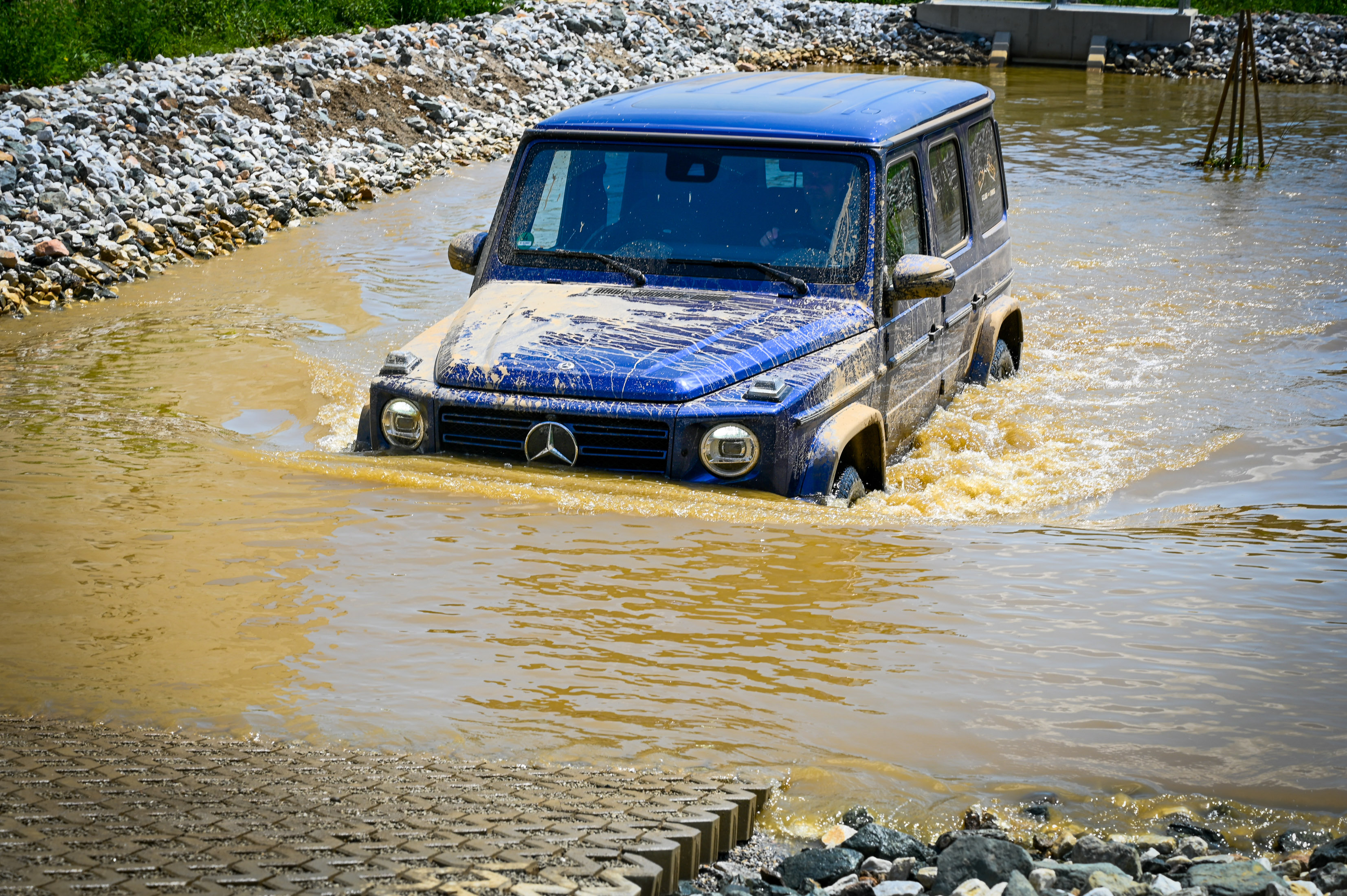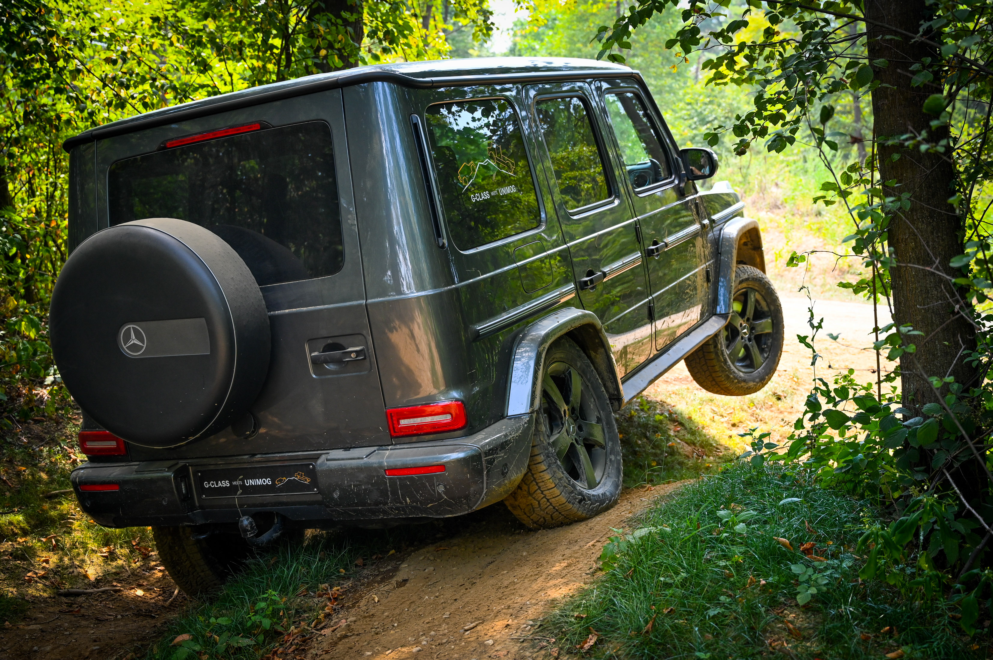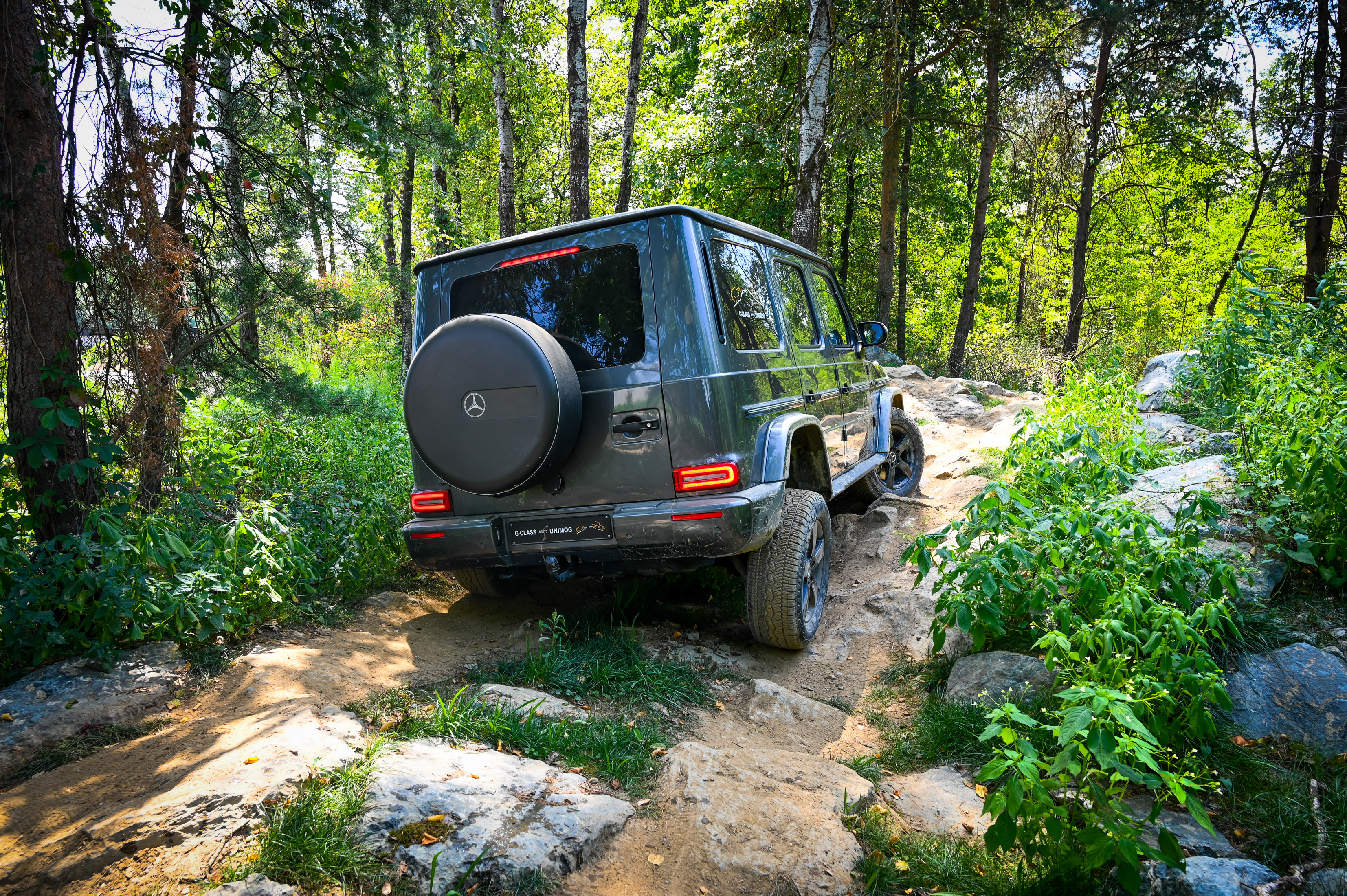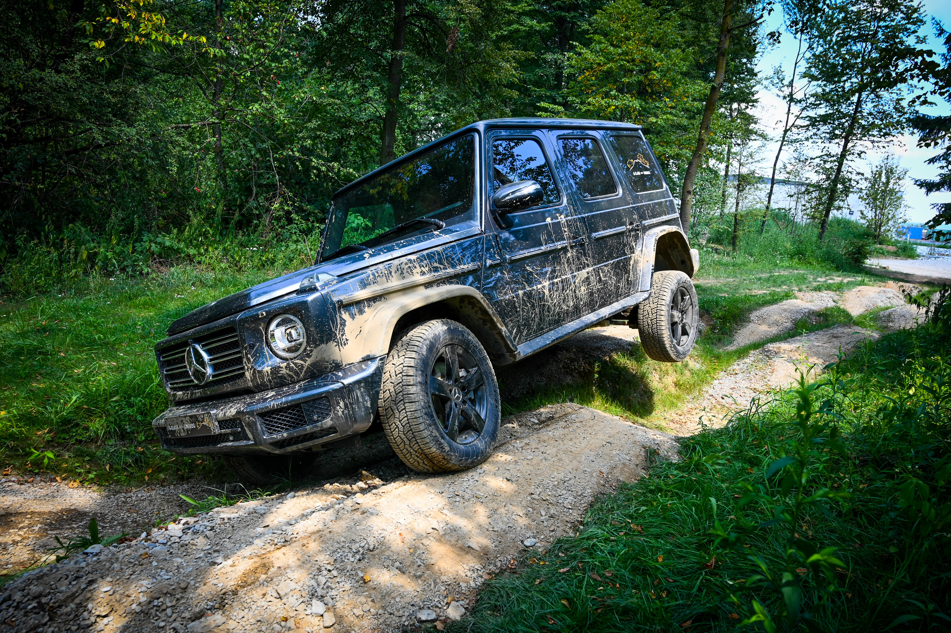 Terenske zmogljivosti razreda G so zares impresivne že na papirju. Izza volana pa številke postanejo občutki … Avto je izjemno zmogljiv in ob ekstremnih bočnih naklonih ali pri plezanju po 45-stopinjskem klancu telo dobesedno začuti učinek gravitacije. Težko je opisati, a kot voznik dejansko začutiš kako vsak razpoložljiv Nm išče pot do podlage. Najbolj impresivno je dejstvo, da večina terenskih pomagal v najtežjih razmerah deluje povsem mehansko, brez elektronskih pomagal. Stalni štirikolesni pogon v običajnih voznih razmerah 40 odstotkov navora pošilja na prednji kolesi, 60 odstotkov pa na zadnji kolesi. Pri vklopu sredinske zapore se pogon med prednjo in zadnjo osjo razdeli v razmerju 50:50. Vrtenje koles v prazno razred G učinkovito preprečuje z 100-odstotnima zaporama v prednjem in zadnjem diferencialu.