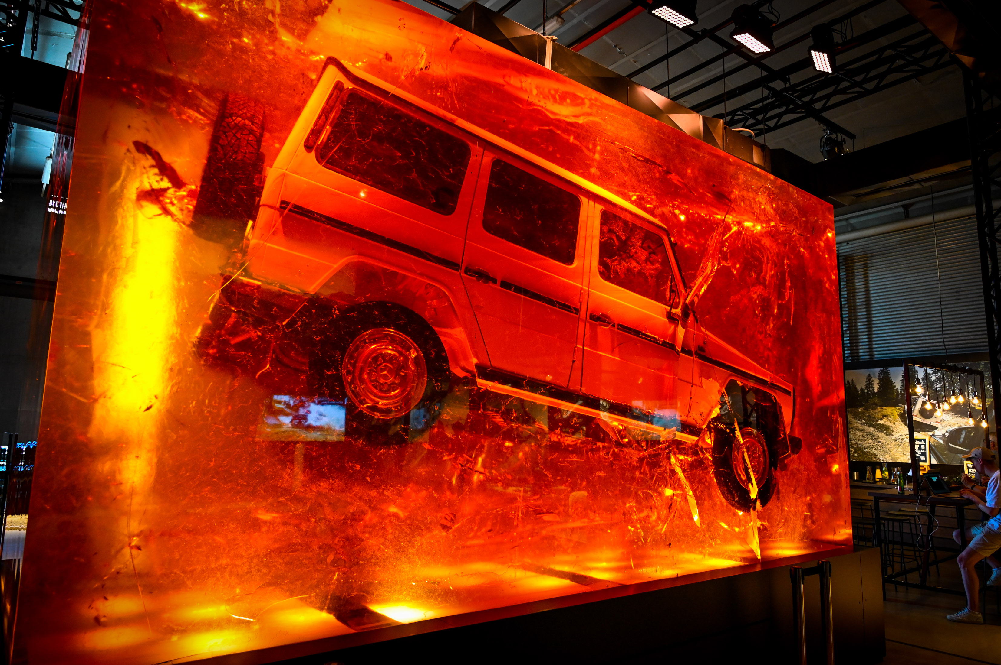 Poleg izredne vozne izkušnje pa je mogoče v razstavnem ateljeju spoznati celotno anatomsko zgradbo tega terenca in od blizu videti Mercedesovo kocko večnosti - v posebno epoksi smolo zalitega mercedesa G prve generacije, ki so ga simbolično pripravili za večno življenje v stilu ohranjanja tehničnih genov v jantarju. Impozantna skulptura - trezor mehanike - oziroma tehnična instalacija skupaj s podnožjem tehta nič manj kot 52 ton. Program G izkušnje v Gradcu pa bo obsegal še ogled tovarne, v kateri že 40 let, od samega začetka dalje izdelujejo mercedesa razreda G oziroma na začetku pucha G - izvirnik zasnovan v Steyr Puch. Med izkušenimi inštruktorji je tudi slovenski predstavnik.