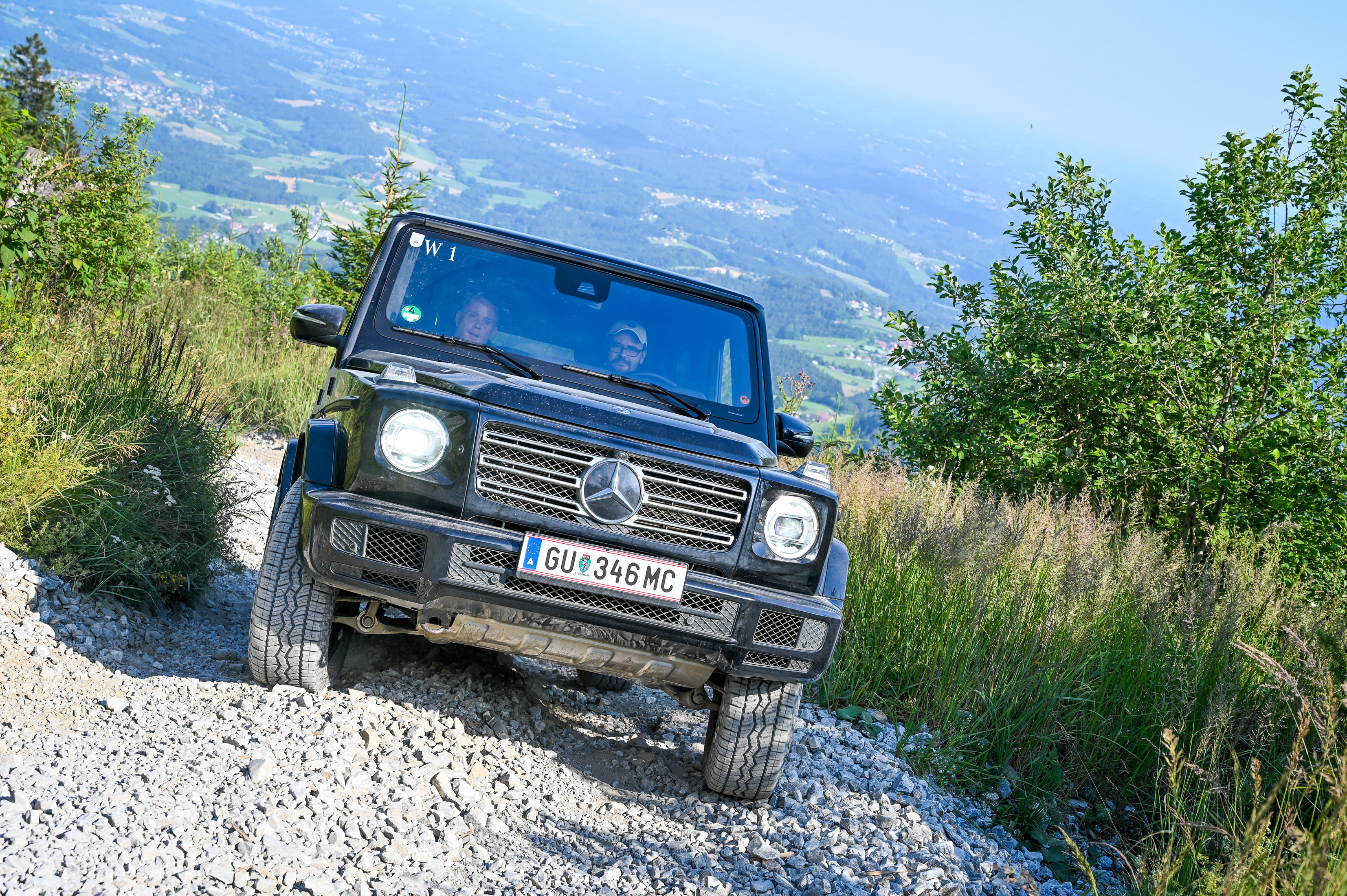 Mercedes ima nedaleč od Gradca, kjer v tovarni Magna-Steyr že 40 let izdelujejo razred G - ta je bil sprva puch G, ker ga je razvil Steyr Puch - v gorskem masivu Schöckl najeto celo pobočje planote. Tam kleni avtomobilski gorjan pokaže svoj pravi jaz. Več kilometrov zelo strmih kamnitih, blatnih vlak, gozdni makadami in vratolomne brežine ter prevoji - mučilnica za tehniko in mehaniko. Na teh poteh so do skrajnih obremenitev testirali čisto vsako generacijo in različico razreda G. Izkušeni testni vozniki tovarne tam stroju ne prizanašajo. Z novim G-jem so opravili 330 vzponov in spustov, ena ponovitev pomeni 10 kilometrov najtežjih terenov, ki jih brez reduktorja, diferencialnih zapor in zadostne oddaljenosti od tal sploh ni mogoče prevoziti.