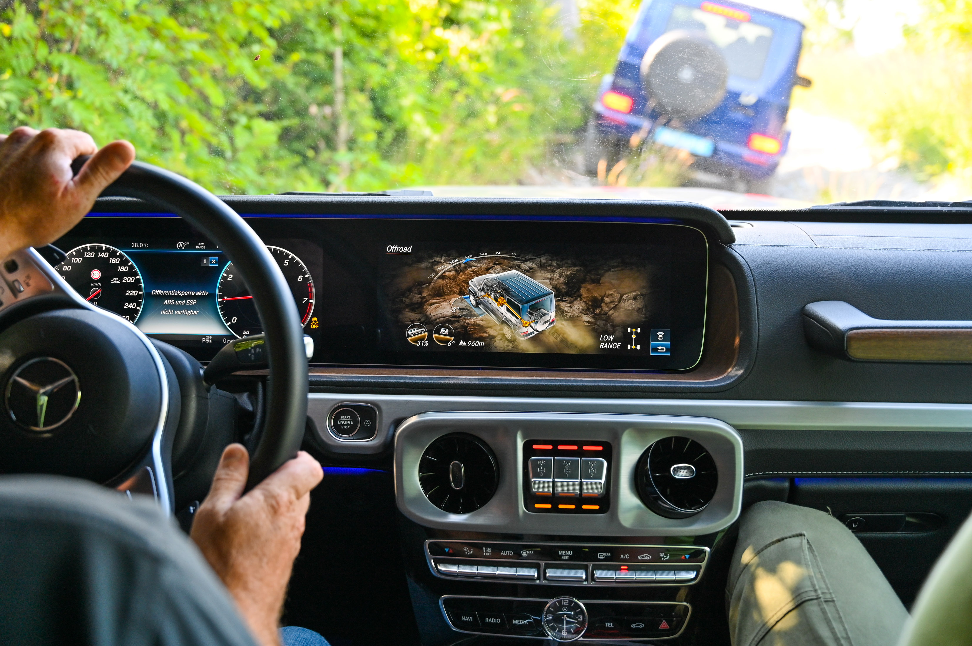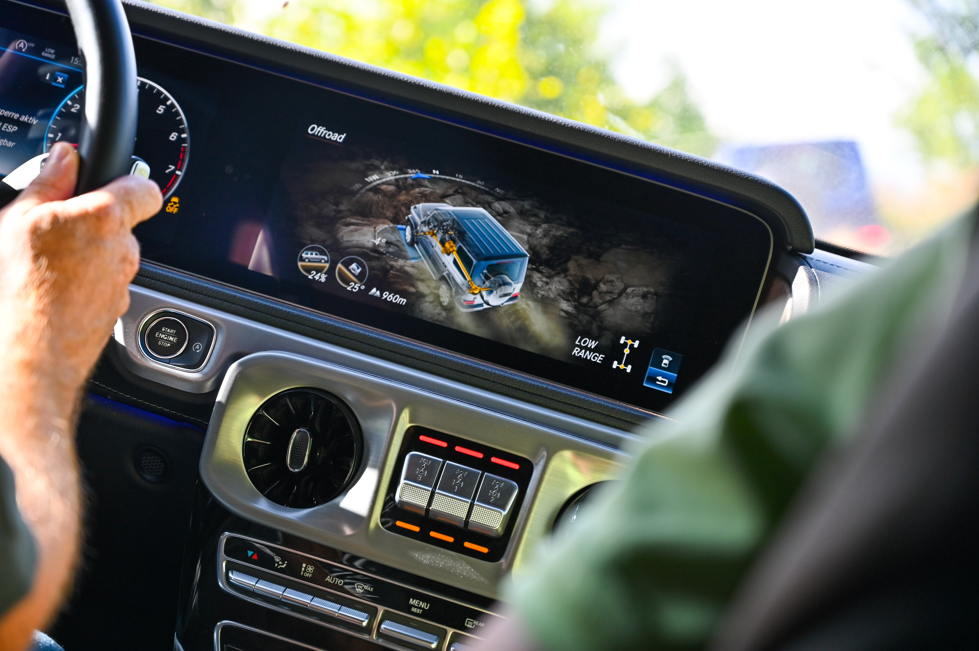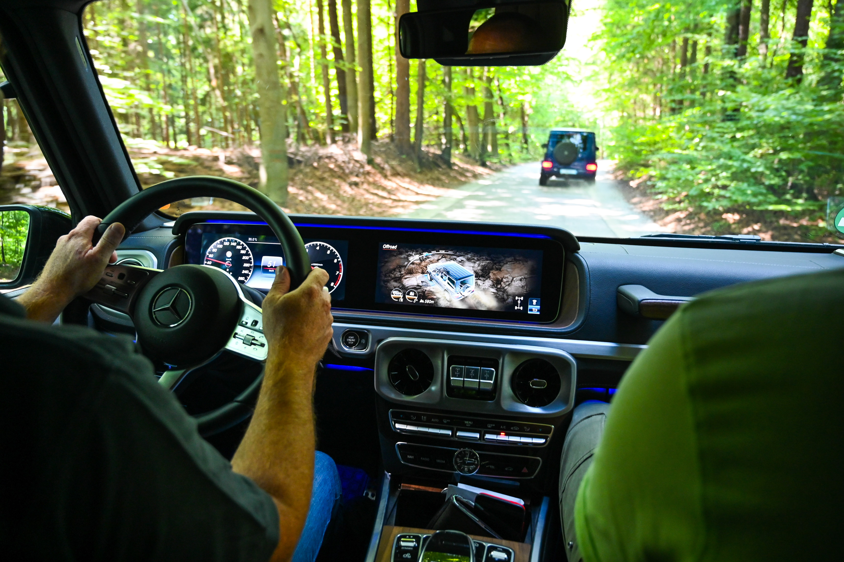 Največji preskok je novi razred G naredil pri voznih lastnostih na asfaltu, saj spredaj nima več toge preme, temveč posamično vpeta kolesa. Po vodljivosti in vozni dinamiki sicer ne ponuja toliko udobja kot ostali cestni terenci pod okriljem zvezde, a napredek je očiten pri vseh nalogah običajne mobilnosti v civilizaciji. Kleni gorjan je torej ohranil vso robustnost, le na asfaltu je postal precej bolj uglajen in preklemano hiter gornik. S svojimi elektronskimi čutili - radarji, kamerami, ultrazvokom - je postal najbolj varen in napreden G. Tudi glede digitalnih komunikacijskih sposobnosti je dobil vse, kar je na voljo v ostalih mercedesih, vključno z velikimi zasloni namesto klasičnih merilnikov in MBUX vmesnik, ki izpolnjuje voznikove želje na glasovni ukaz.