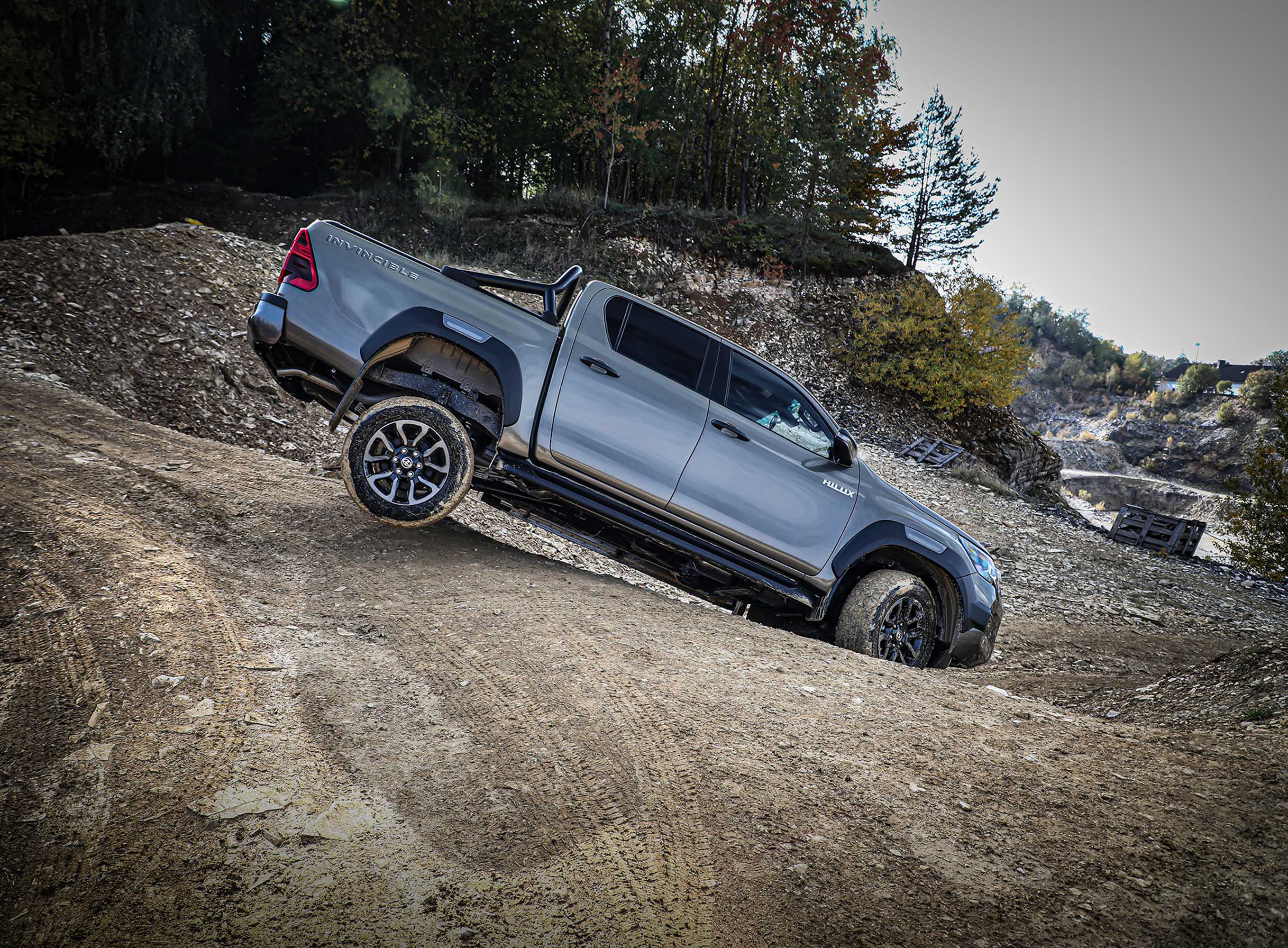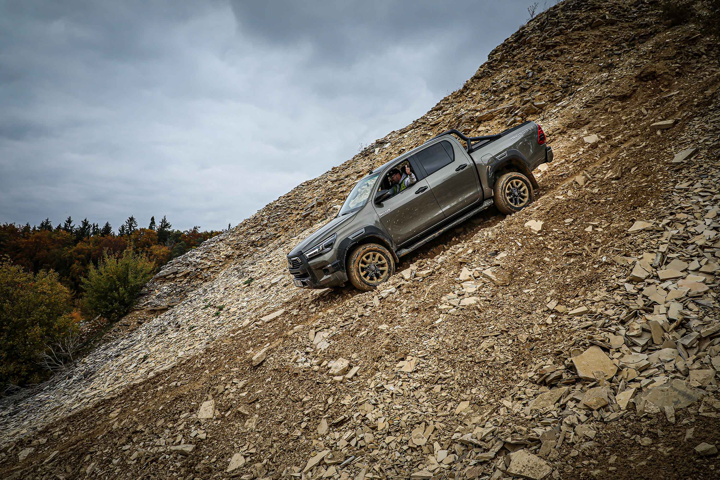 Na blatnem in kamnitem nemškem poligonu Langenaltheim smo se znova prepričali, da je toyota hilux še vedno eden najbolj zmogljivih, robustnih in klenih terencev. Na trasi, ki si jo je zamislil eden od načrtovalcev etap rallya Dakar, smo prevozili nekaj tako zahtevnih preprek, da so se nam na pogled zdele nepremagljive. Marsikdo se tudi peš ne bi sprehodil po brezpotju, ki smo ga preplezali s hiluxom. Terenska vožnja zahteva izkušnje, a jo hilux s svojimi terenskimi pomagali poenostavlja - na varen način. Prilagojen samodejni menjalnik z reduktorjem, mehanska zapora zadnjega diferenciala in sistem za nadzor hitrosti pri spustu po strmini poskrbijo za veliko varnosti in zanesljivega oprijema v zelo težkih razmerah. Voznik se lahko osredotoči na natančno delo z volanom in iskanje prehodov. Avto na terenu blesti in vozniku vliva veliko samozavest. Poleg pogona mu suverenost zagotavlja še velika oddaljenost od tal. Ta glede na izbrano različico znaša od 29,3 pa vse do 31 cm. Tudi zaradi tega zmore 532,5 cm dolg velikan z dobrimi tremi metri medosne razdalje in zajetnim previsom nad zadnjo osjo prevoziti na terenu 31 stopinjski vstopni in 26 stopinjski izstopni kot ter zabresti v 70 cm globoko vodo.
