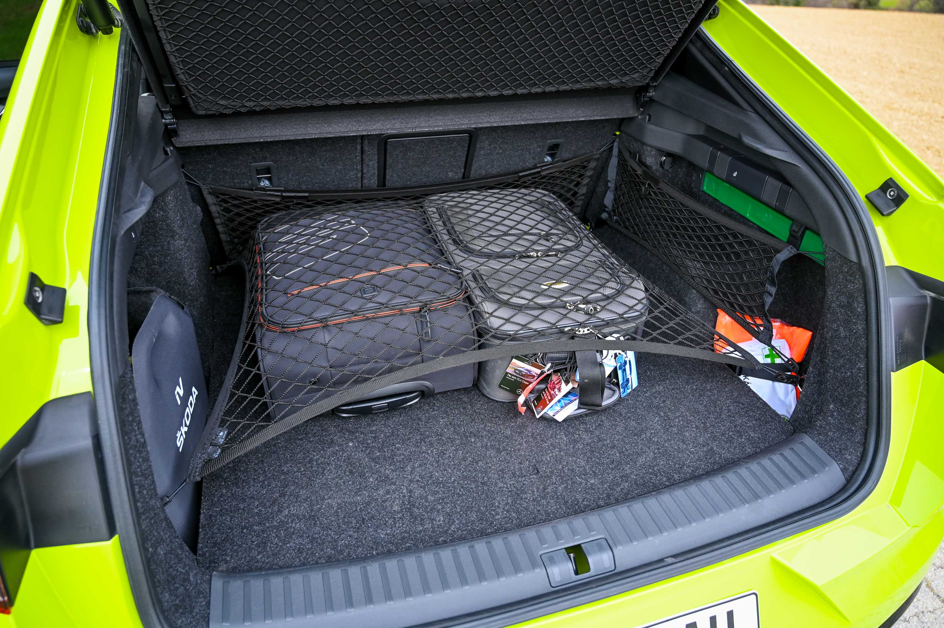 Prvi električni Škodin športnik kljub elegantni bočni silhueti in padajoči strešni liniji, ki se izteče v oster rob velikih prtljažnih vrat, v kabini ne ponuja nič manj prostora od enyaqa, prtljažnik pa je izgubil zanemarljivih 15 litrov in še vedno ponuja prepričljivo 570-litrsko družinsko uporabno prostornino ter enostaven dostop zaradi velikih električnih dvižnih vrat. V nobenem kupeju te velikosti zadaj še nismo sedeli tako udobno.