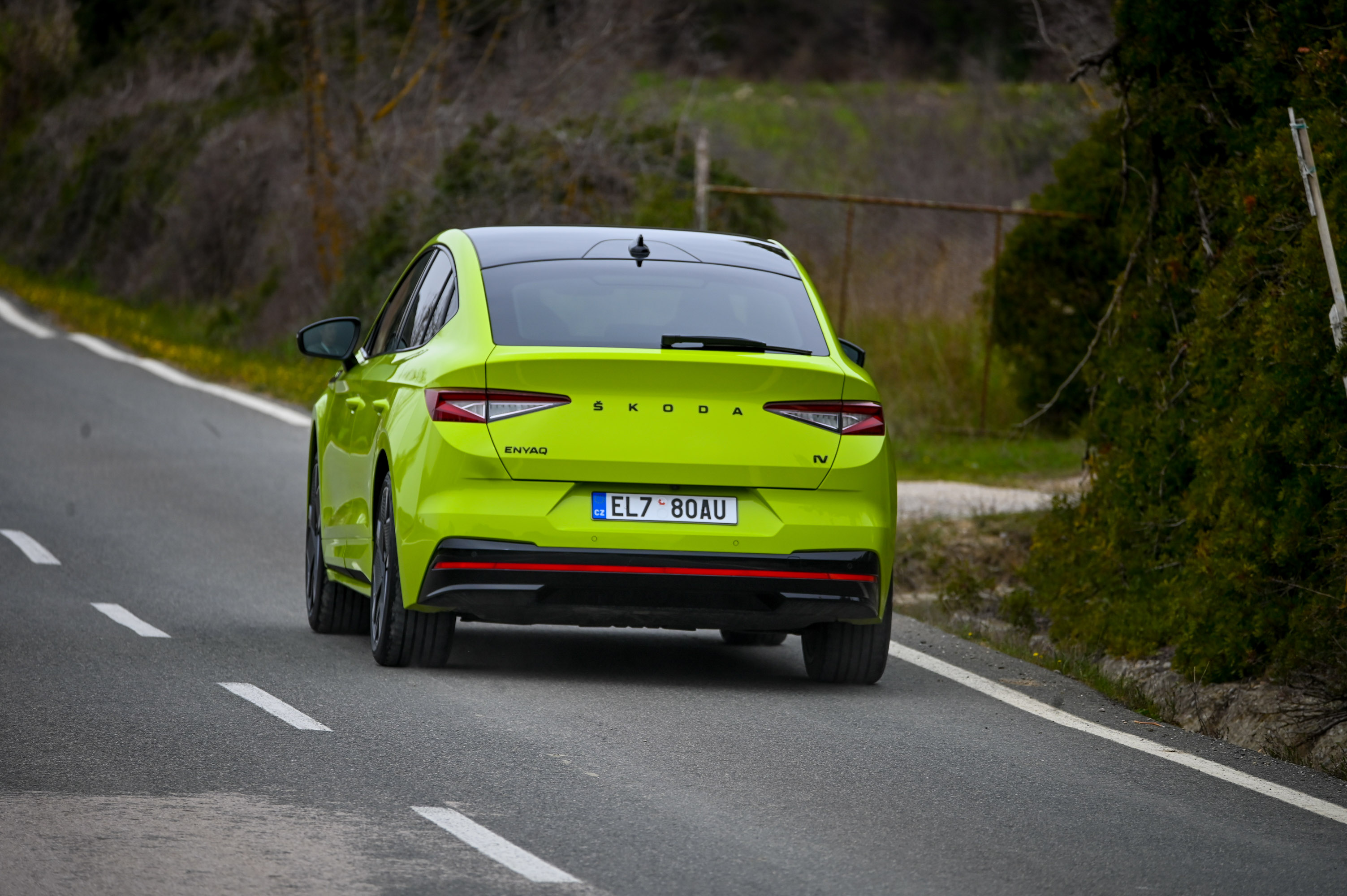 Najpomembnejši del športnega avtomobila predstavljata pogon in podvozje. Škoda enyaq coupe RS iV po voznih lastnostih ni čisto pravi športnik, ampak predvsem uglajeno hiter električni avto. Dva motorja na vsa štiri kolesa sicer pošiljata zajetno moč 220 kW in 460 Nm navora, a avto ne pospešuje tako silovito kot denimo Teslini avtomobili. Avto ima veliko oprijema in celo na makadamu z mesta spelje zelo suvereno. Serijsko športno podvozje s prilagodljivim blaženjem se trudi zabrisati vpliv mase, a na številnih prevojih in neravninah cest med toskanskimi griči je bilo hitro jasno, da je 2740 kg, kolikor s potniki in prtljago lahko največ tehta enyaq coupe RS iV, preveč za pravo, dirkaško natančno vozniško izkušnjo. Ne pelje se tako suvereno, kot je videti, je pa še vedno hiter in presenetljivo udoben avto.