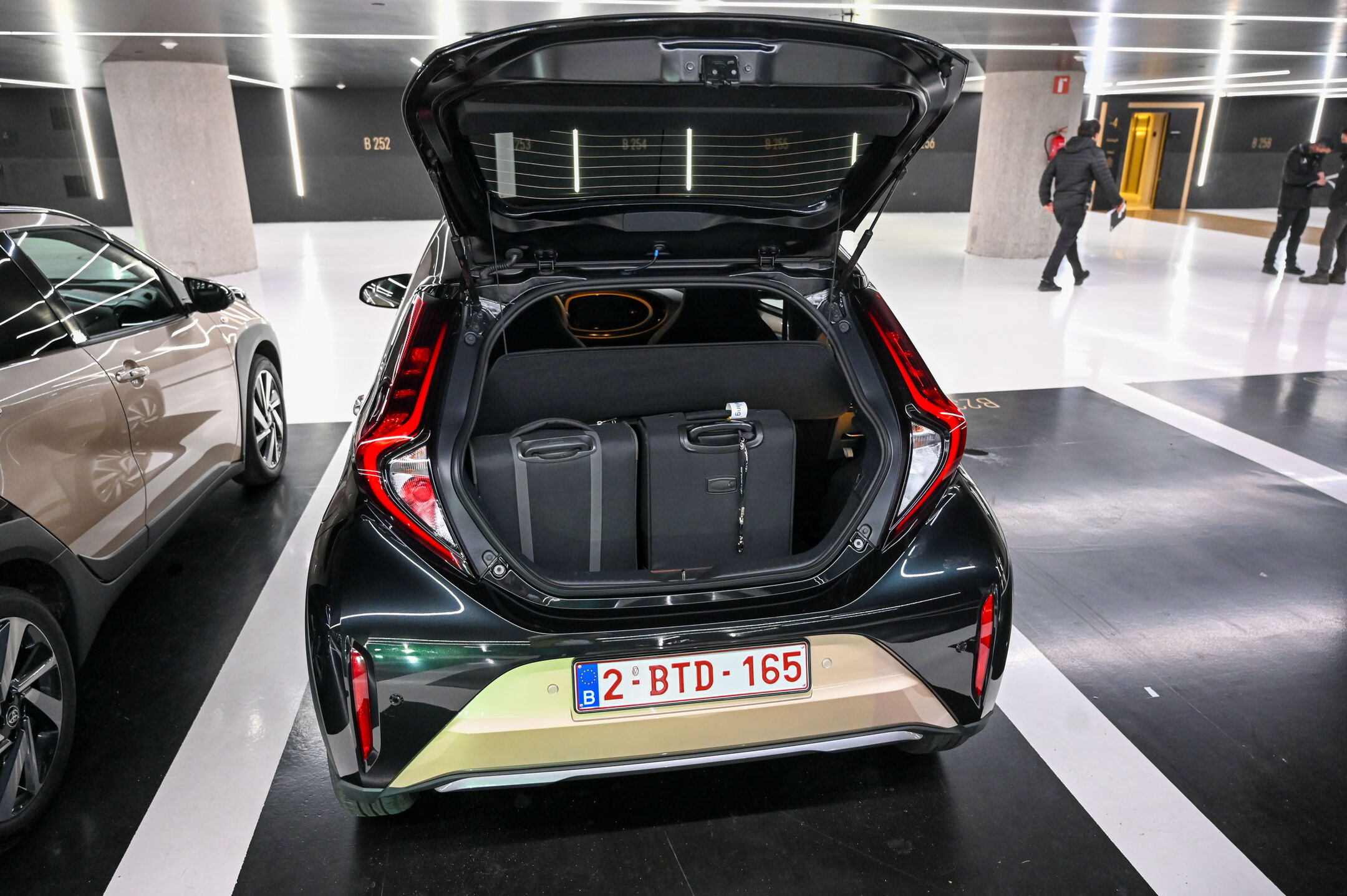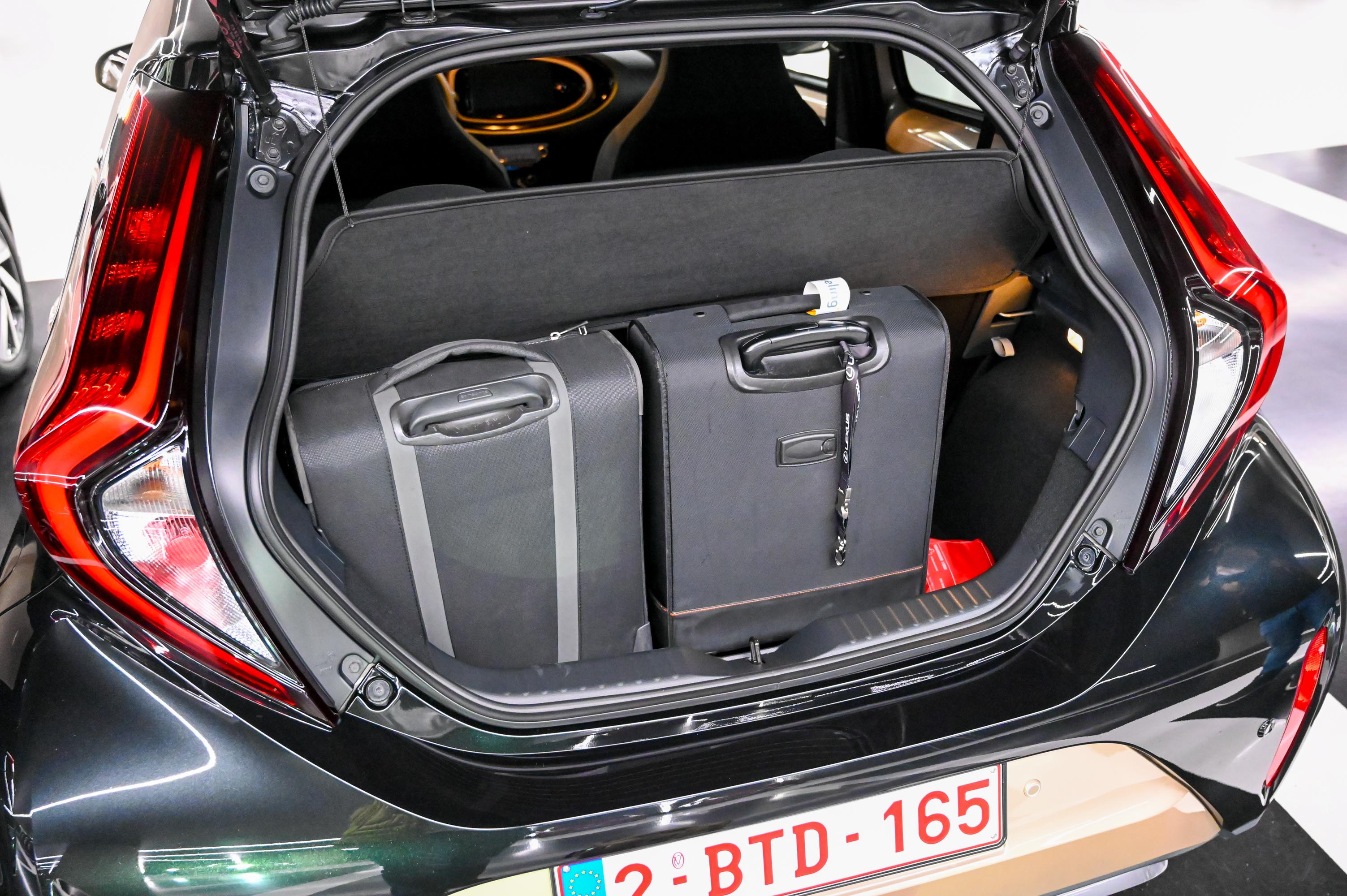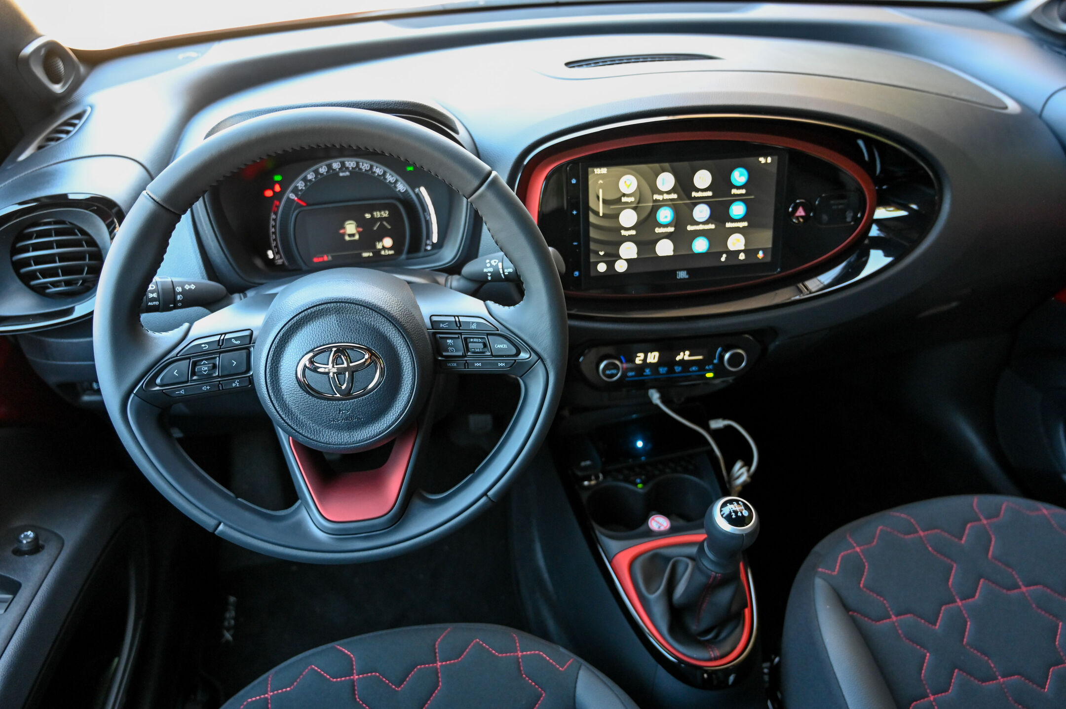 V primerjavi z nekaterimi tekmeci, kot sta suzuki ignis in VW up, je aygo X manj prepričljiv s prostorom na zadnji klopi. Kljub panoramski strehi z izboklinami zadaj hitro zmanjka prostora nad glavami in dobrega 2,4 metra dolga medosna razdalja bi potrebovala še kakšen centimeter za kolena. V kabini izstopa nov 9-plačni multimedijski vmesnik, ki seveda omogoča vse sodobne digitalne veščine.