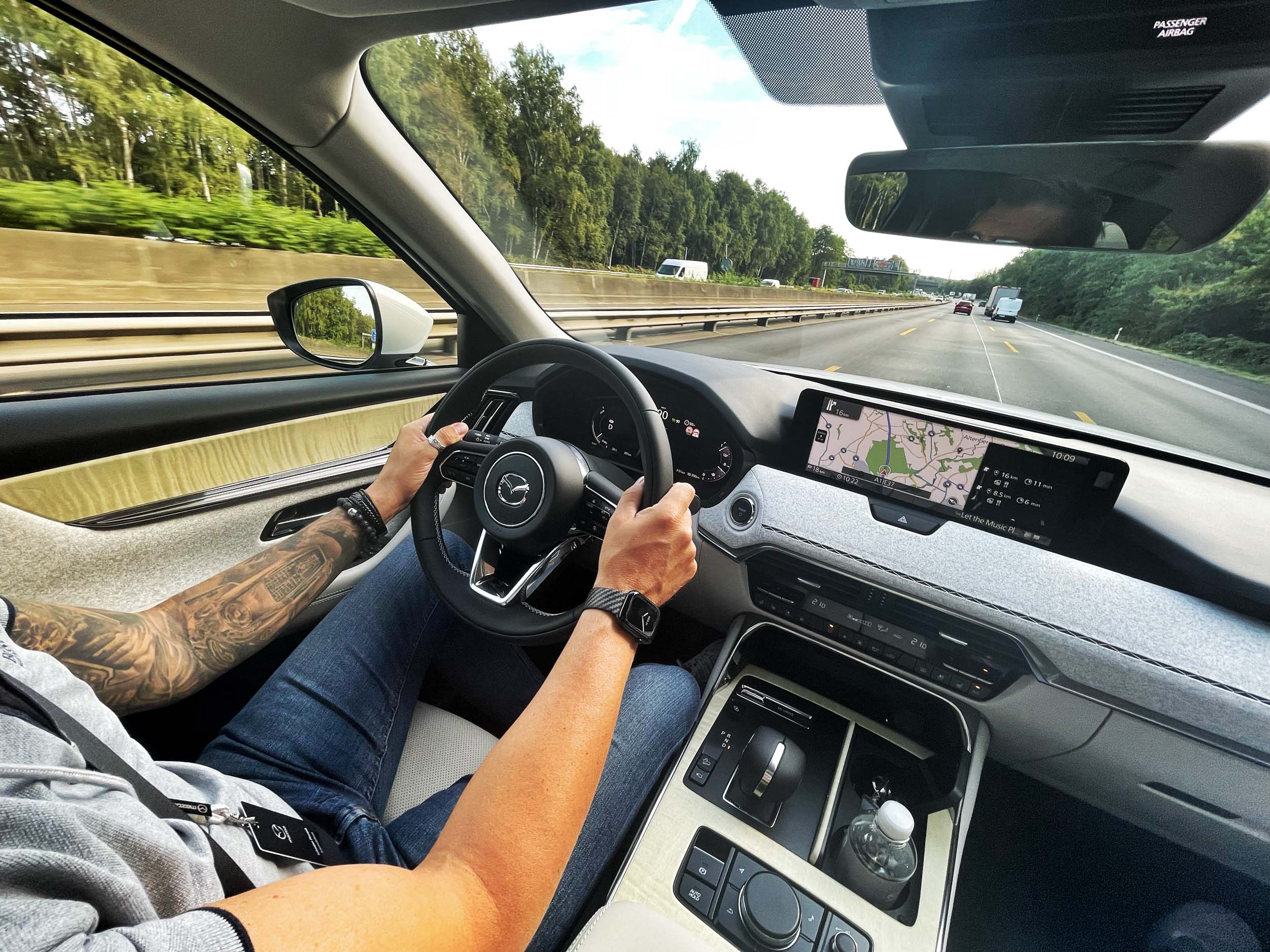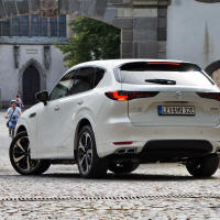 Zelo široka sredinska konzola med prednjima sedežema je prijetno uporabna, opozarja pa na zasnovo avtomobila z vzdolžno postavljenimi motorji spredaj in osnovnim pogonom na zadnji kolesi - pod široko sredinsko konzolo je kardanska gred za pogon zadnjih koles. Priključno-hibridni CX-60, kakršnega smo vozili tokrat, ima mehanski štirikolesni pogon s sredinsko večlamelno sklopko, ki deli navor med oba kolesna para v vseh voznih režimih - tudi povsem električnem. Priključno-hibridni pogonski sklop je prvi te vrste v Mazdinih avtih. Gre za kombinacijo 2,5-litrskega bencinskega štirivaljnika, električnega motorja, akumulatorskega sklopa s 17,8 kWh in tehnično inovativnega 8-stopenjskega samodejnega menjalnika. Ta namreč nima običajnega hidravličnega pretvornika navora, pač pa ima večploščno sklopko v oljni kopeli, ki je na drugi strani povezana z električnim motorjem. Ta deluje tudi kot generator, vse skupaj pa daje kar 241 kW (327 KM) sistemske moči in 500 Nm sistemskega navora. Nič čudnega, da je takšen CX-60 najzmogljivejša mazda doslej: do 100 km/h rabi le 5,8 sekunde, najvišja hitrost - ki jo na nemških avtocestah dosežemo zelo hitro - pa je omejena na 200 km/h. Menjalnik odlikujejo zelo hitra pretikanja, sicer pa voznik lahko izbira med različnimi voznimi programi - od športnega, električnega, terenskega do programa za vleko prikolice (do 2,5 tone). Zgolj na elektriko pri Mazdi obljubljajo doseg več kot 60 kilometrov, sicer pa oba motorja dobro sodelujeta: na preskusni vožnji po (hitrih) nemških avtocestah in podeželju je bila povprečna poraba goriva na 100 km približno 5 l in 24 kWh.
