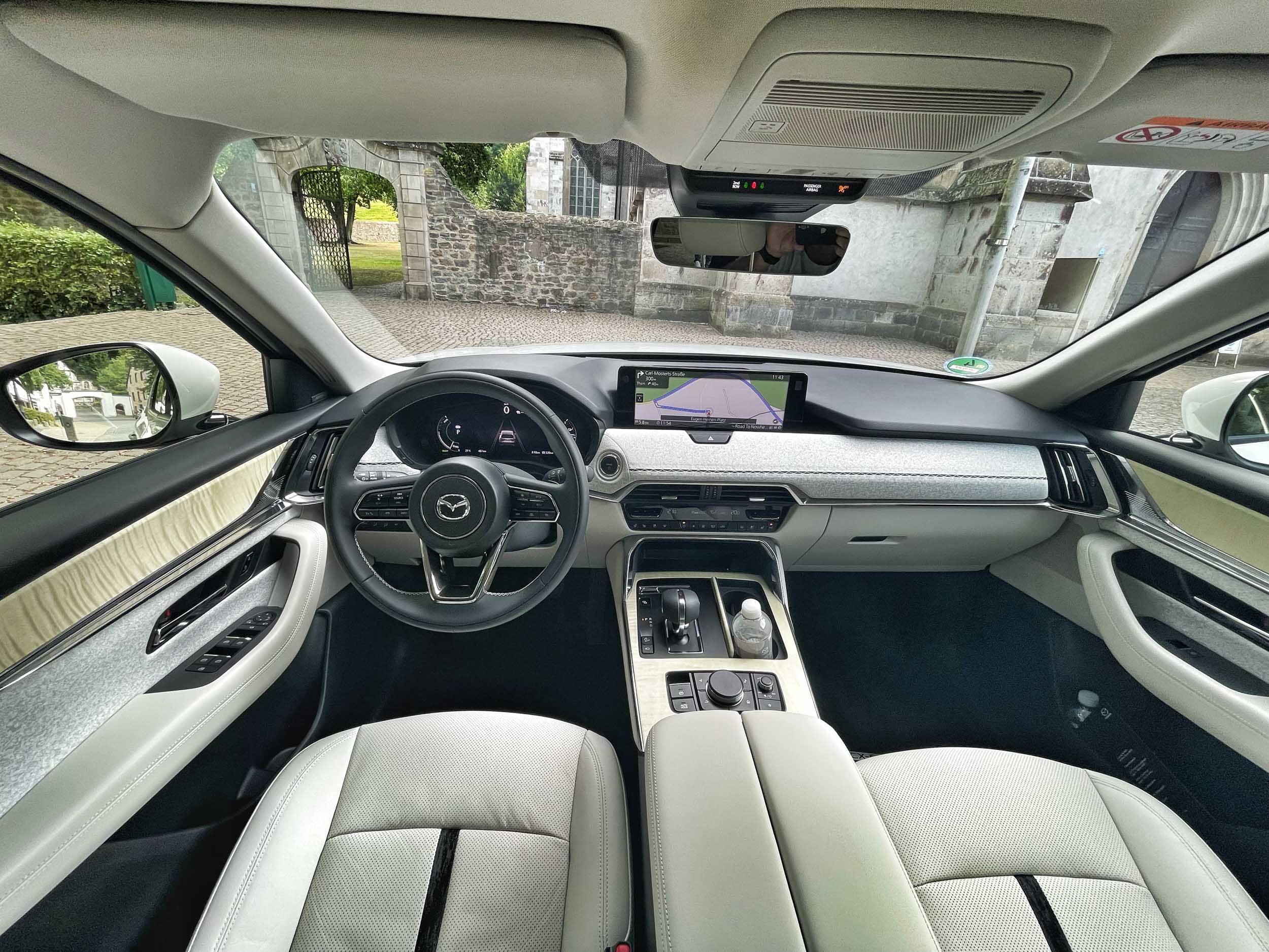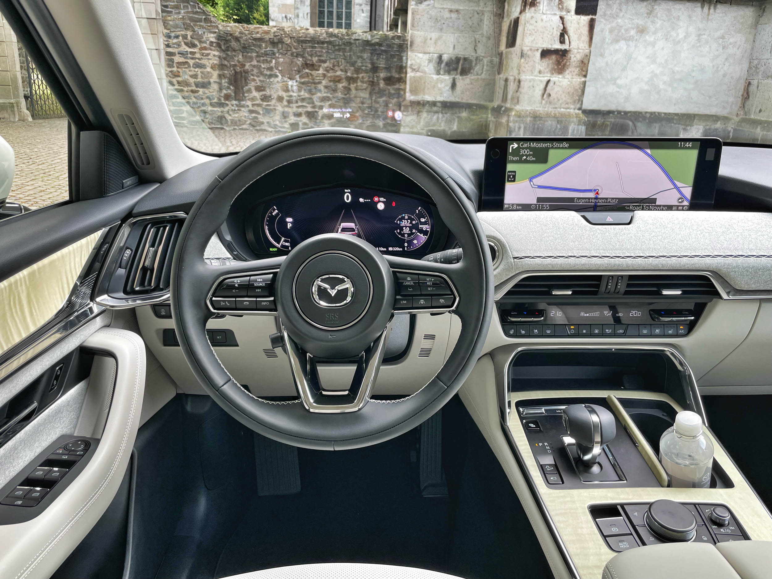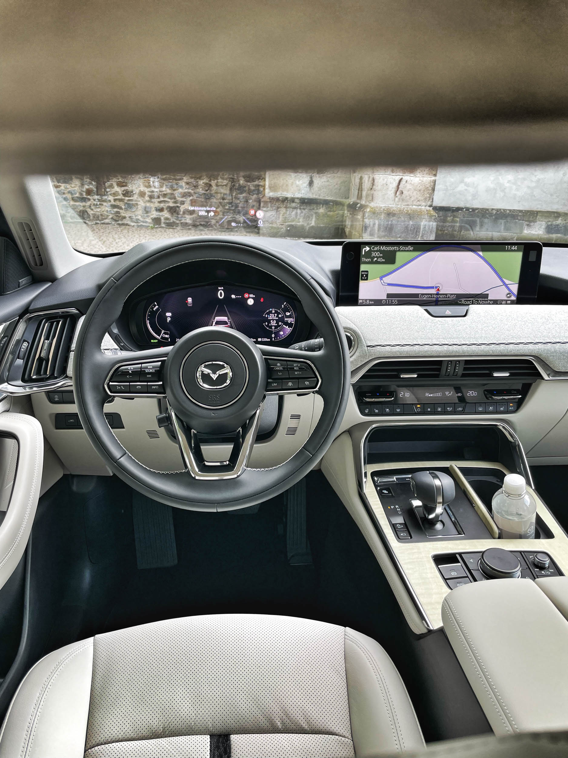 Primerjava z zvenečimi tekmeci je še kako na mestu, ko prvič sedemo v avto. Del Mazdinega oblikovalskega jezika Kodo je namreč tudi uporaba žlahtnih materialov, kakršni so les, usnje in kovina, v nekaterih različicah opreme pa se jim pridružuje tudi tkanina, iz kakršne so sešiti tradicionalni japonski kimoni. Ob vrhunski izdelavi je vrhunsko tudi počutje v avtu, dodajamo pa še eno pohvalo: Mazda je eden redkih avtomobilskih izdelovalcev, ki se ni spustil v tekmo za čim večje in na dotik občutljive zaslone. Tako kot v ostalih mazdah je tudi pri CX-60 zaslon infotainment naprave nameščen visoko na armaturni plošči in daleč od rok, saj z njim upravljamo prek vrtljivega stikala na sredinski konzoli. Da je to najvarnejši način upravljanja, smo dokazali v primerjavi, ki smo jo objavili v prejšnji številki Motorevije. Ob tem velja omeniti še eno novost: CX-60 ima povsem digitalno instrumentno ploščo, seveda izdatno prilagodljivo in dobro čitljivo.