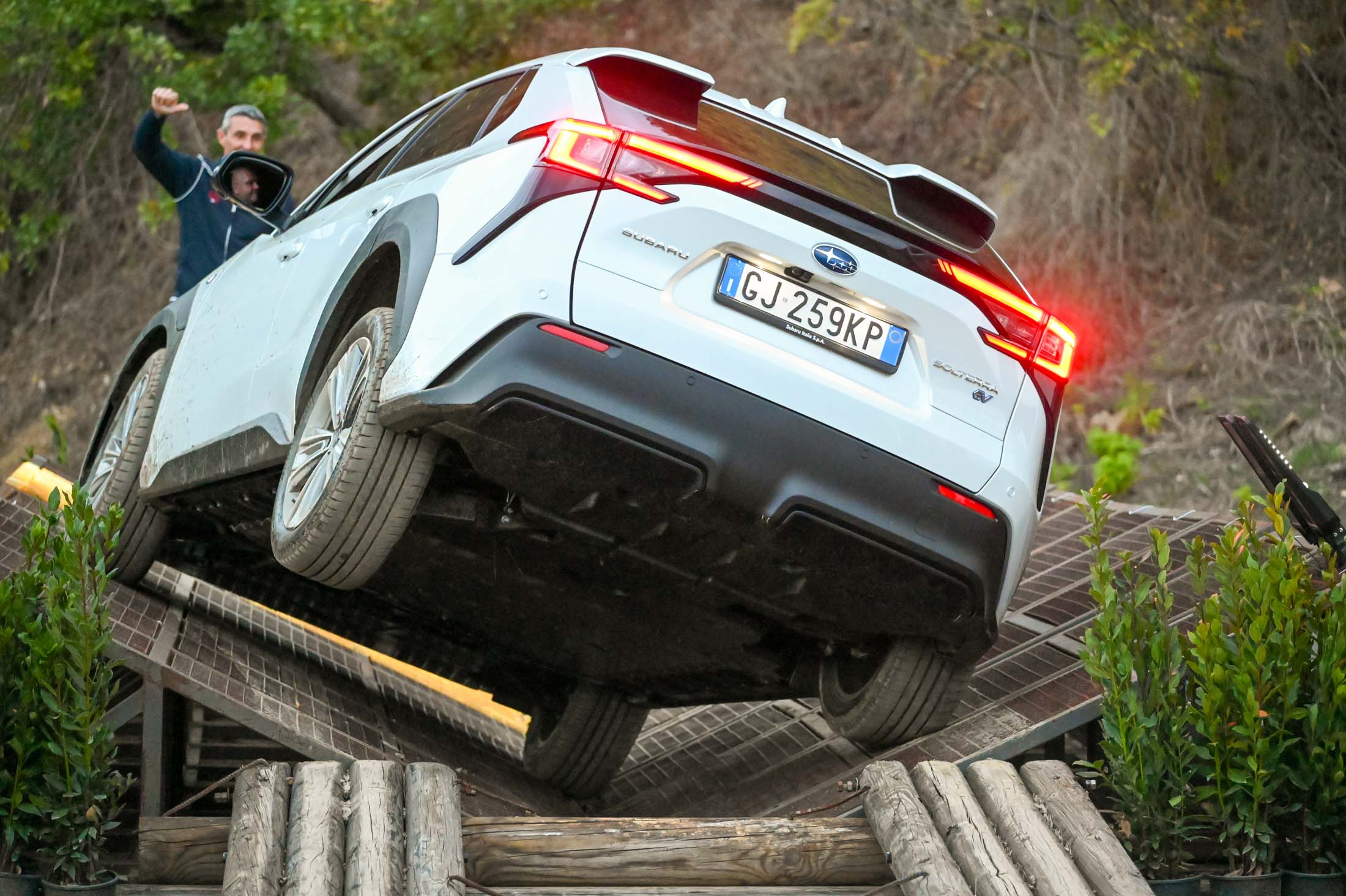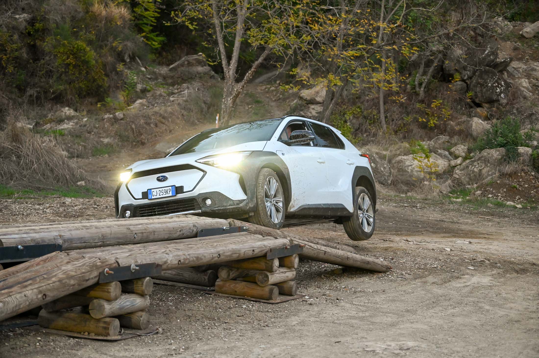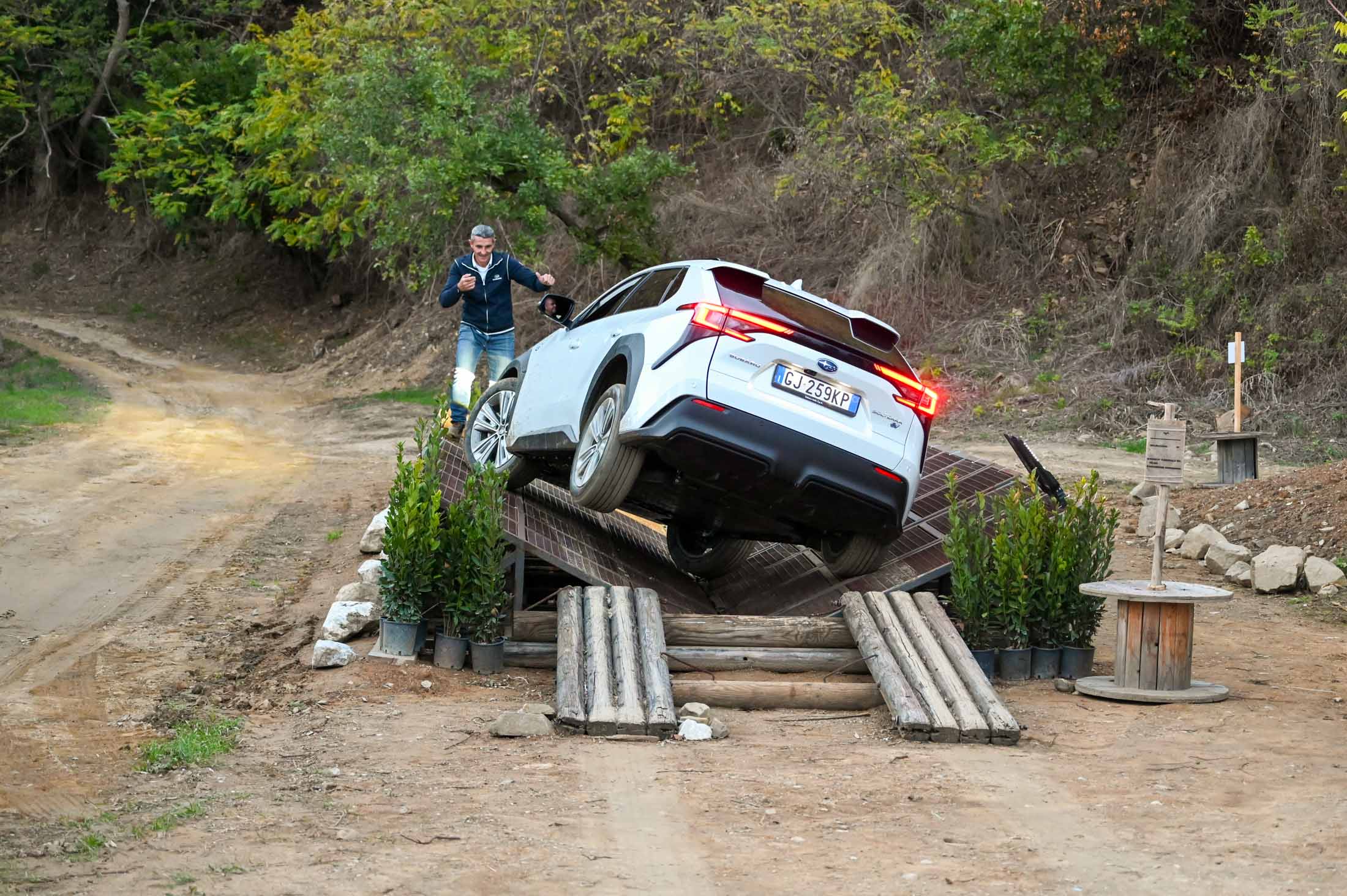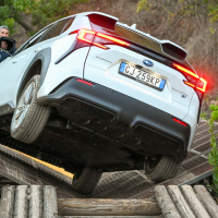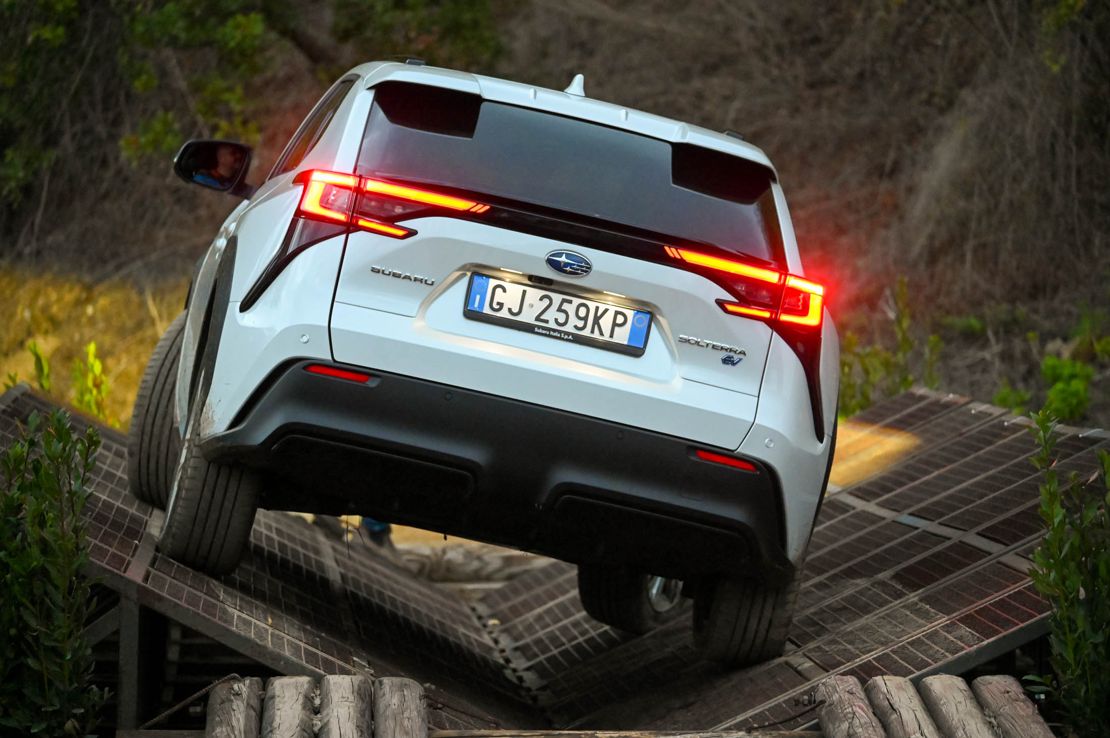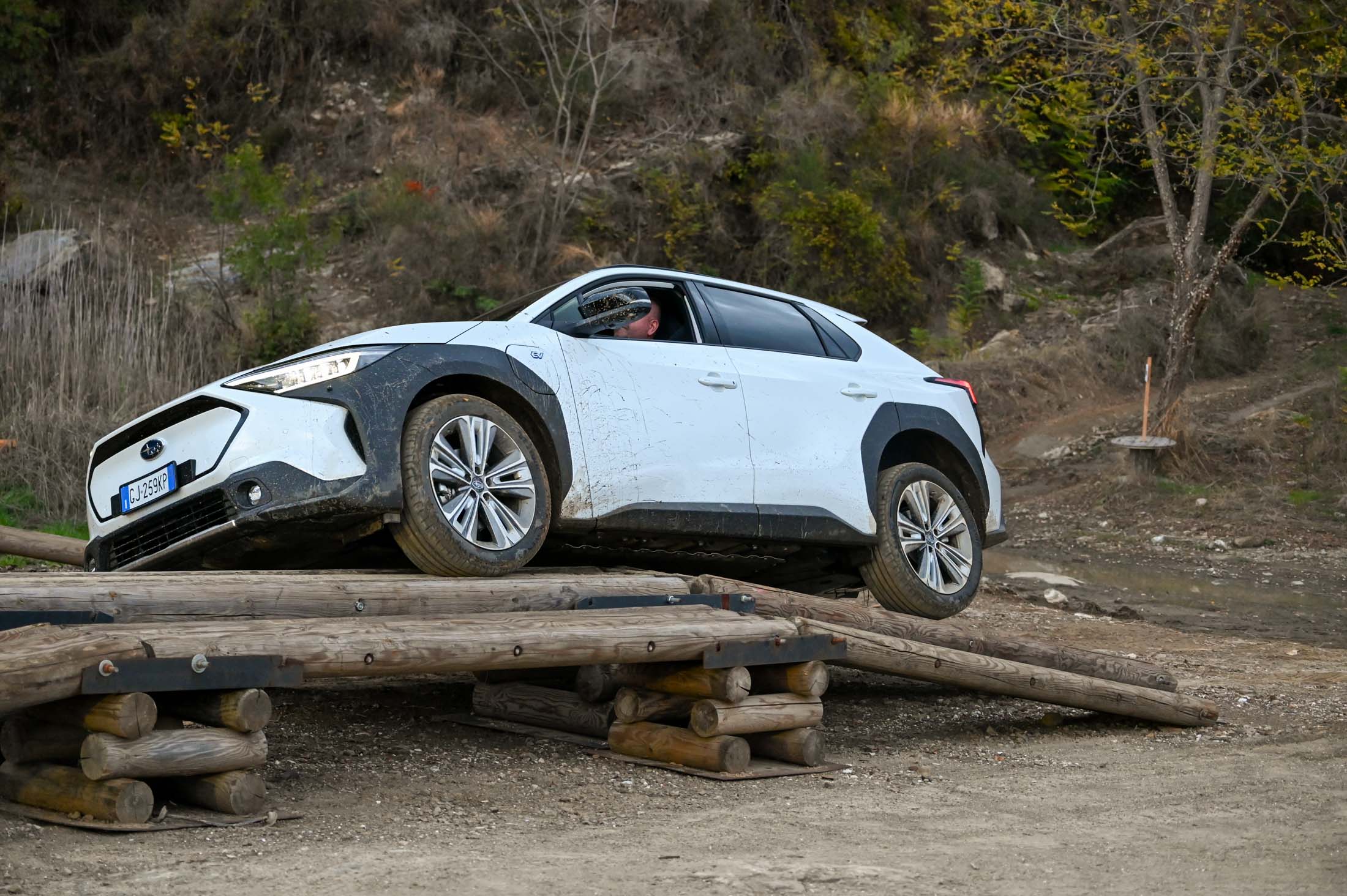 Glede na dejstvo, da z nobenim električnim avtomobilom doslej nismo prevozili tako zahtevnih tehničnih ovir in strmih blatnih grap, lahko zapišemo, da novi električni križanec res ni “le” toyota, ampak tudi pravi subaru. Solterra je na razmeroma zahtevnem poligonu Subarujeve vozniške akademije z znanim X-mode sistemom za nadzor oprijema v blatu, pesku, snegu in strmini brez težav zagotavljala oprijem in zanesljivo plezala preko tehničnih ovir, ki so vključevale tudi plazenje, pri katerih samo dve kolesi diagonalno spredaj in zadaj obdržita stik s podlago. Nadzorna enota odlično krmili oba električna motorja in brez mehanske povezave med prednjim ter zadnjim kolesnim parom suvereno poskrbi za simetrično razporejanje navora oziroma do 160 kilovatov moči. Zelo dobro so na terenu izkoristili tudi prednosti rekuperacijskega zaviranja, saj so avtu dodali stikalo, s katerim pri vklopljenem sistemu za spust po strmini voznik določa stopnjo pomoči pri zagotavljanju oprijema. Da ne gre za povsem običajen električni avtomobil, solterra dokazuje tudi s svojo terensko 21-centimetrsko oddaljenostjo od tal.