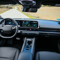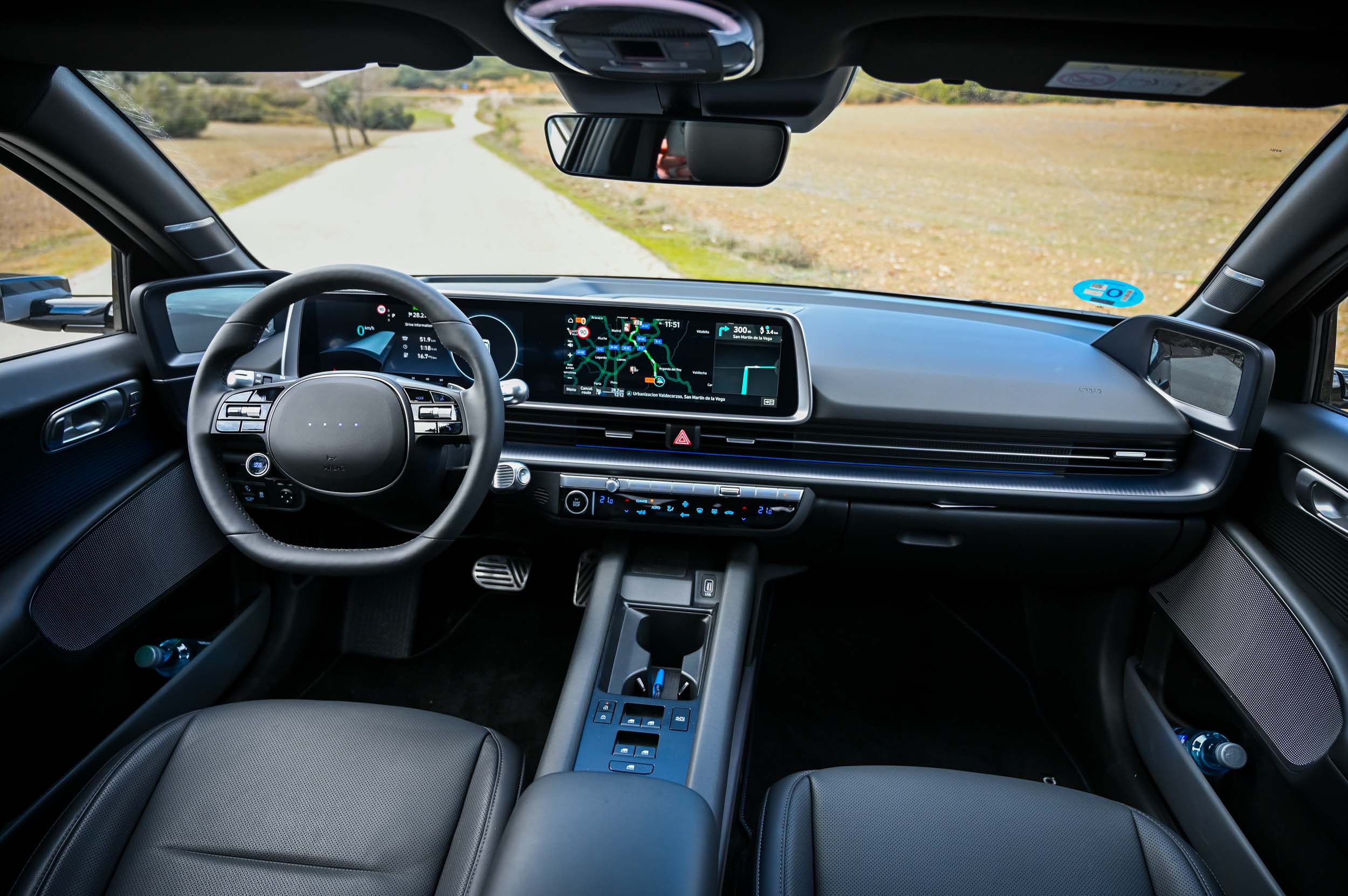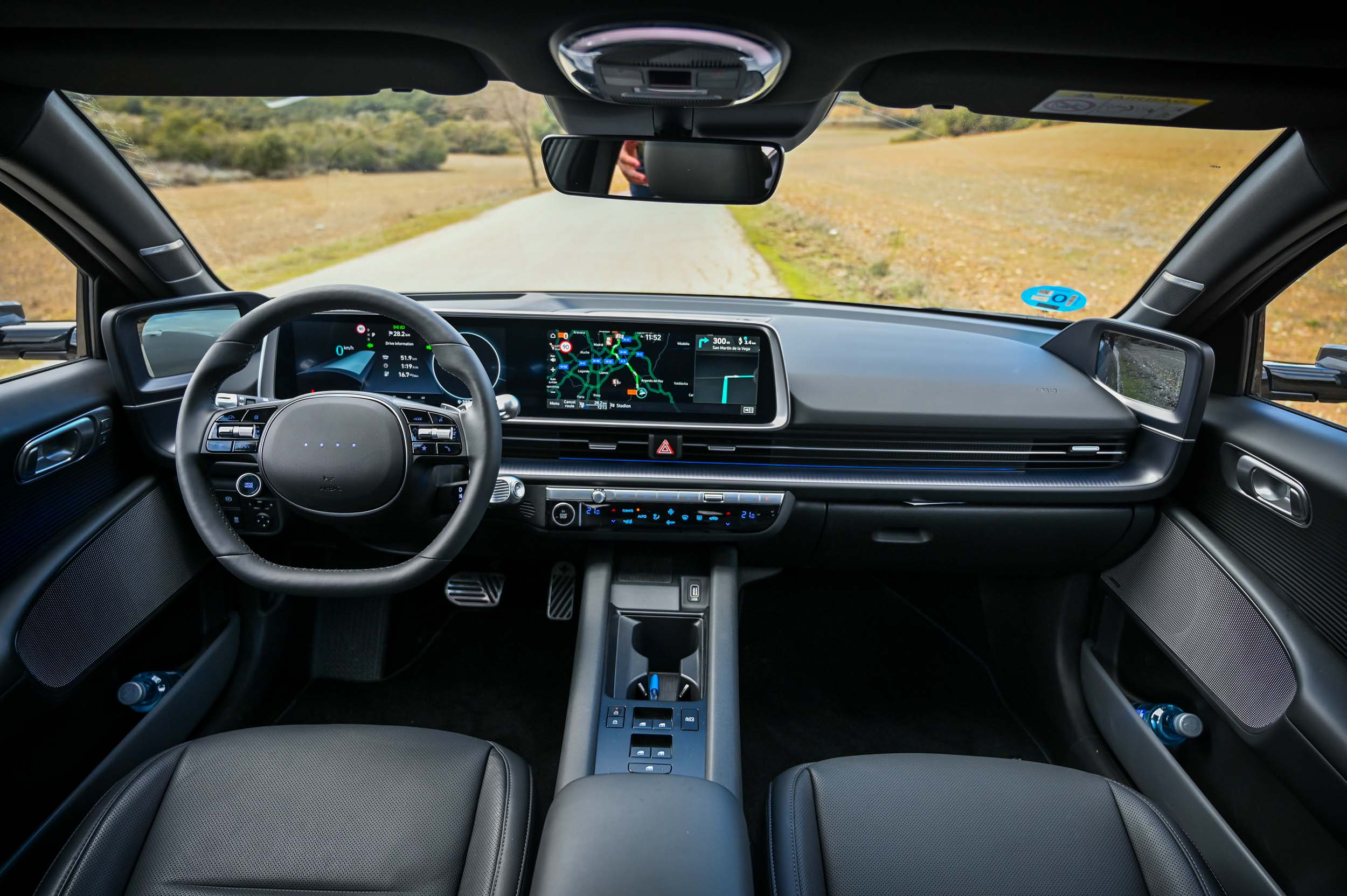 Oblikovalci so odlično izkoristili skoraj tri metre (295 cm) dolgo medosno razdaljo E-GMP platforme. Kabina je kljub nizki strešni liniji zelo prostorna, saj je na zadnjo klop brez težav sedel tudi naš 195-cm visok novinarski kolega. Široka, pregledna in zelo kakovostno izdelana armaturna plošča ima kar štiri digitalne zaslone. Ob obeh prednjih stebričkih na robu armaturne plošče sta nameščena še bočna zaslona, kjer ima voznik vseskozi širokokotni pogled na dogajanje ob obeh bokih avta, ki ga zunaj zajemata kameri namesto zunanjih vzvratnih ogledal. Preglednost je boljša kot v Audijevem e-tronu, saj je treba pogled na oba zaslona usmeriti tja, kot smo ga vozniki vajeni. Poleg tega pa oba zaslona prikazujeta tudi mejo kritične oddaljenosti pri menjavi pasov, ko se od zadaj približuje drugo vozilo.