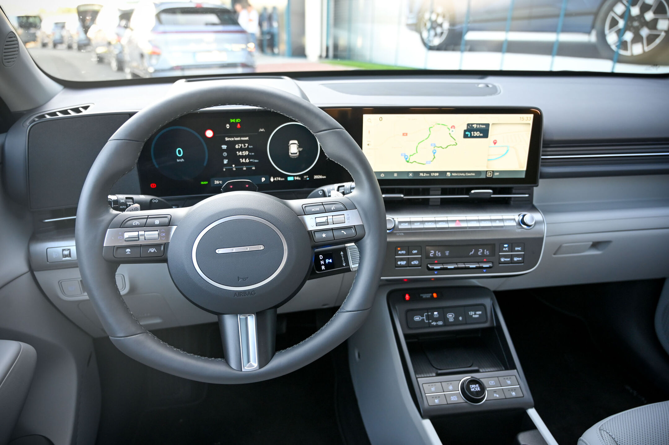 Pohvaliti velja tudi zelo kakovostno izdelano in pregledno kabino. Ob vsem digitalnem napredku, ki vključuje dva odlično pregledna, v rahlem loku postavljena 12,3 palca velika zaslona z izdatno zalogo podatkov in vsemi sodobnimi komunikacijskimi funkcijami ter storitvami na daljavo, so na armaturni plošči obdržali tudi analogna stikala za vklop najpomembnejših funkcij, povezanih v vožnjo ali udobjem. Kona je tako digitalno sodoben, a prijazen avto, v katerem se bodo precej domače počutili tudi bolj analogni vozniki. Sistem Bluelink je enostaven za uporabo, izbirniki so slovenski in vsa programska oprema, vključno z zemljevidi za navigacijo, se posodablja “po zraku.” Uporabna novost je digitalni ključ z dodatnima dostopoma, ki omogoča odklepanje s pomočjo pametnega telefona ali pametne ure (apple, google in samsung).