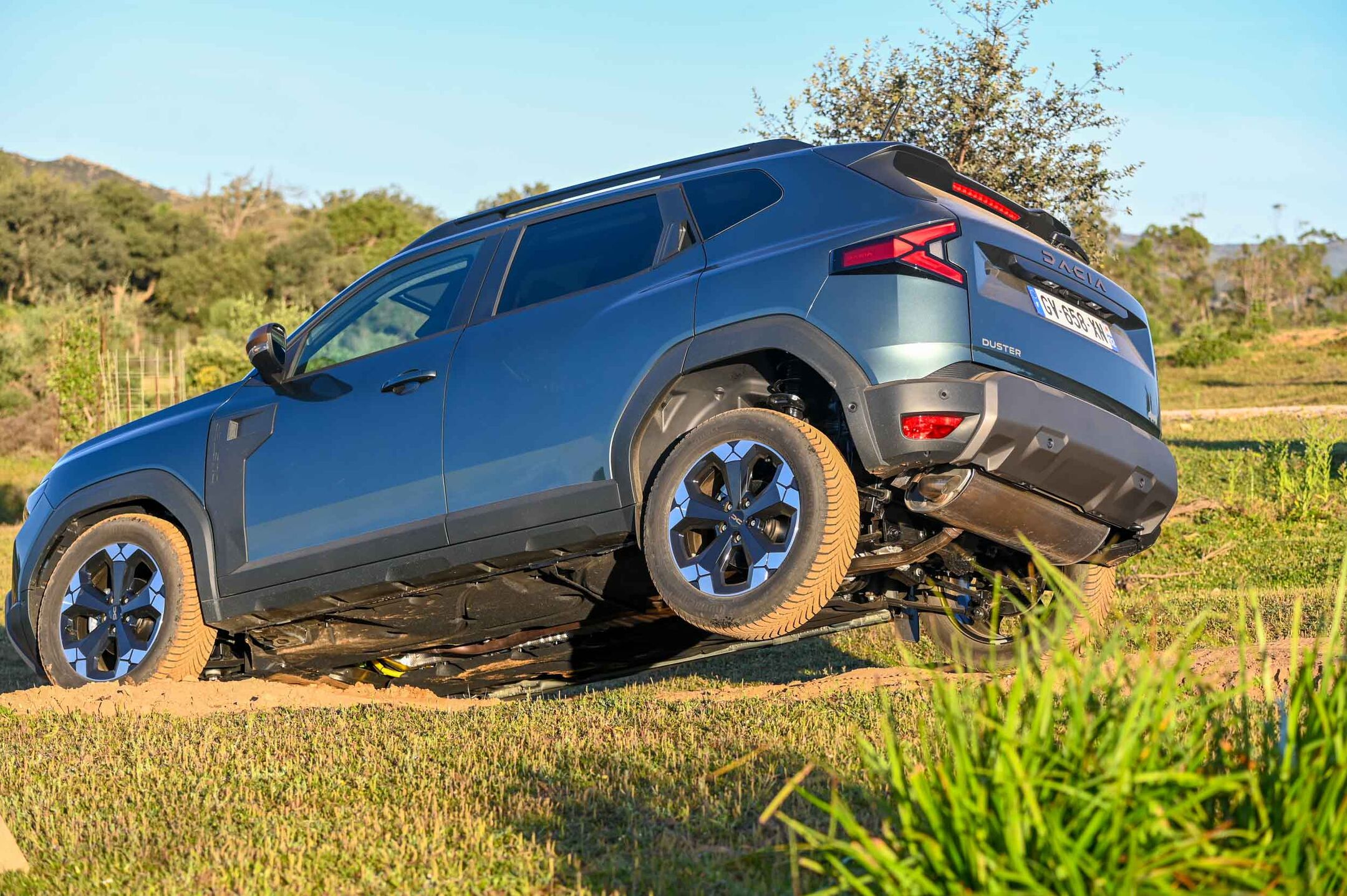 Pri oblikovanju smo že omenili kratke previse, ki mu poleg velike oddaljenosti od tal pomagajo pri plezanju preko tehnično zahtevnih ovir na terenu. Njegov vstopni kot znaša 31° izstopni kot pa 36°. Suverenost na terenu oziroma zahtevnem brezpotju podčrtuje še z bočnim naklonom do kota 24°. Na osrednjem 10-palčnem in podatkovno bogatejšem in uporabniško odzivnejšem zaslonu je vozniku pri “plezanju” v pomoč še terenski prikaz bočnih kamer, merilniki bočnega in vzdolžnega naklona ter prikaz razporeditve navora med prvo in zadnjo osjo. Prepričani smo, da bo novi duster brez težav nadaljeval službovanje v zahtevnih službah pri gorskih reševalcih, gasilcih, gozdarjih …