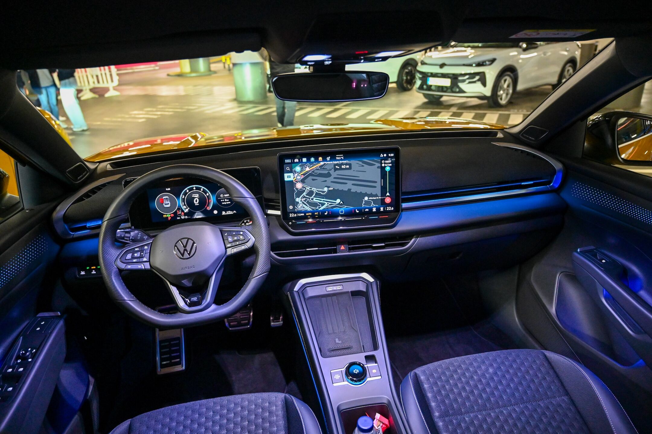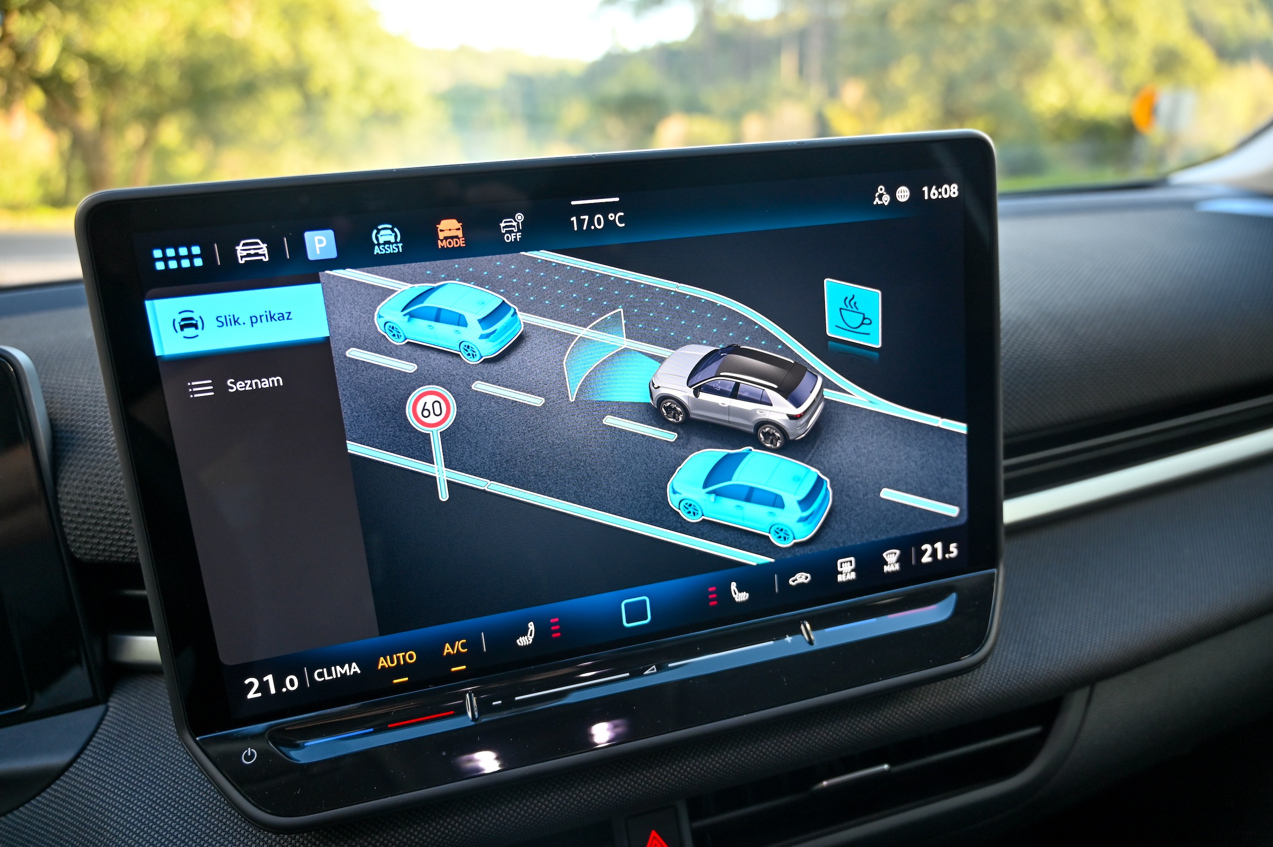 Ko smo sedli za volan novega T-roca, je bilo hitro jasno, da so pri Volkswagnu resno vzeli kritike javnosti na račun v prvo generacijo T-roca vgrajenih materijalov; zdaj na armaturni plošči ni več trde plastike, gornji del je po novem celo odet v tkanino, na voljo pa je tudi tripodročna samodejna klimatska naprava. Vse skupaj je oplemeniteno še z ambientalno osvetlitvijo, ki omogoča različne barvne kombinacije, spreminjajoče se celo glede na počutje voznika oziroma slog negove vožnje. Ergonomsko je voznikov delovni prostor brezhiben, podatkovno pa seveda povsem digitaliziran; 10-palčni zaslon omogoča različne prikaze podatkov, osrednji 12,9-palčni zaslon visoke ločljivosti, ki je na voljo že v opremskem paketu life, pa ponuja vse sodobne digitalne storitve, vključno s še bolj logično urejenimi slovenskimi izbirniki in slovenskim glasovnim navigacijskim vodenjem.