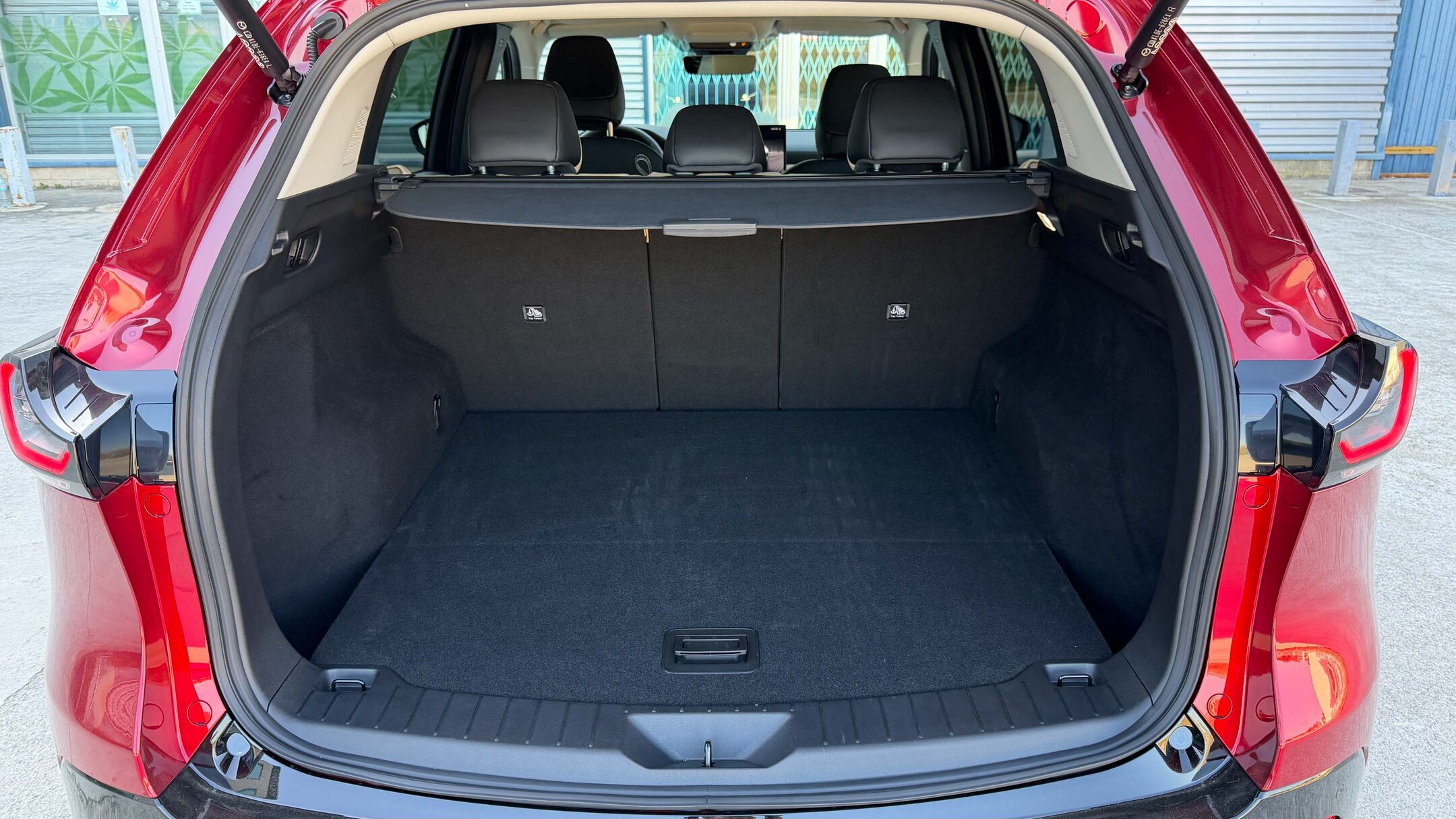 Da je CX-5 v novi generaciji precej zrasel, se na prvi pogled ne vidi, a v resnici je s 469 centimetri le še pet centimetrov in pol krajši od CX-60 iz razreda višje. V primerjavi s predhodnikom so ga podaljšali za 11,5 centimetra – natanko za toliko, kolikor so mu podaljšali medosno razdaljo. Hkrati je tudi za 1,5 centimetra širši in za 3 cm višji kot prej, ves centimetrski prirastek pa je namenjen prostoru v kabini in prtljažniku. V centimetrih to pomeni 6,4 centimetra več prostora za kolena zadaj, po občutku pa je zračnost zadnje klopi še večja, nedvomno tudi zaradi treh dodatnih centimetrov za glave potnikov. K udobju veliko pripomoreta tudi večja odprtina vrat zadaj in skoraj 90-stopinjski kot odpiranja zadnjih vrat. Še bolj se prostorska razlika v primerjavi s predhodnikom pozna v prtljažniku, ki je s 538 litri kar za 61 litrov prostornejši kot pri predhodniku, hkrati pa je prtljažnik globlji in ima tudi za skoraj 2 centimetra nižji nakladalni rob. Če prekucnemo naslonjalo zadnje klopi (ki je deljivo v razmerju 40 : 20 : 40), lahko v CX-5 zdaj pospravimo 2019 litrov prtljage oziroma tovora, tudi kakšen pokončnejši kos opreme.