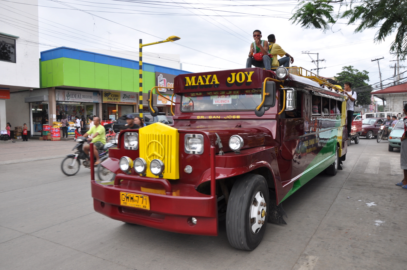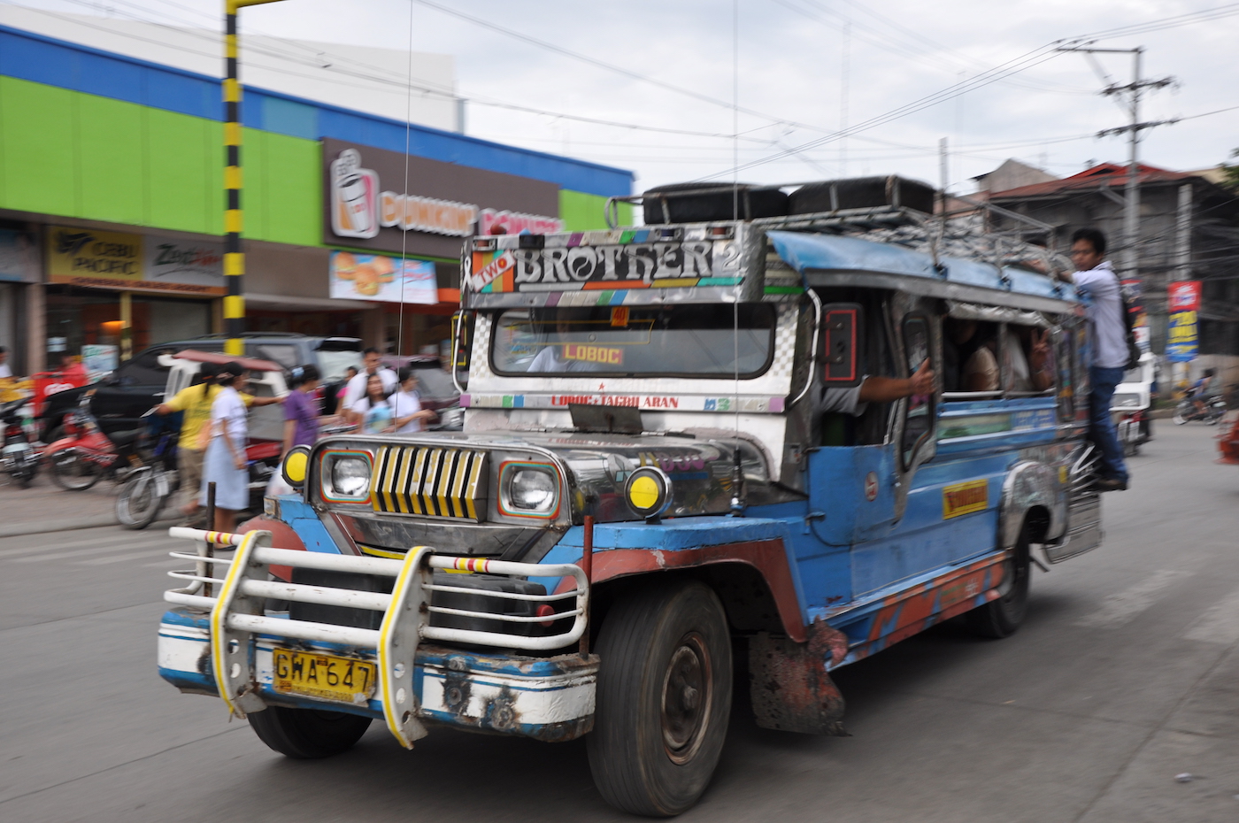 Posebnost Filipinov so jeepneyi, ki bi jih lahko poimenovali cirkuška prevozna sredstva. So kot nekakšni taksiji ali mini busi, na katere se nabaše tudi do 30 ljudi. Potniki ne sedijo samo v vozilu, temveč tudi na strehi ali pa se z rokami držijo zadnjega dela, z nogami pa se upirajo na zunanje poličke. Domačini so zamisel za jeepneye dobili pri ameriški vojski, ki jih je uporabljala v drugi svetovni vojni. Med Filipinci so še danes najbolj priljubljeno prevozno sredstvo. Pri jeepneyih je zelo pomemben tudi njihov izgled, zato nanje narišejo in napišejo marsikaj in dajejo videz kot bi bili pripravljeni za cirkuške predstave. Drugo zelo pogosto prevozno sredstvo na Filipinih so tricikli, ki izgledajo, kot bi na desno stran motornega kolesa pritrdili škatlico s sedežem za dve osebi in pomožnim kolescem. Sedež za dve osebi je zgolj za Filipince, kajti za tujce je običajno premajhen.