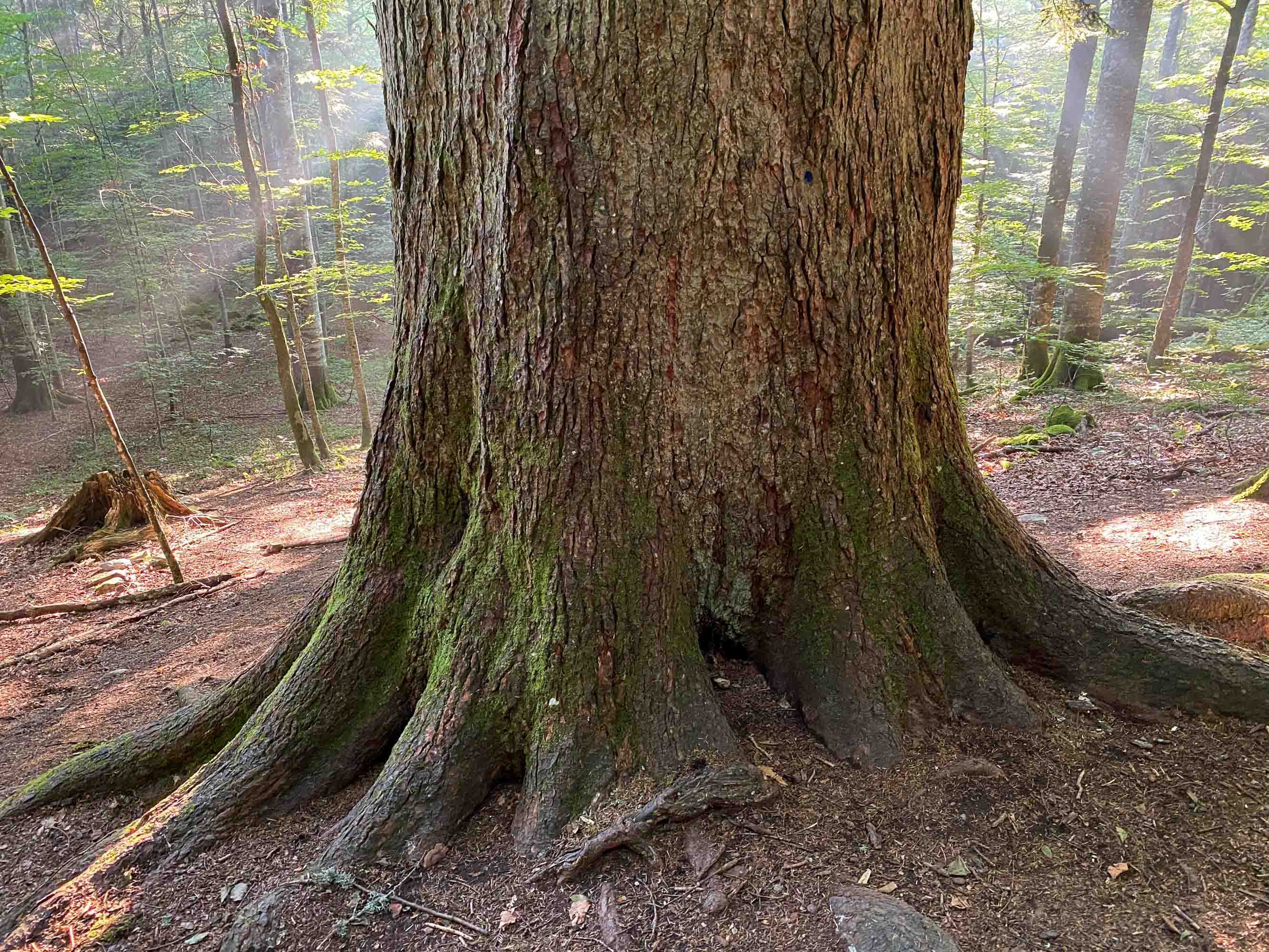 Po štirih kilometrih gozdne ceste od Rajhenava v smeri Roške žage parkirava na razširjenem delu ceste ob jasi, ki jo preči tudi planinska pot proti Mirni gori. Manj kot pet minut hoje od ceste naju pripelje do osupljive kraljice Kočevskega roga. Mogočna 500 let stara jelka sodi med največja in najstarejša slovenska drevesa. Na strmem pobočju je vzkalila okoli leta 1500, potem v tedanjem gozdu celo stoletje čakala v senci drugih orjakov in komaj opazno rasla. Ko je vihar podrl sosednje drevo, je dobila priložnost pognati se proti soncu. Danes se proti nebu pne kar 55 metrov visoko, 5-metrski obseg njenega debla pa priča, da korenine sidrajo orjaško maso, v kateri je kar 40 kubičnih metrov lesa - dovolj za izgradnjo lesene hiše.
