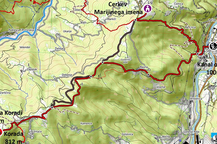 Iz središča Kanala ob Soči gremo čez znameniti kamniti most in pod podvozom železniške proge, kjer zavijemo levo. Nadaljujemo po cesti in navzgor po ulici do razcepa, kjer krenemo levo. Takoj, ko prečkamo potok Gorevšek, zavijemo desno ob njem navzgor, kmalu zatem levo in potem hodimo ves čas prečno v vzponu čez gozdnata pobočja. Ko s travnikov kmetije Ravna ponovno stopimo v gozd, gremo na prvem razcepu strmo desno navzgor. Pozor! Na tem delu je zaradi žledoloma trasa poti drugačna kot na starejših zemljevidih (tam gre naravnost). Po kratkem vzponu zavijemo desno na nekdanji kolovoz, mimo ostankov domačije, od tam pa položno do asfaltne slemenske ceste, ki povezuje Lig in Kojsko. Po njej levo in na sedlu pod Sv. Jakobom levo v gozd ter po lepi potki do cerkvice (ta vrh je lahko tudi samostojni izlet, če se na sedlo pripeljemo). Z vrha se spustimo proti jugu, gremo večkrat rahlo gor in dol do senožeti, kjer spet naletimo na asfaltno cesto. Ko pridemo do razcepa za Zarščino, gremo desno, potem pa po makadamski cesti in zopet levo na stezico ter v vzponu skozi gozd do cerkvice sv. Genderce (sv. Jedrt) na veliki planoti Korade. Do najvišje točke je čez travnik še 5 minut, do Zavetišča na Koradi (tel. +386 41 352 584) pa slabih 10 minut.