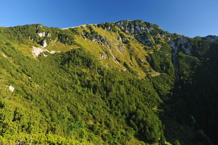 Kako na vrhova? Na robu parkirišča pred stransko cesto proti hišam na planini Jezerca opazimo markirano pot, ki nas povede okrog Kržišča do Kriške planine (če na Jezercih plačamo za dvig zapornice, se do sem lahko pripeljemo). Skozi podhod pod smučarsko progo nadaljujemo mimo spodnje postaje vlečnice po dnu travnate doline proti vzhodu. Na robu se odpre pogled proti dolini Korošice in Velike planine, naša pot pa zavije levo in se usmeri okrog vzhodnih pobočij Krvavca in Zvoha. Za prvim izrazitejšim robom se v nekaj okljukih celo spusti, nato pa se razgledno vzpne do planine Koren z jezercem in pastirsko kočo. Od nje se markacije dvigujejo po travnato-rušnatem dnu doline. Ko se teren izravna in postane kraško nepregleden, se lahko odločimo še za obisk bližnjih Košutne, 1974 m, ali Kompotele, 1989 m, za Vrh Korena pa se na razpotjih držimo levo. Na širokem grebenu od Vrha Korena proti Zvohu je razcep. Levo bomo sestopili, razdrapani Vrh Korena, 1999 m, pa po skalah dosežemo desno v nekaj minutah.