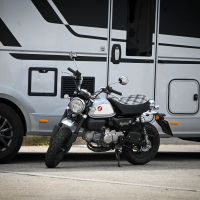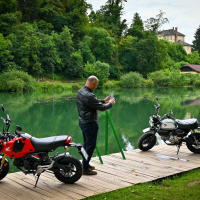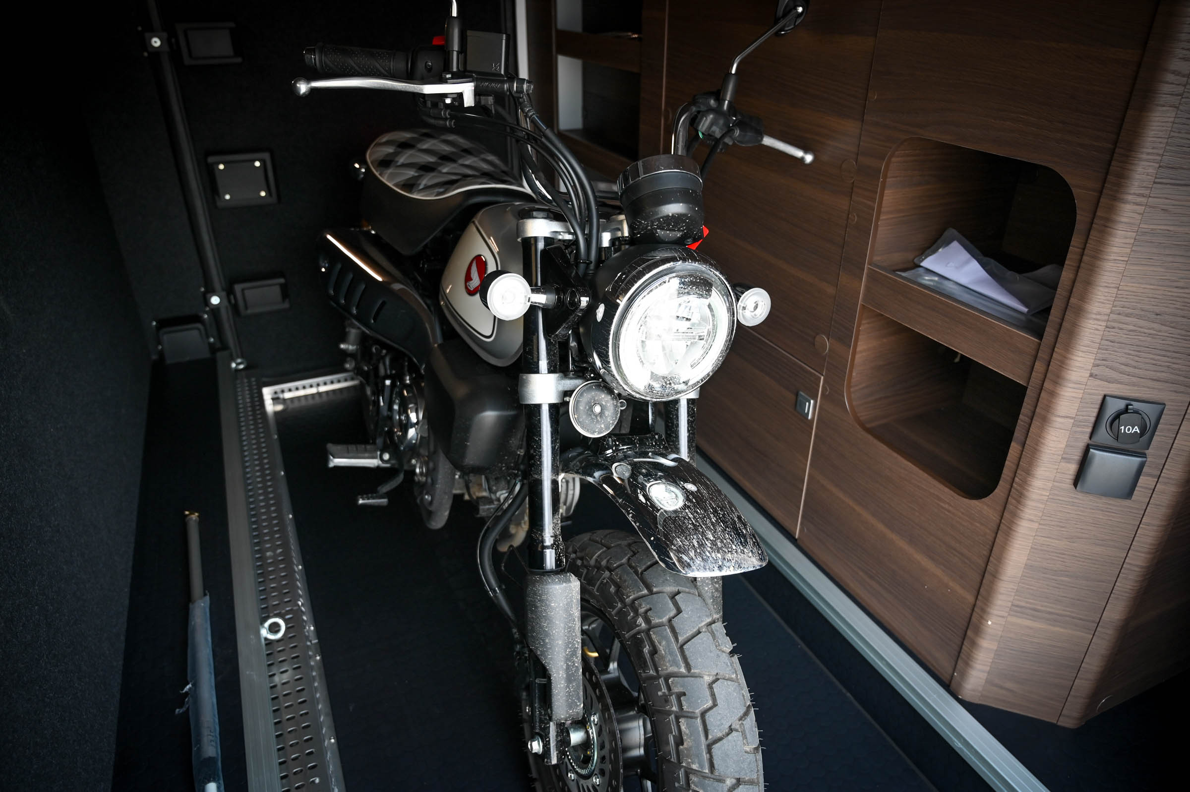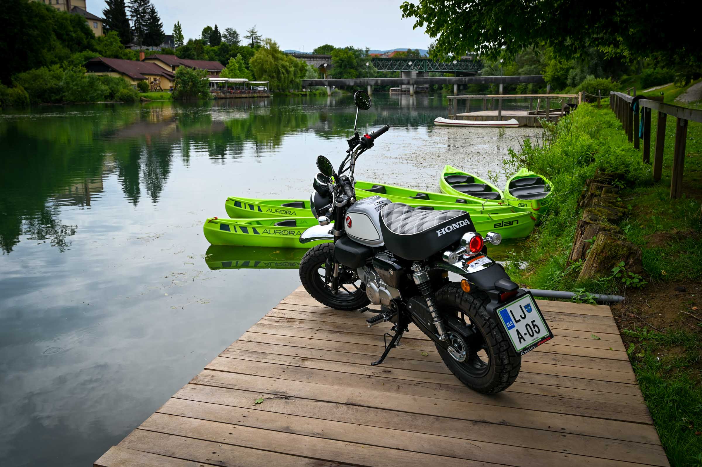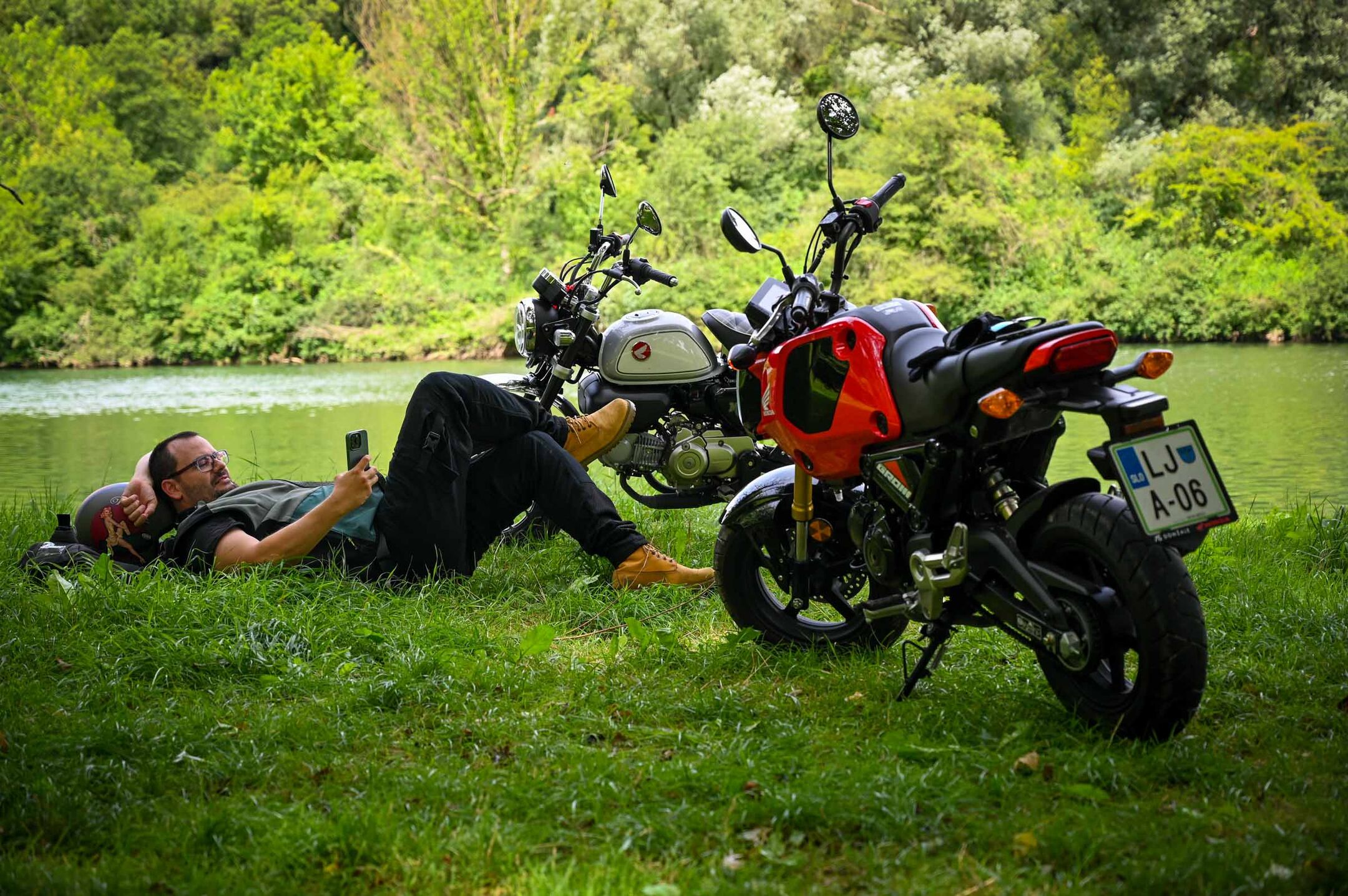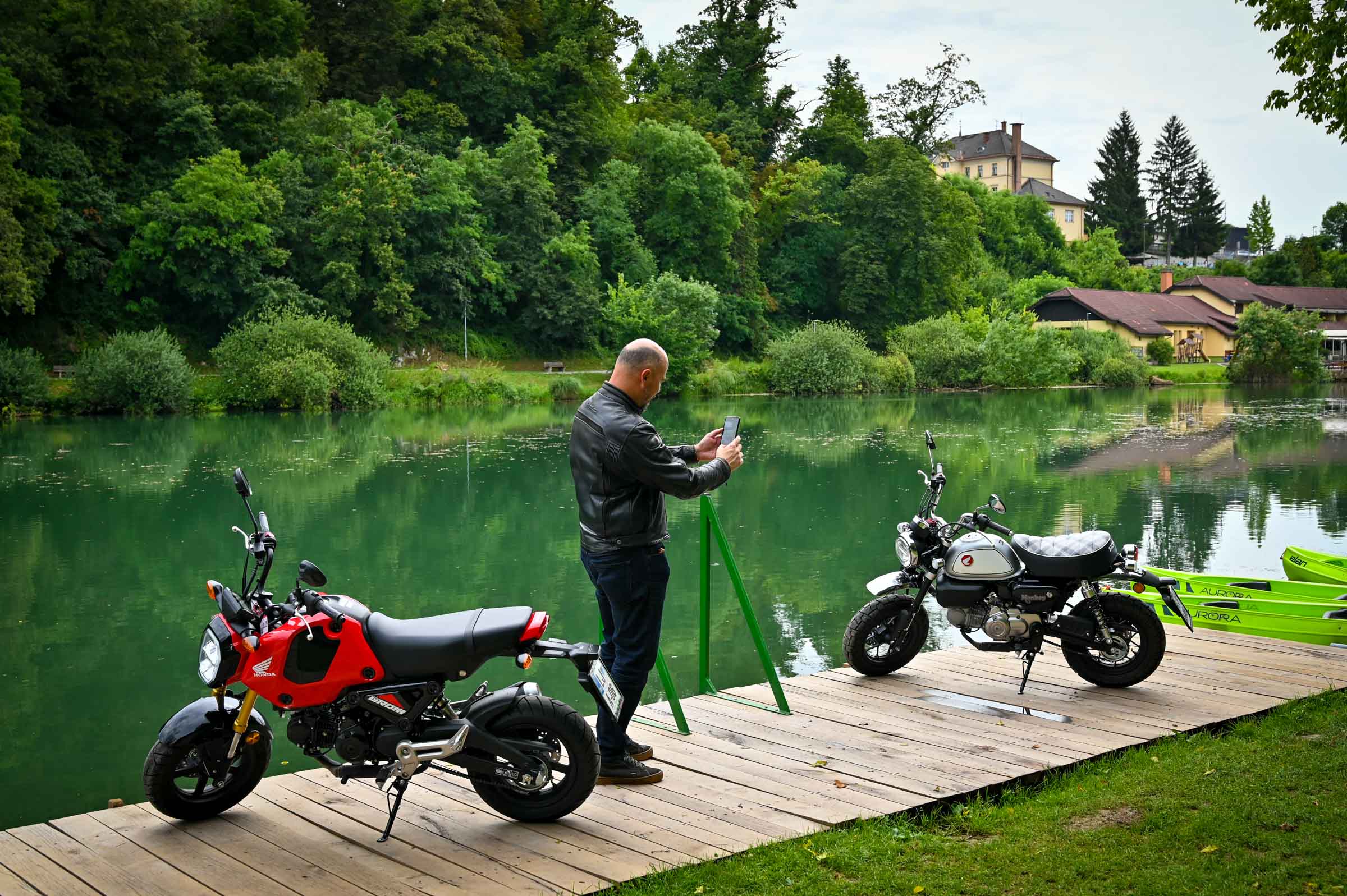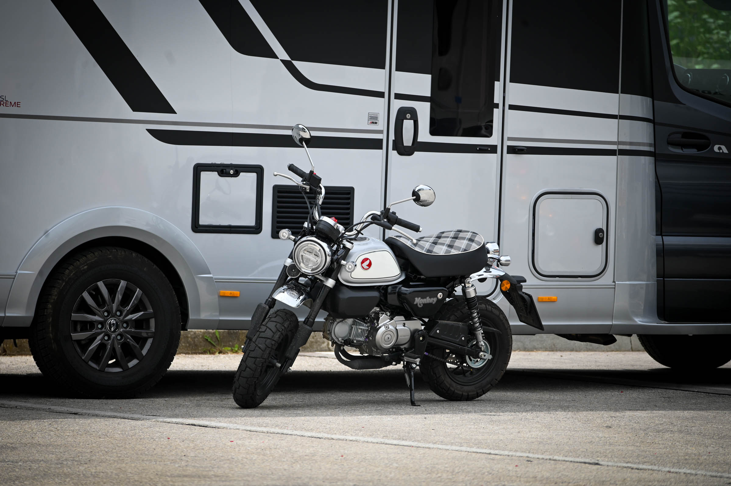 O široki ponudi 125-kubičnih skuterjev smo v Motoreviji že pisali. Večina jih je prevelikih, da bi jih brez težav peljali v tovornem prostoru avtodoma. Idealno rešitev glede na razmerje med velikostjo, zmogljivostjo in opremo ponujata dva kompaktna Hondina motocikla - ikonični enosedežnik monkey in dvosedežni MSX 125A grom. Oba sta opremljena tudi z ABS zavornim sistemom in dovolj zmogljiva, da boste na njih lahko premagovali tudi večje razdalje na dnevnih izletih. S strokovnim sodelavcem Motorevije, izkušenim motoristom Petrom Kavčičem, smo se na tak enodnevni turistični izlet po okolici dolenjske prestolnice odpeljali naravnost iz garaže skoraj 7,7 metra dolgega avtodoma adria matrix supreme MB 670 SL. Ob tem velja izpostaviti, da smo posamičlen motor brez težav zapeljali v zaprt tovorni prostor nad zadnjim previsom avtodoma, ob privezanem motociklu pa je ostalo še dovolj prostora za kamp opremo. Poleg tega pa oba malce več kot 1,7 metra dolga motorja z nizkim sedežnim položajem odlikuje še zelo obvladljiva masa, saj pripravljena za vožnjo tehtata le 103 oziroma 104 kilograme. Daljši previsi pri avtodomih namreč v povprečju dovoljujejo največ od 150 do 200 kilogramov tovora v prtljažniku.