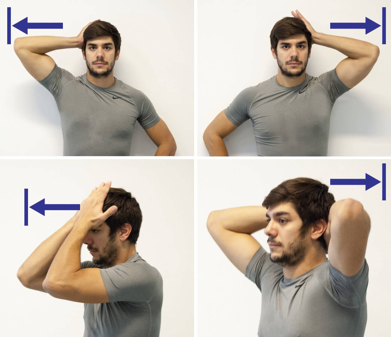 | 4 enostavne vaje, ki jih lahko izvajamo kjerkoli in so pomembne za moč vratnih mišic. Glavo potiskamo proti uporu roke. Vsako vajo izvajamo posebej v dveh serijah po 10 potiskov. Vmesni odmor med vsakim potiskom je 15 do 20 sekund. |