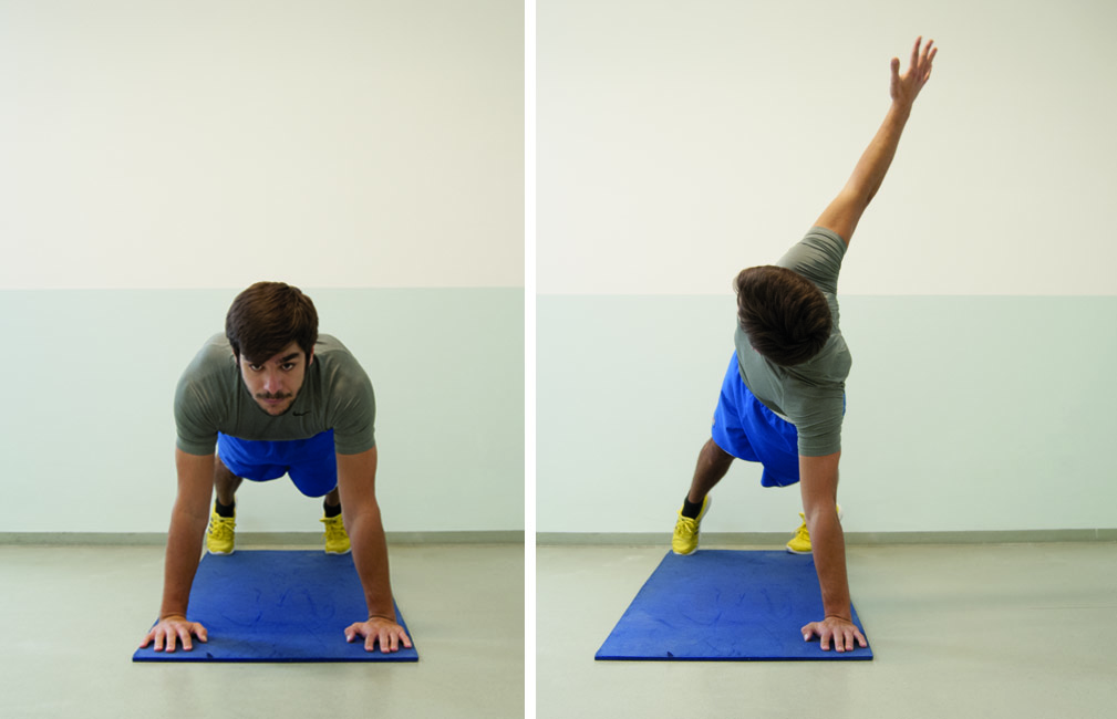 | Med vožnjo so ramena, roke in trup zelo aktivni, zato moramo v program vključiti številne vaje za omenjene dele telesa. Na sliki je prikazana vaja, ki jo lahko izvajamo kjerkoli. Pomembna je za moč in stabilizacijo rok, ramen in trupa. Izvajamo 2 do 3 serije po 12 do 15 ponovitev z vmesnim odmorom 30 do 60 sekund. |