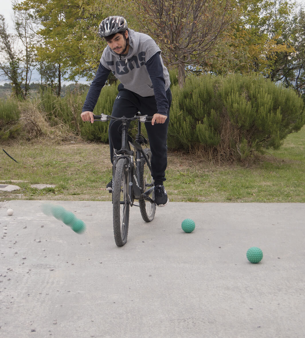 | Vožnja kolesa z odmikom vrženih žogic Vaja na sliki prikazuje razvoj hitrosti reakcije v kombinaciji s koordinacijo, ravnotežjem, agilnostjo, močjo in natančnostjo. Spodnja slika prikazuje razvoj moči nog, hrbta, rok in vratu ter ohranjanje občutka za sedenje in premikov na motociklu. |