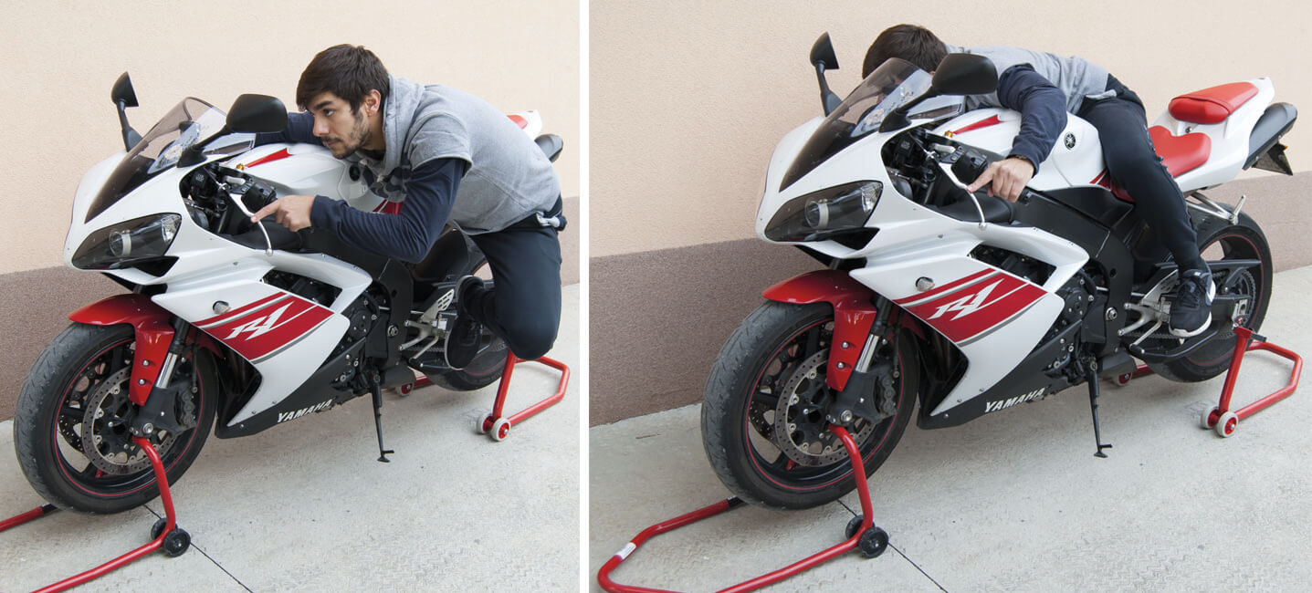 | Kot dopolnilo omenjeni vadbi lahko izvajamo nekaj vaj na stoječem motorju – tudi če je ta v garaži. Pri izvajanju teh vaj mora biti motor na obeh stojalih. Vaje lahko izvajamo v 2 do 3 serijah po 20 so 25 premikov z vmesnim počitkom 30 do 60 sekund. |