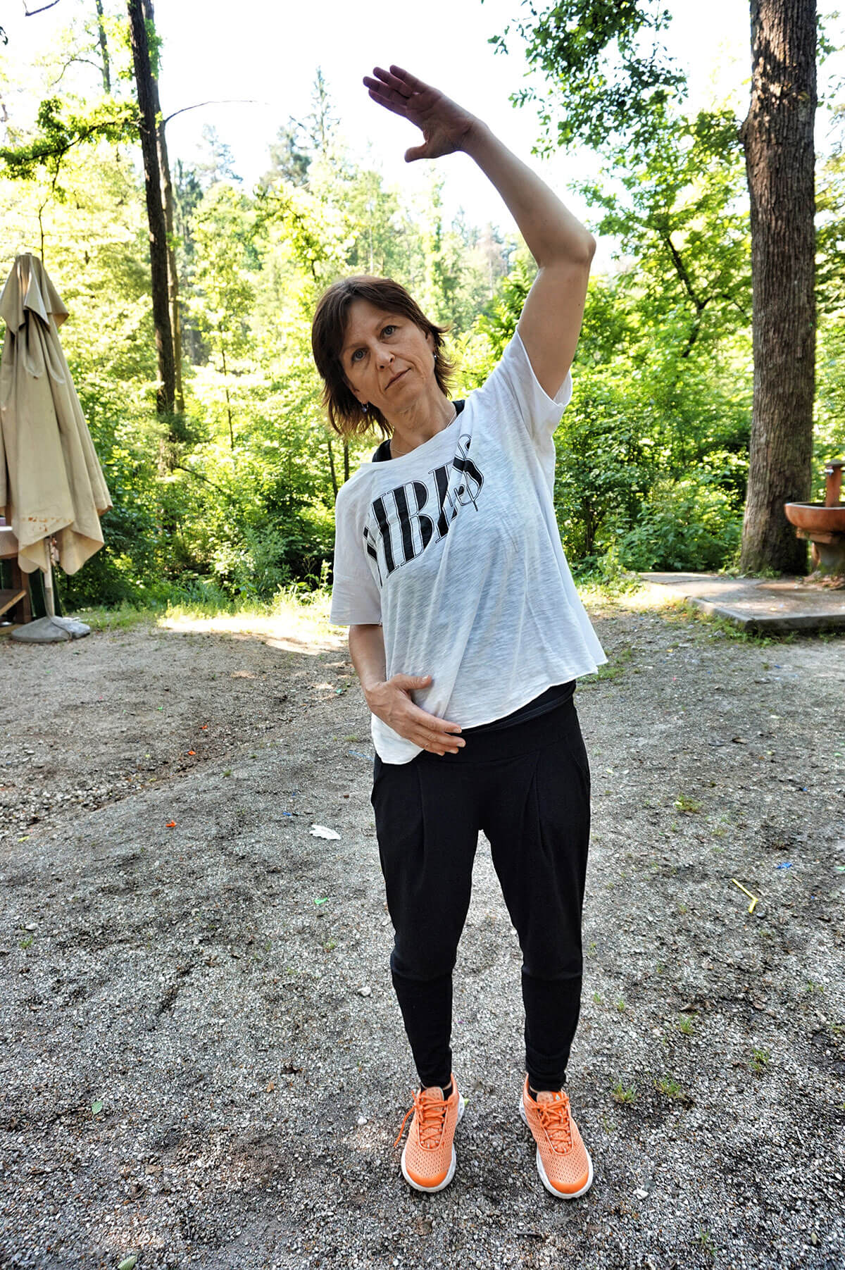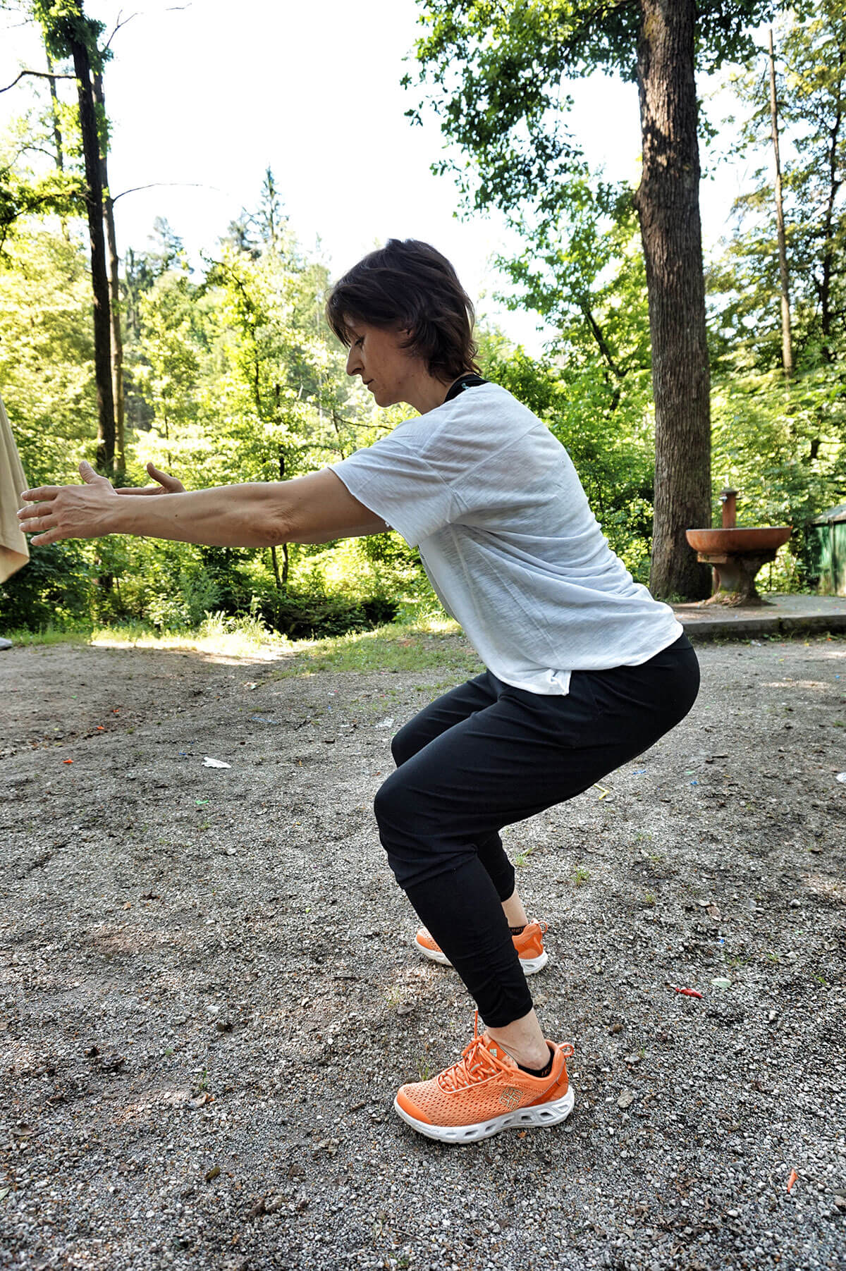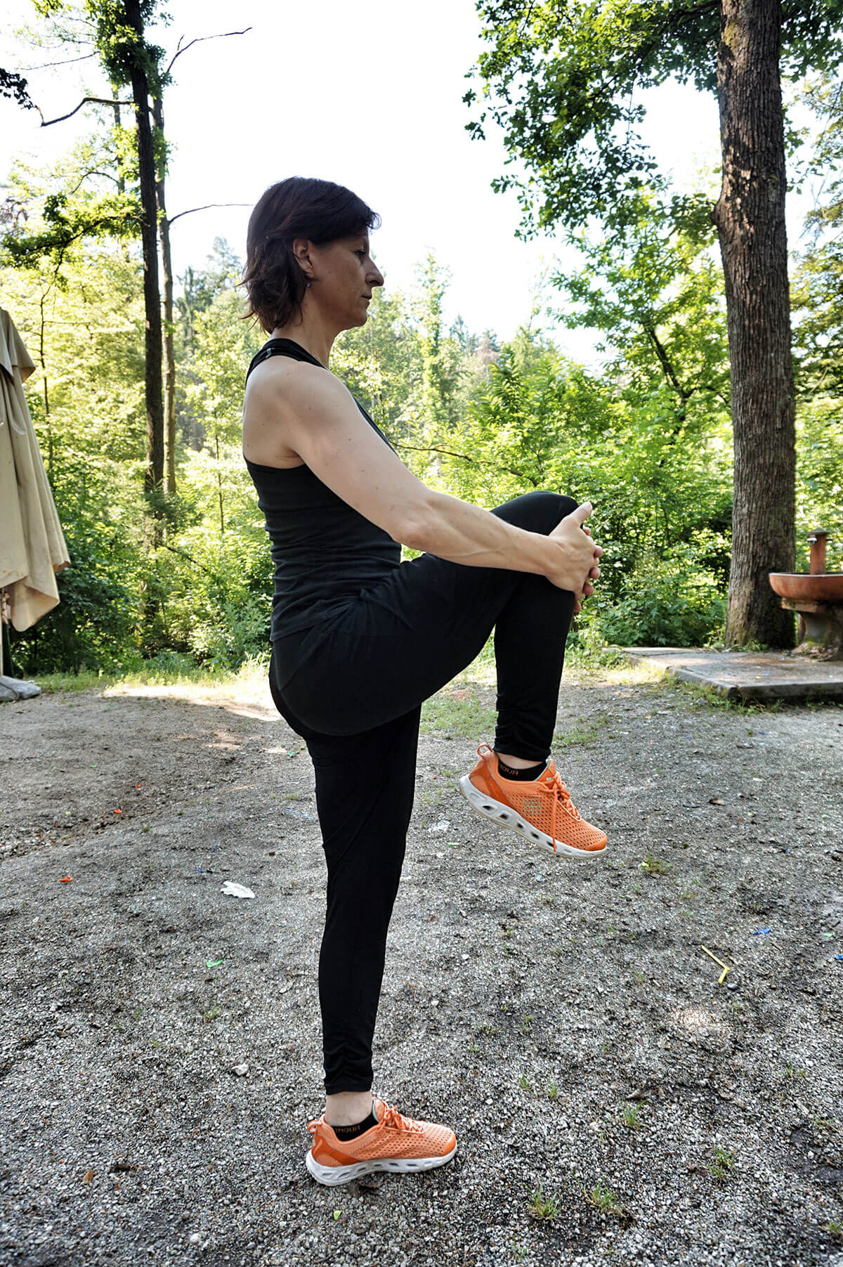 - v stoječem položaju z zravnanim hrbtom primaknemo koleno k prsim in zadržimo. Menjamo nogi,