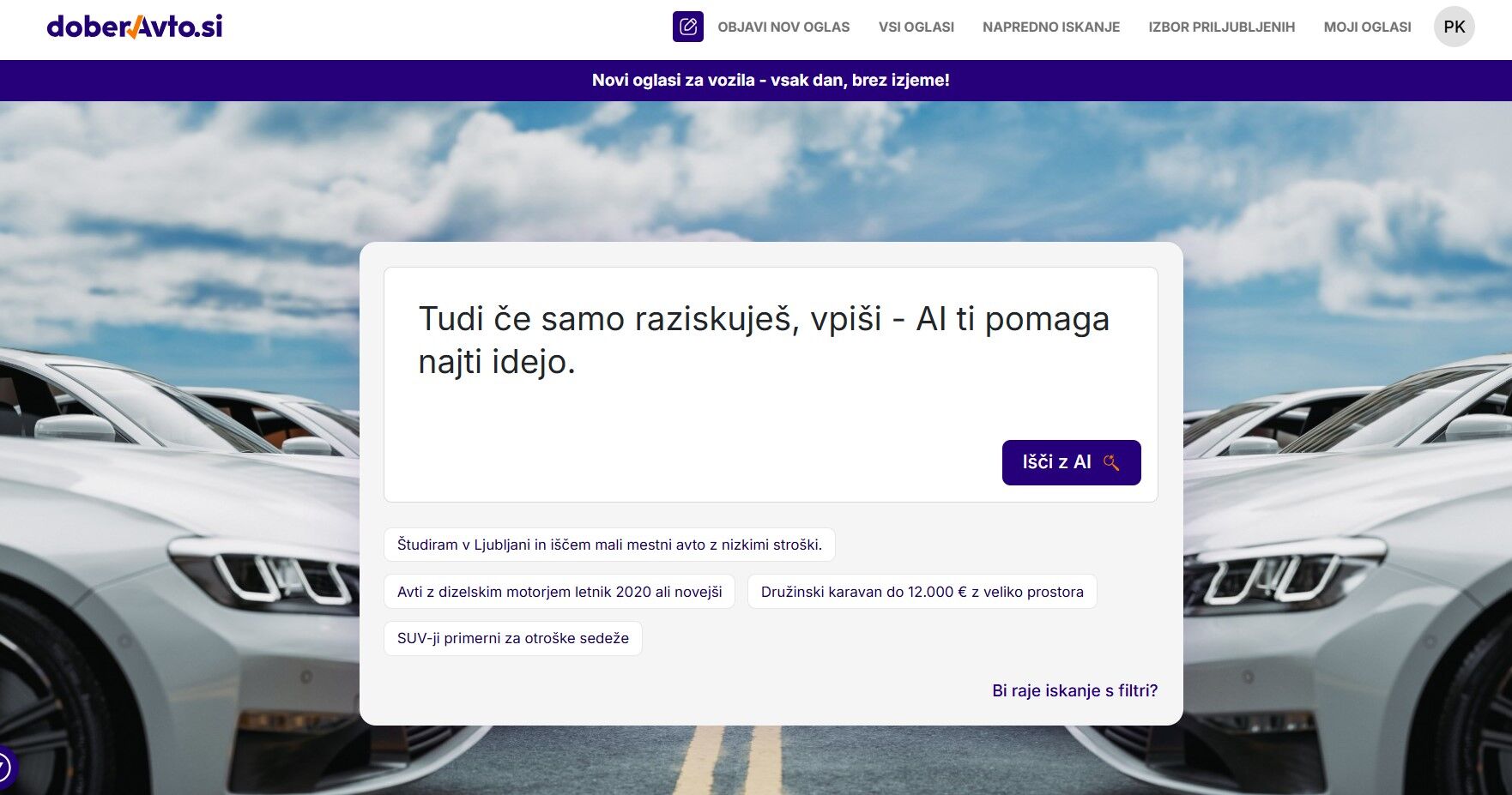 Portal rabljenih avtomobilov DoberAvto.si je prvi pri nas, kjer kupcem avto pomaga poiskati umetna inteligenca; doslej je bilo iskanje pravega avtomobila pogosto povezano z dolgotrajnim klikanjem po filtrih, izbiranjem znamk, modelov, letnikov, opreme, motorizacije in cenovnih razredov, kar je kupcem vzelo veliko časa in pogosto tudi živcev. AI iskalnik na portalu DoberAvto.si to izkušnjo močno poenostavi in olajša, pri razvijanju njegovih algoritmov pa je pomagala tudi Motorevija oziroma AMZS …