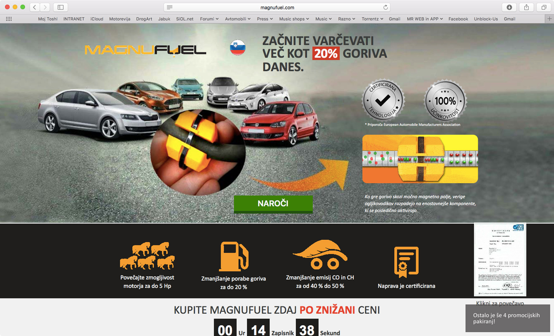 V zadnjem času so najbolj vsiljivi pri podjetju Magnufuel LLC iz ameriškega Chicaga, ki na spletnih straneh v (polomljeni) slovenščini prodajajo čudežne magnete; te mora uporabnik namestiti na cev za gorivo, ki dovaja gorivo vbrizgalnemu sistemu motorja. Pri podjetju obljubljajo, da bo njihov izdelek “povečal zmogljivosti motorja za 5 HP”, “zmanjšal porabo goriva za do 20 %” in “zmanjšal emisije CO in HC za od 40 % do 50 %”. Ne manjka tudi zapis, da je naprava “certificirana”, zraven je celo dokument certifikata dvomljive pristnosti.