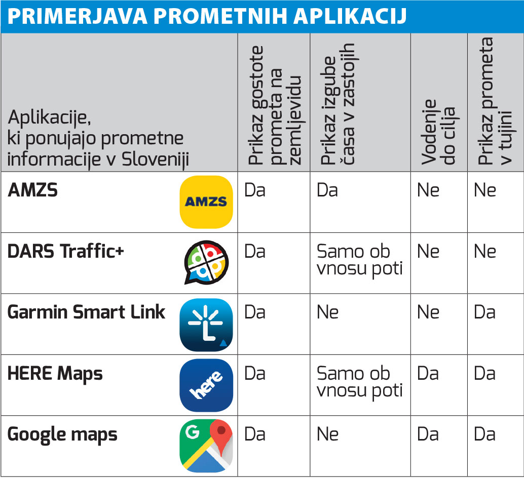 Pri tokratnem pregledu aplikacij smo se omejili na prometne informacije, ne pa tudi na vodenje do izbranega cilja. To je pomembno dejstvo: če želite ob realnih prometnih informacijah uporabljati tudi vodenje do izbranega cilja, si lahko pomagate le z aplikacijama HERE in Google Maps ter ob souporabi Garminove navigacijske naprave tudi z aplikacijo TrafficLive – AMZS in DARS aplikaciji ponujata le informacije.
