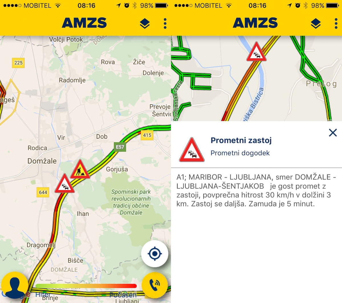 Če vse aplikacije ponujajo možnost barvnega prikaza gostote prometa, pa ne povedo vse, kako dolg je zastoj in koliko časa izgubimo v njem. Najbolj pregledno in informativno to zmore aplikacija AMZS, kjer z dotikom ikone zastoja na zaslonu prikličemo obvestilo, kjer se v večini primerov izpiše povprečna hitrost vožnje v zastoju, dolžina zastoja in izguba časa v zastoju.