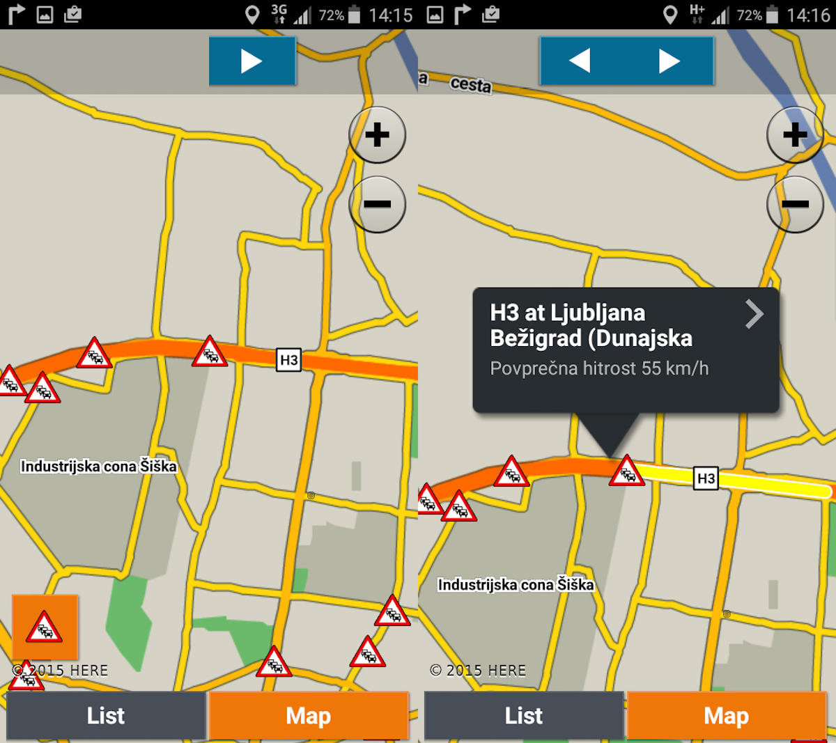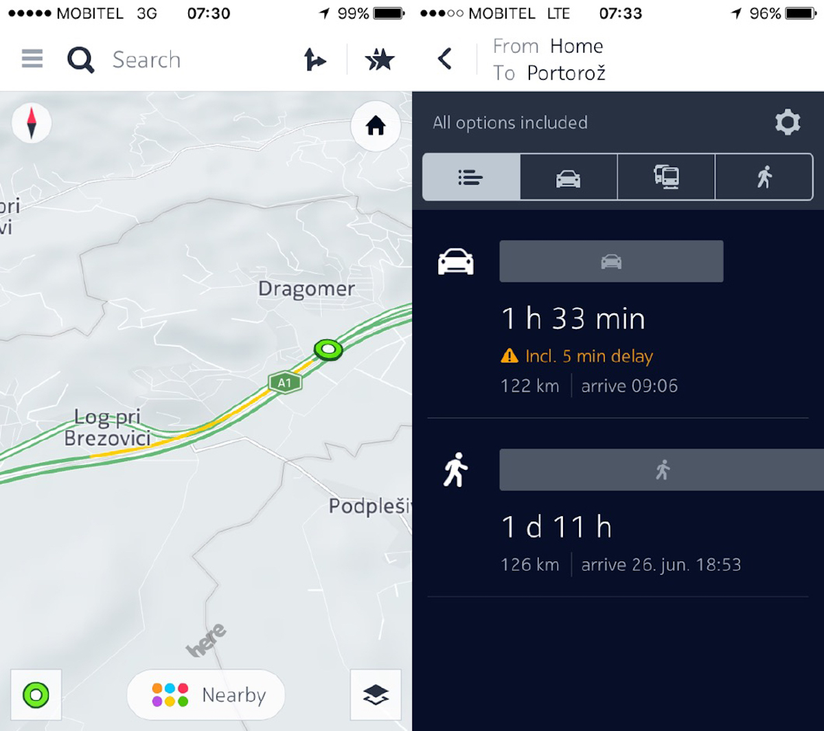 Aplikacija HERE Maps obvešča o izgubi časa le, če smo vanjo vnesli cilj potovanja in vklopili vodenje do našega cilja; takrat aplikacija izpiše, koliko časa rabimo za izbrano pot in koliko časa na njej izgubimo zaradi zastojev.