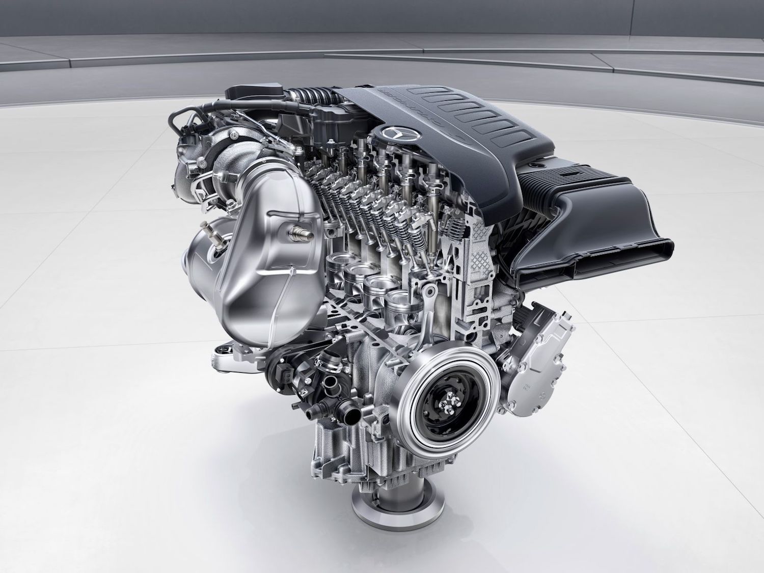 Ob sodobnih dizelskih motorjih pri Mercedesu vidijo prihodnost tudi v bencinskih motorjih – in to (ponovno) v vrstnih šestvaljnikih. Po letih razvoja V6 motorjev se tako ponovno obračajo k vrstnim šestvaljnikom; sredi prihodnjega leta bodo novi 3-litrski vrstni šestvaljnik začeli vgrajevati v limuzino razreda S. Nov motor ima kar nekaj zanimivih lastnosti in posebnosti; ob izboljšanih notranjih lastnostih (manjše trenje, večja učinkovitost zgorevanja) je novost predvsem 48-voltno električno omrežje. To omogoča tudi vgradnjo novega, integriranega zaganjača oziroma generatorja, ki se nahaja med motorjem in menjalnikom ter je neposredno povezan z ročično gredjo. Generator ob zagonu motorja služi tudi kot električni motor, ki bencinskemu pomaga z dodatnim navorom 220 Nm in omogoča večjo prožnost. Ob zaviranju generator ustvarja električno energijo, ki se shranjuje v litij-ionski akumulator. 48-električno omrežje ne služi le pogonu generatorja, ampak z energijo oskrbuje tudi ostale večje električne porabnike – črpalko za vodo, kompresor klimatske naprave in električni polnilnik. Ta dopolnjuje turbinski polnilnik in povečuje prožnost motorja. 3-litrski vrstni šestvaljnik z močjo prek 300 kW bo tudi prvi Mercerdesov serijski bencinski motor, ki bo opremljen s filtrom trdnih delcev.