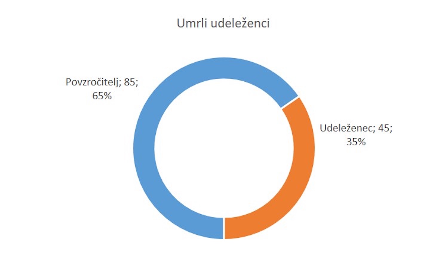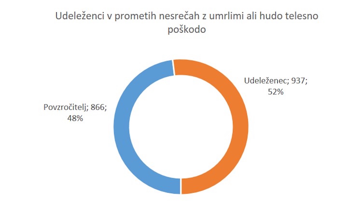 V 892 prometnih nesrečah s hudimi telesnimi poškodbami ali umrlimi udeleženci so bile udeležene 1803 osebe: 866 je bilo povzročiteljev in 937 udeleženih oseb. Med umrlimi je bilo 85 povzročiteljev in 45 oseb, ki niso bile povzročitelj prometne nesreče.