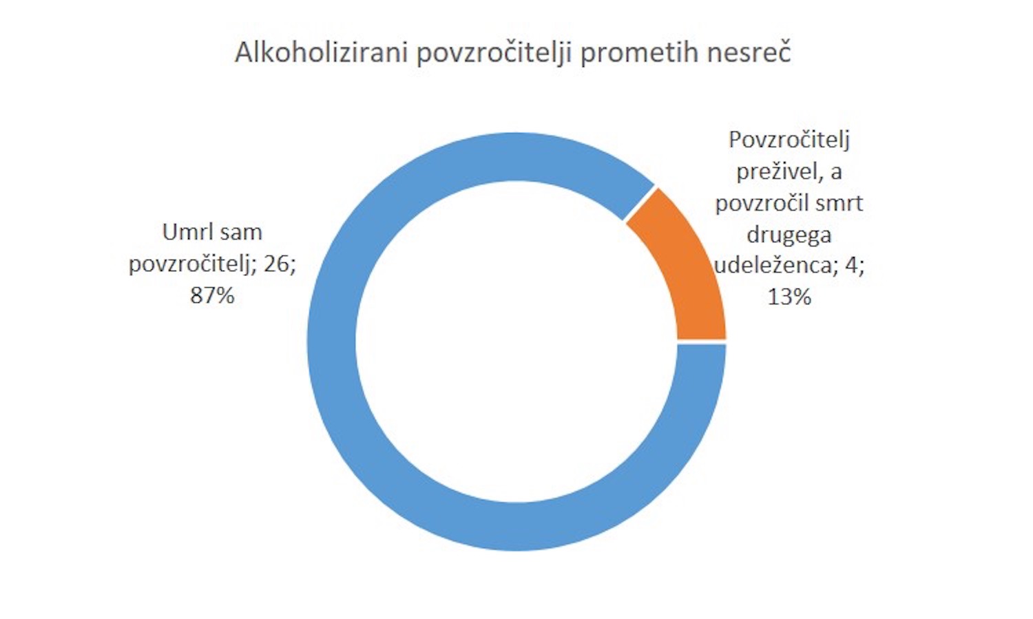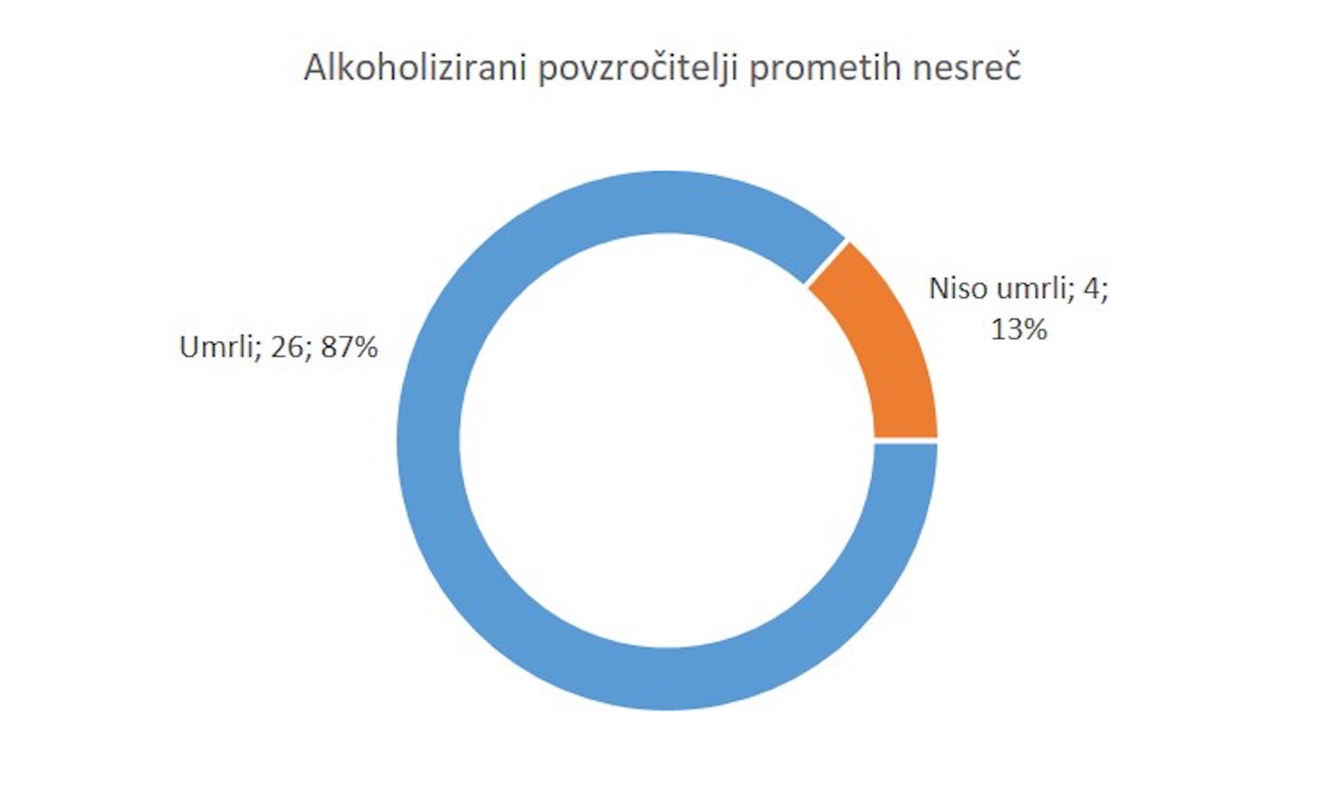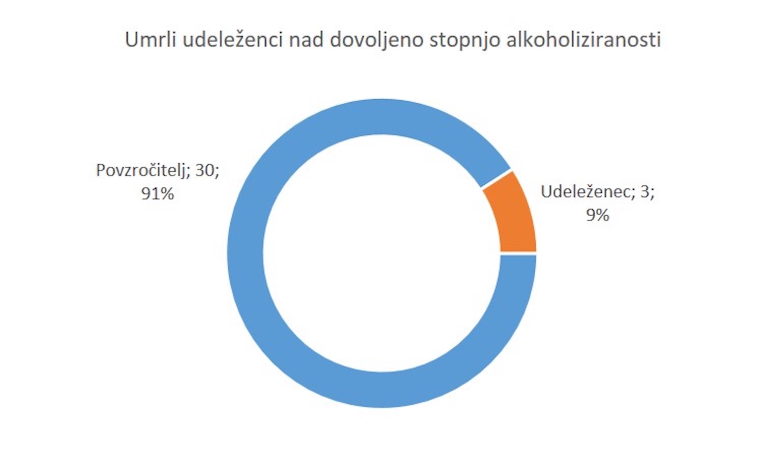Z večjo vsebnostjo alkohola v izdihanem zraku ali v krvi kot je dovoljeno (meja je 0,24 mg alkohola v litru izdihanega zraka ali 0,50 grama alkohola na kilogram krvi), je bilo 180 povzročiteljev najhujših prometnih nesreč, kar predstavlja 20,8 odstotka povzročiteljev najhujših prometnih nesreč. Med alkoholiziranimi povzročitelji so bili štirje takšni, ki so povzročili smrt drugih oseb, sami pa so ostali nepoškodovani ali so jo odnesli z lahkimi telesnimi poškodbami.