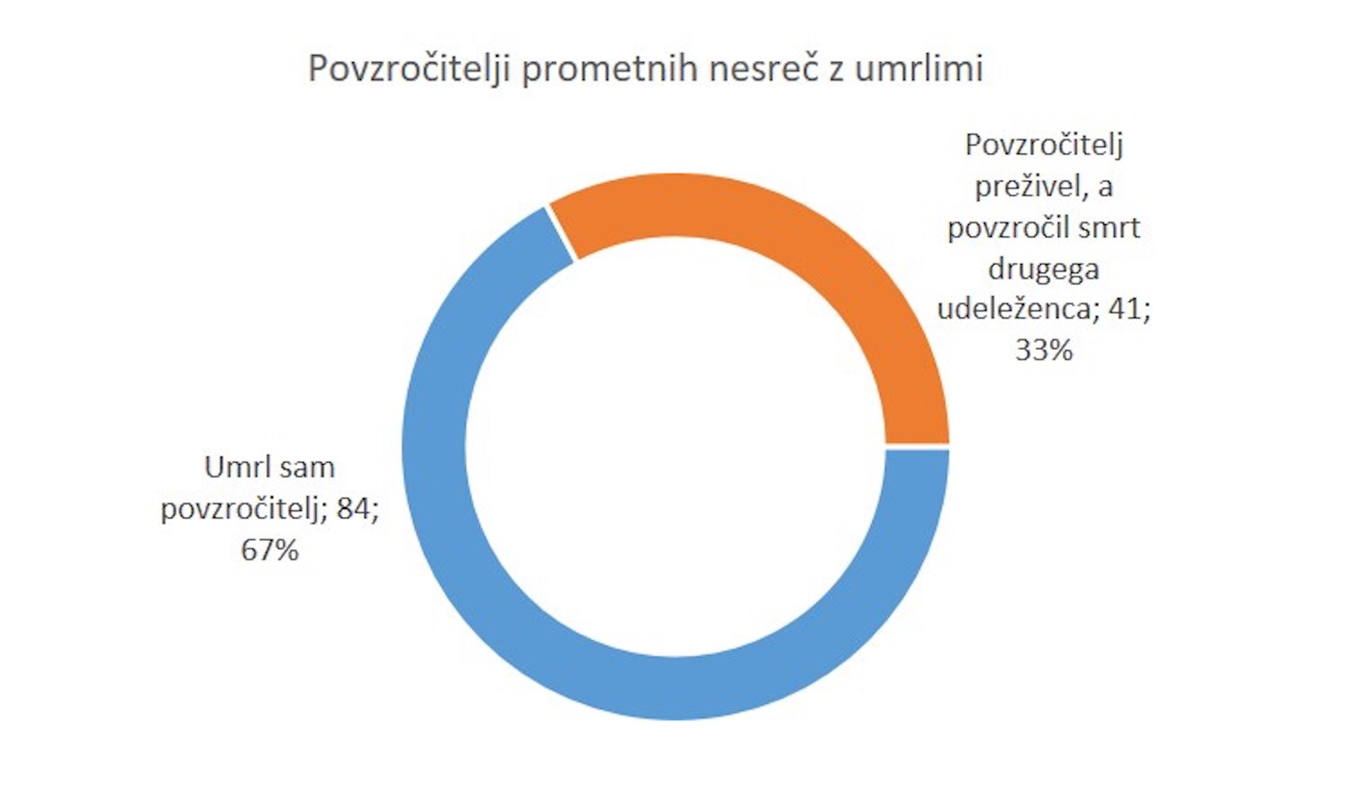 Med vzroki za prometne nesreče s hudo telesno poškodovanimi ali umrlimi udeleženci je na prvem mestu “neprilagojena hitrost” (35 odstotkov), “napačna stran/smer vožnje” (18 odstotkov), “neupoštevanje pravil o prednosti” (18 odstotkov, 29 odstotkov pa je drugih vzrokov. Med tipi nesreč s hudo telesno poškodovanimi ali umrlimi udeleženci so na prvem mestu “prevrnitev vozila” (19 odstotkov), “čelno trčenje” (17 odstotkov), “bočno trčenje” (16 odstotkov), “povoženje pešca” (15 odstotkov), “trčenje v objekt” (11 odstotkov), nalet (5 odstotkov), ostalih tipov nesreč pa je bilo 17 odstotkov.