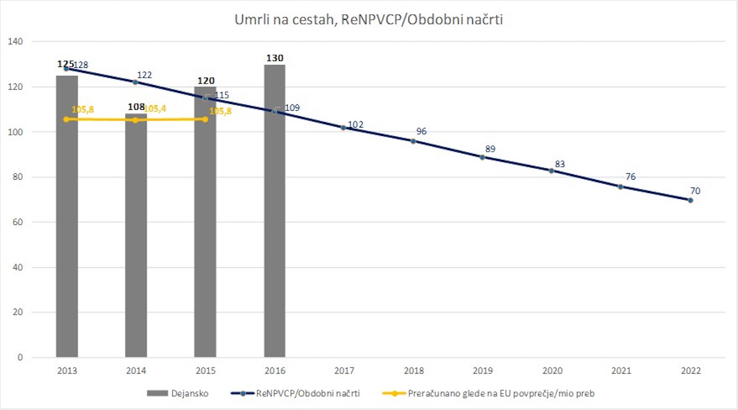 Tolikšno število žrtev na slovenskih cestah precej odstopa od resolucije nacionalnega programa varnosti cestnega prometa za obdobje od 2013 do 2022 ter podrobnejših dvoletnih obdobnih načrtov. Število žrtev na slovenskih cestah odstopa tudi od evropskega povprečja pri umrlih na cestah – varnost na slovenskih cestah je slabša od evropskega povprečja.