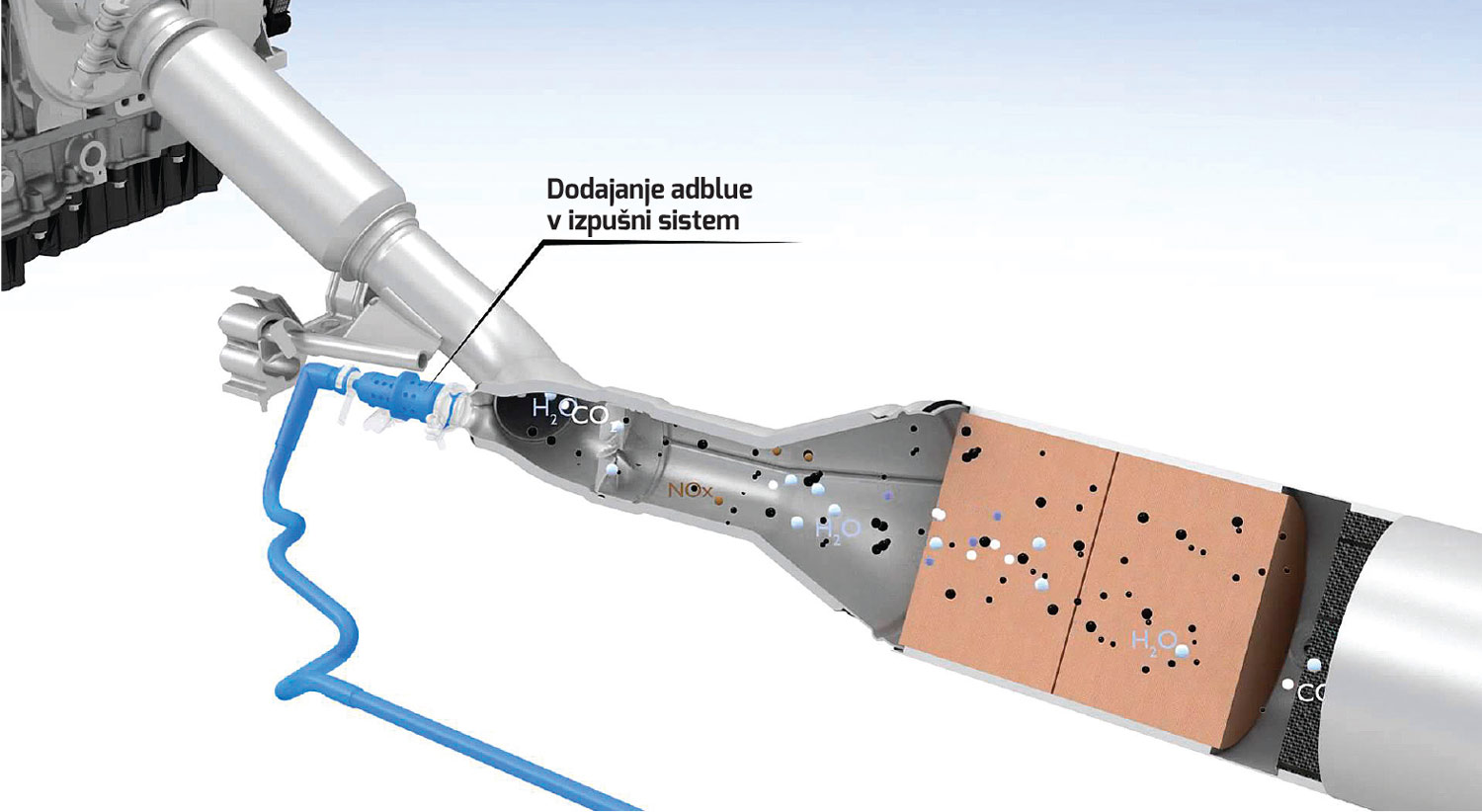 Bralci Motorevije veste, da je skoraj nemogoče zasnovati čist dizelski motor z zmernimi izpusti dušikovih oksidov (NOx) brez dodatnega sistema za čiščenje izpušnih plinov – najpogosteje je to selektivni redukcijski katalizator (SCR). Nekaj prostorninsko majhnih dizelskih motorjev doseže zahtevane okoljevarstvene standarde tudi brez tega sistema čiščenja izpuha, a ti so redki – dizelski motorji, ki tudi v realnem prometu (in ne samo v laboratorijih) v zrak izpustijo malo dušikovih oksidov, so praviloma opremljeni z SCR katalizatorji. Ti pa za svoje delovanje rabijo dodatno kemijsko spojino oziroma dodatek v obliki sečnine, v kateri je amonijak: dodatek se vbrizga v izpušno cev med oksidacijskim in SCR katalizatorjem, spojina pa nato reagira z dušikovimi oksidi in jih pretvori v dušik ter vodno paro. Rešitev je razmeroma učinkovita, saj ob pravilnem delovanju katalizatorja v dušik in vodno paro pretvori več kot 90 odstotkov dušikovih oksidov v izpuhu.