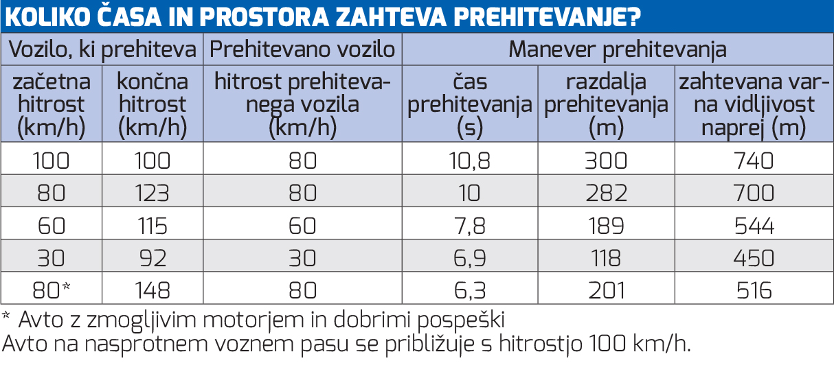 Koliko metrov neoviranega pogleda naprej oziroma varne vidljivosti rabimo za prehitevanje, objavljamo v posebni tabeli.