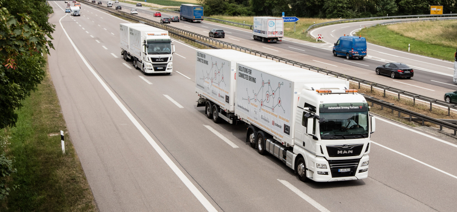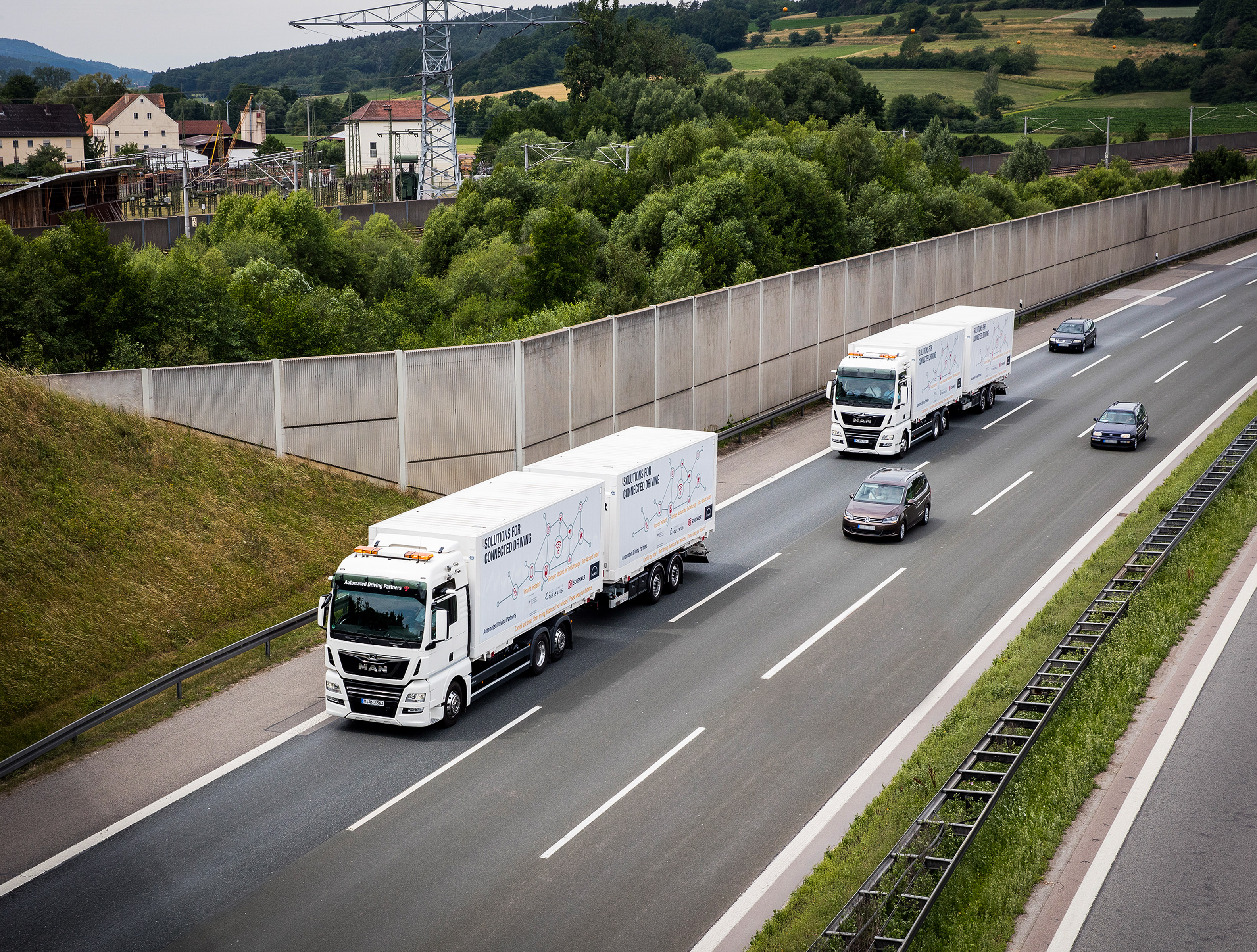 Testiranje avtonomne vožnje v konvoju se je na nemški avtocesti A9 med Neufahrnom pri Münchnu in Nürnbergom začelo konec junija in do konca avgusta so bili tovornjaki v nekaj testnih konvojih s po dvema voziloma prazni. Od septembra do predvidoma januarja prihodnje leto pa bodo tovornjaki v testnih konvojih opravljali svoje poslanstvo - na rednih oskrbovalnih linijah bodo prevažali različen tovor.