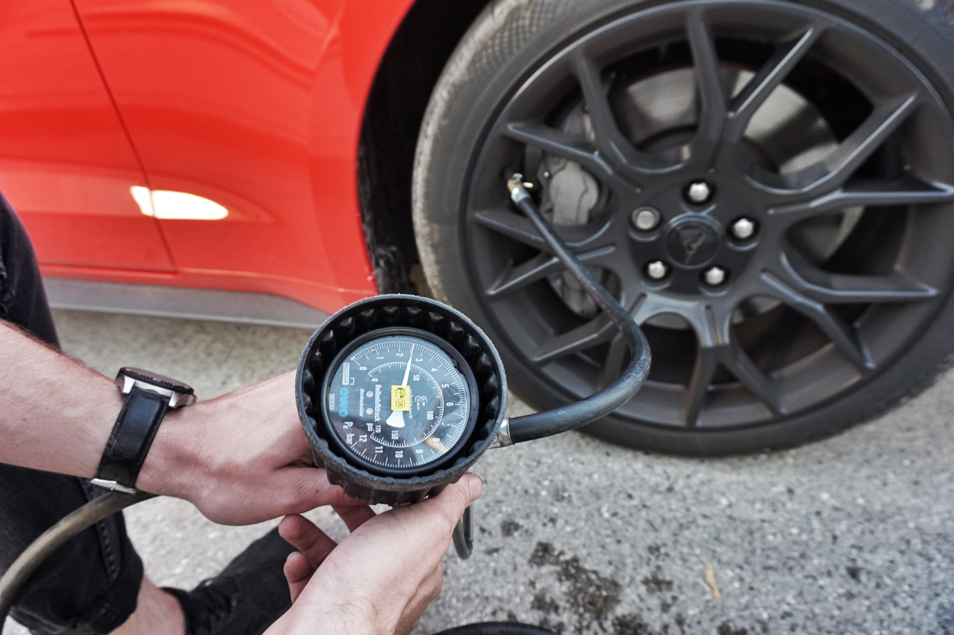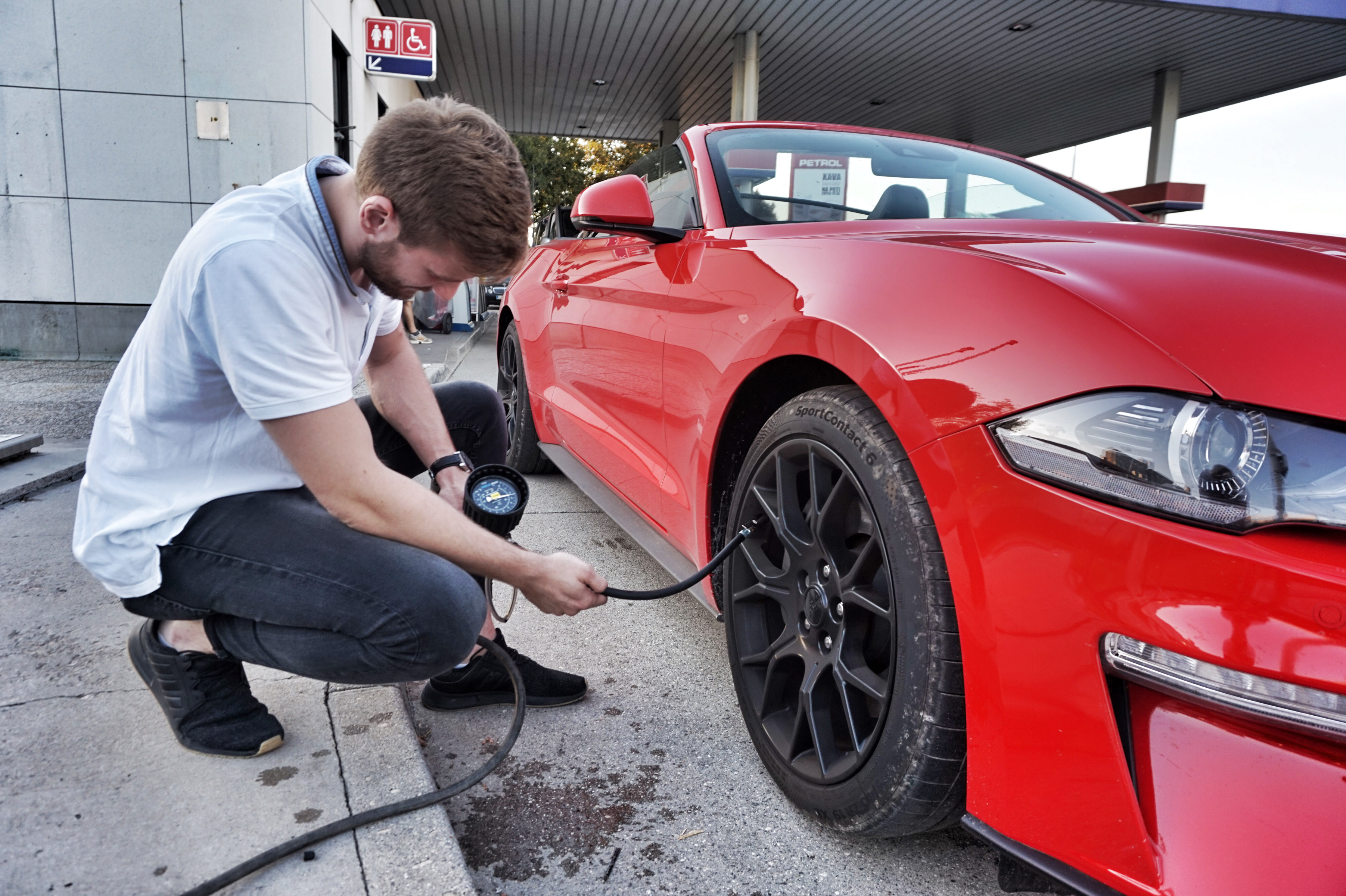 V našem testu smo se med Mariborom in Ljubljano ustavili na desetih naključno izbranih bencinskih servisih - štirje so bili Petrolovi, štirje OMV, en Logov in en MOL - ob avtocesti, v večjih mestih in na podeželju. Pri tem smo na polnilnicah za tlak preverjali stanje, delovanje, dostopnost in natančnost izmerjene vrednosti. Odčitek oziroma meritev smo preverjali z natančno umerjenim manometrom iz AMZS delavnice. Na vsaki polnilni postaji smo tlak preverjali na prednjih pnevmatikah, katerim smo pred polnjenjem tlak znižali na 1,9 bara in ga s kompresorsko enoto bencinskega servisa nato dopolnili do vrednosti 2,2 bara ter nato z našim umerjenim manometrom preverili dejanski tlak v pnevmatiki. Tako smo dobili natančen odčitek tlaka v pnevmatikah oziroma razliko med odčitkom na našem manometru in manometru polnilnice na bencinskem servisu. V večini primerov smo ugotovili razlike; manometri na bencinskih servisih so kazali tlak, ki se ni ujemal s tlakom na naši natančno umerjeni napravi. V povprečju je “meritev” na manometrih bencinskih servisov pokazala za 0,1 bara manjšo vrednost. Napaka sicer ni bila velika, a tudi tako “mala” sprememba lahko na dolgi roka vpliva na obrabo pnevmatik in porabo goriva.
