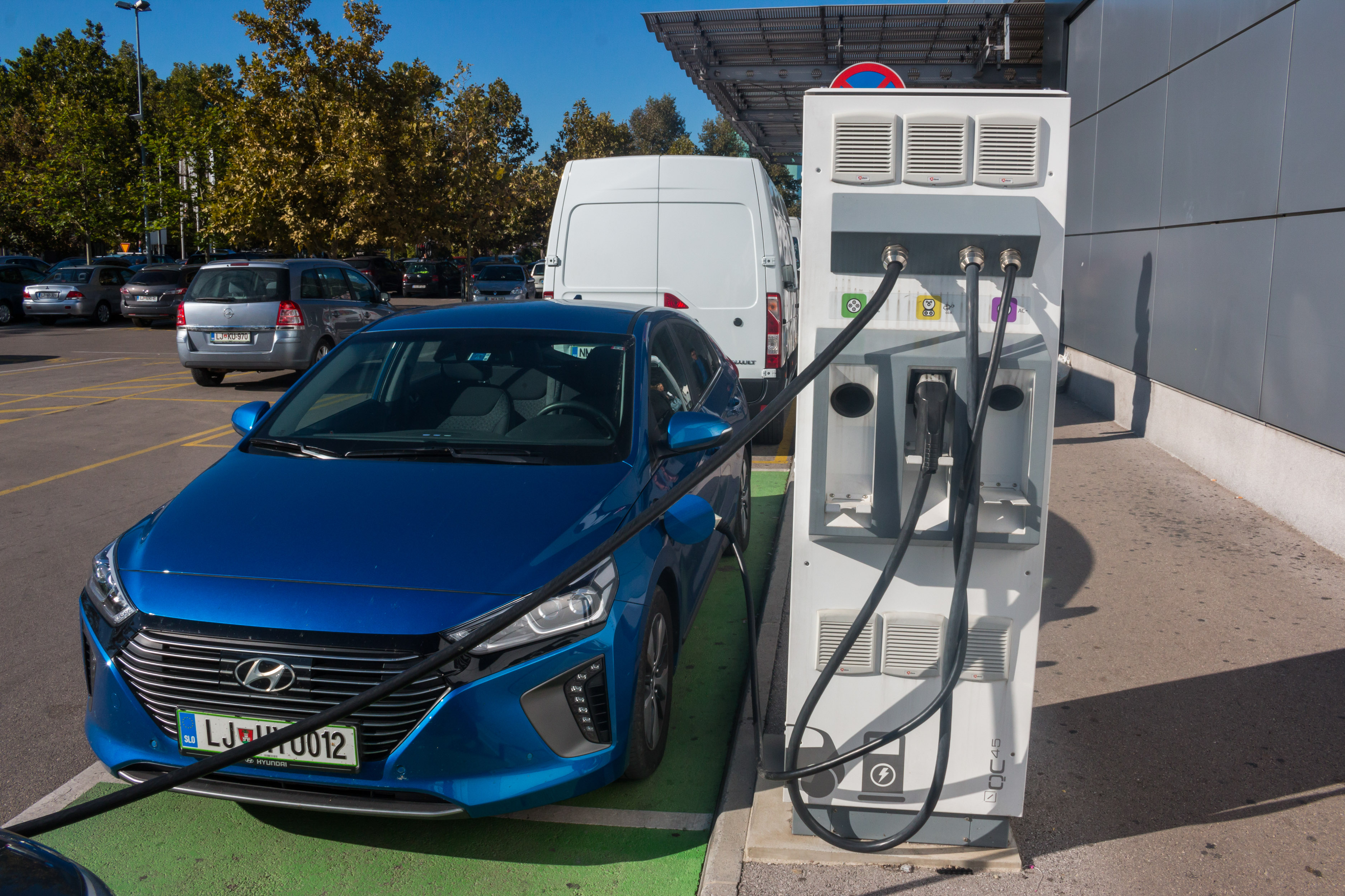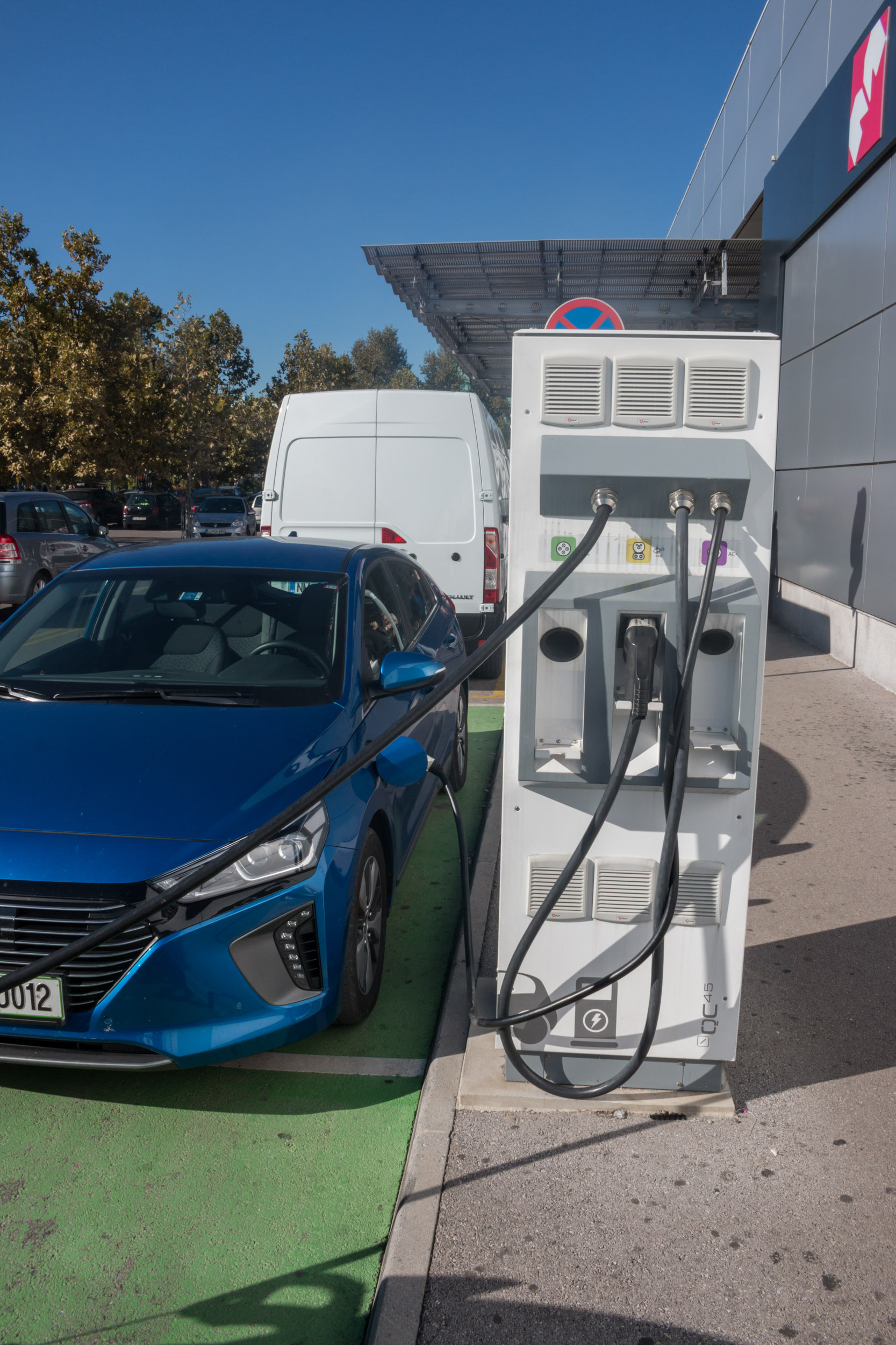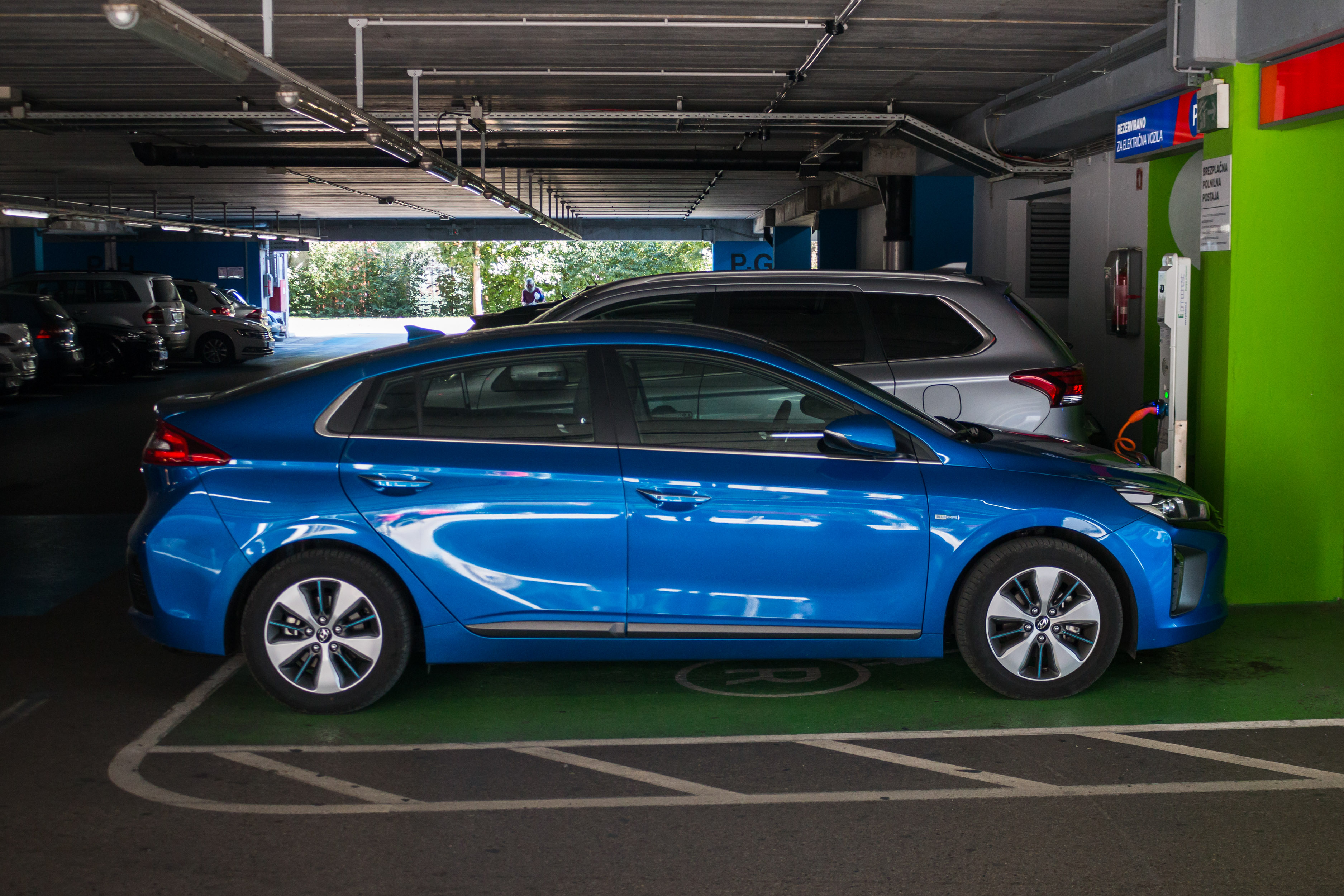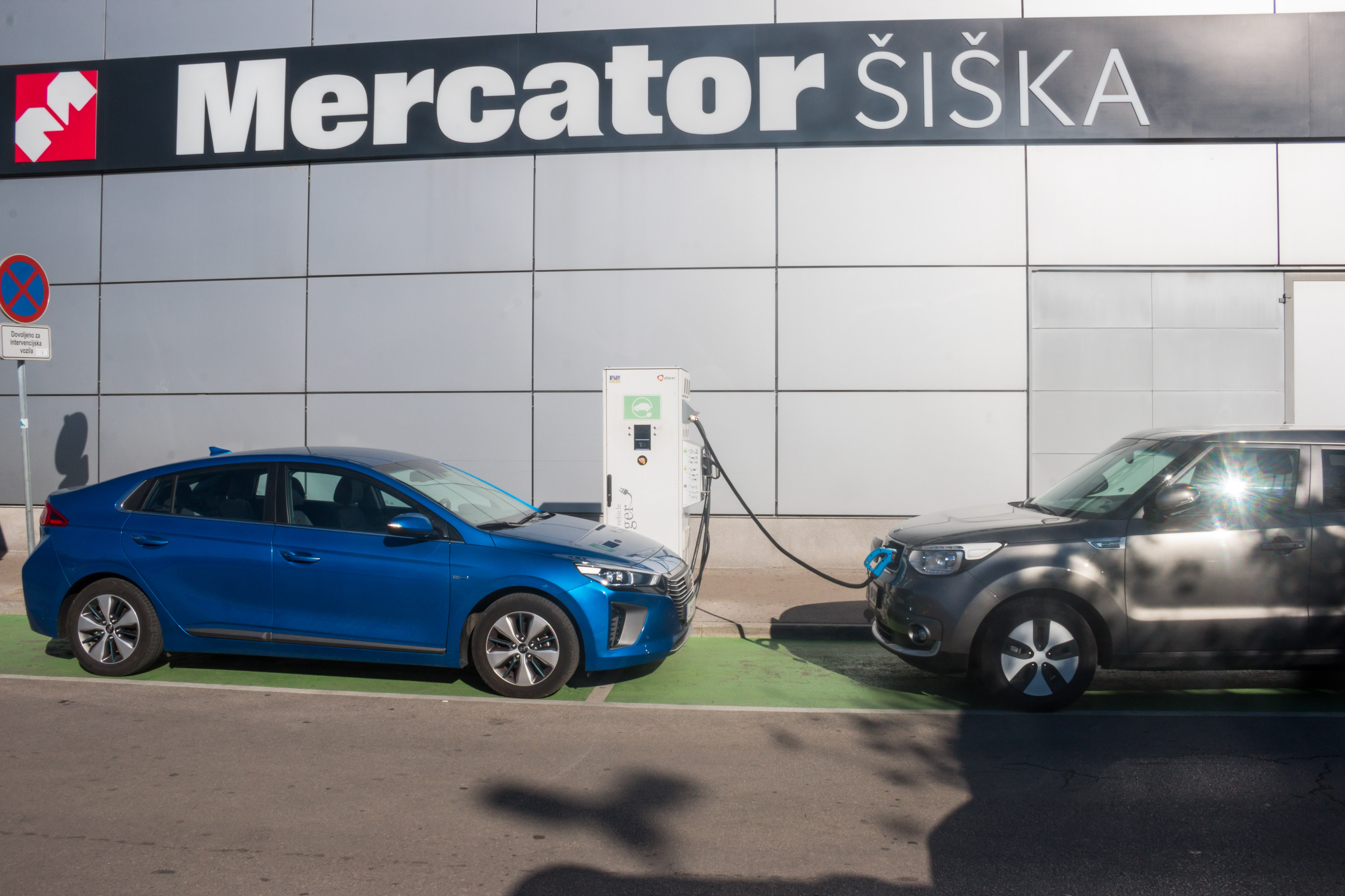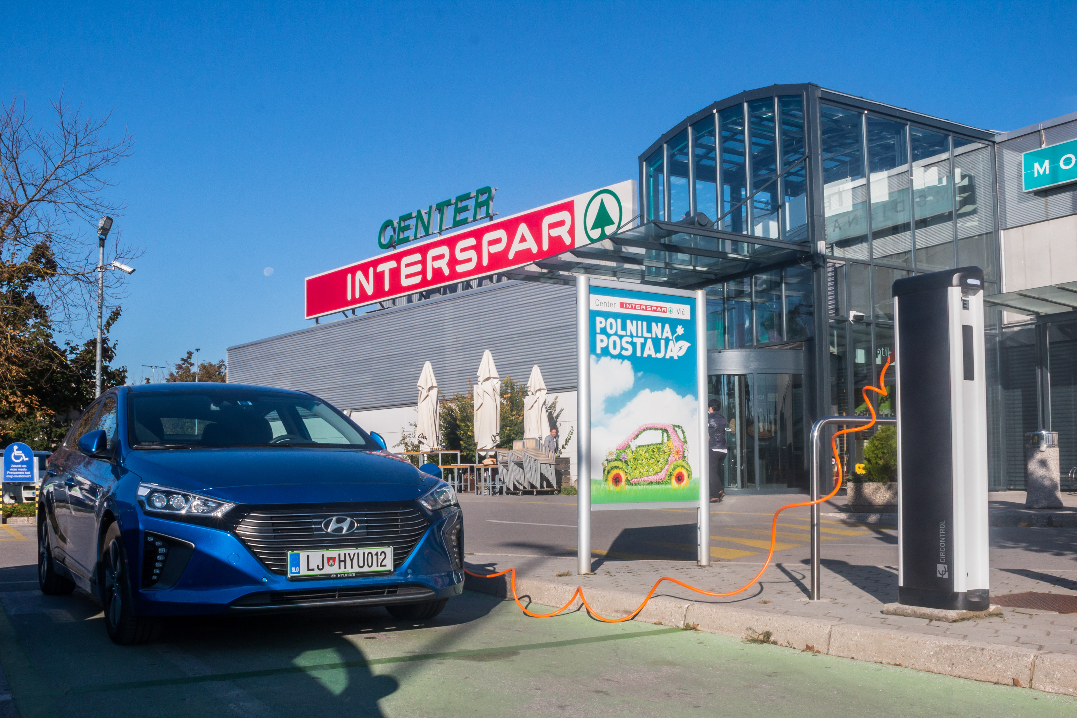 Z našim supertestnim priključnim hibridom ioniqom smo se podali pred trgovine in uvideli, da zlasti večji trgovski centri razumejo tudi strategijo pomena za elektriko rezerviranega parkirnega mesta bližje vhodu. To pa je nekaj, kar pri množičnemu nakupovanju dandanes pomeni bonus, saj parkirišč v konicah kar hitro zmanjka. Seveda se lahko zgodi, da je na polnilnici parkirano vozilo, ki se ne polni, kar je izziv za večino polnilnih postaj tudi na drugih lokacijah, predvsem v mestnih središčih. Med našim testom na tak primer nismo naleteli, kar morda lahko pripišemo kulturni solidarnosti in povezanosti lastnikov električnih vozil. Se nam je pa zgodilo, da se je na polnilnici že polnil avtomobil, ki je uporabljal enak vtikač, kot ga uporablja oz. potrebuje naš ioniq, ni pa bilo možnosti priključitve rezervnega polnilnega kabla, primernega za hišno vtičnico.
