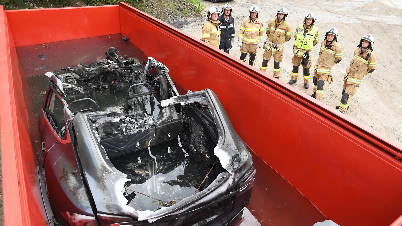 Gasilci, ki morajo pogasiti goreč akumulator, se torej znajdejo pred velikim izzivom: gašenje z običajnimi sredstvi ni dovolj učinkovito. Pomaga le eno: potopitev sklopa akumulatorjev v veliko količino vode.