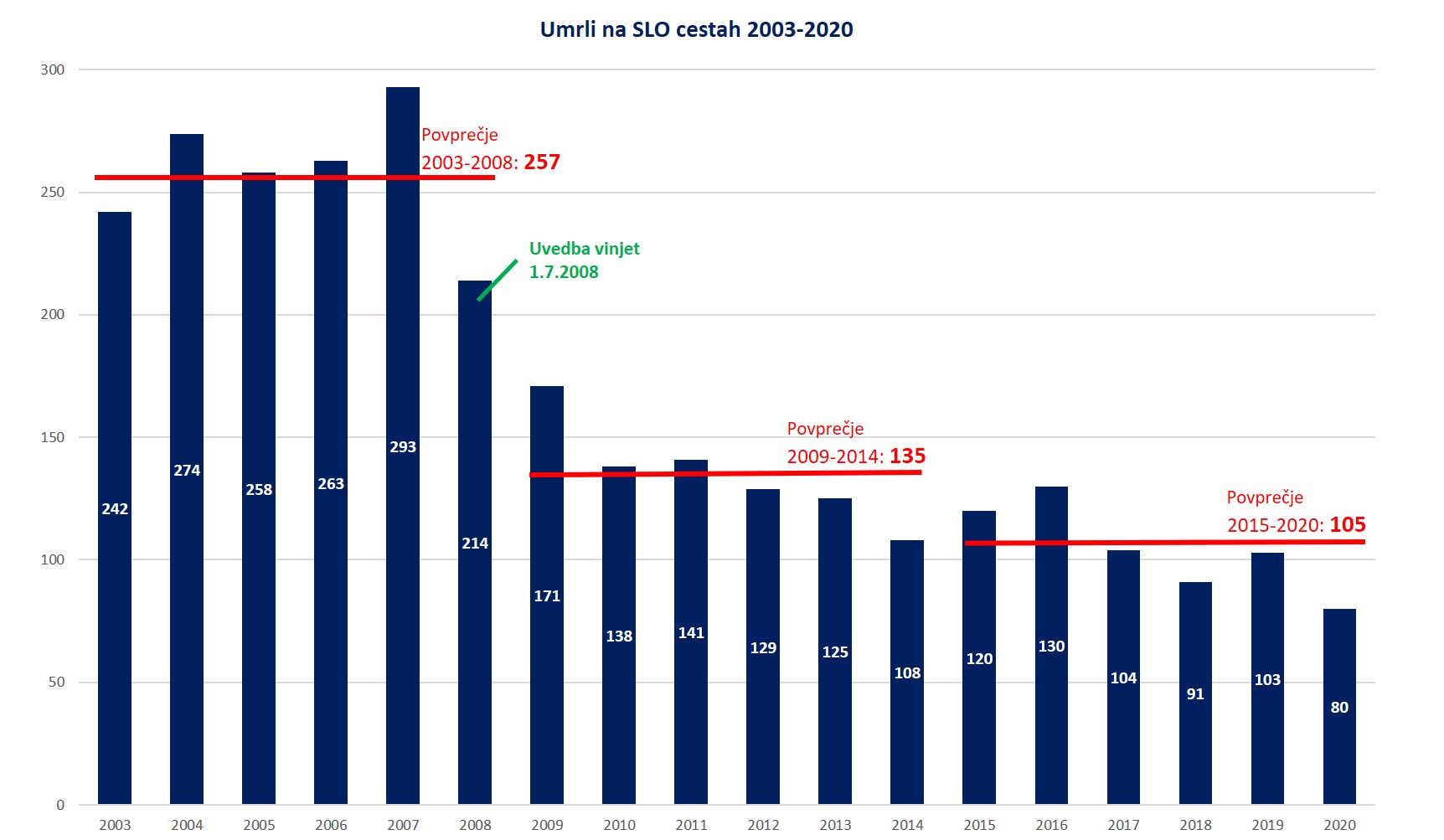 Leto 2020 bo v zgodovino zapisano kot leto, ko je na slovenskih cestah za posledicami prometnih nesreč umrlo najmanj ljudi do sedaj, 80. Seveda smo tega lahko veseli, a evforije ob tem ne sme biti: številka umrlih in hudo telesno poškodovanih bi morala biti še nižja. V letu, ki so ga zaznamovali ukrepi proti novemu koronavirusu, je bilo prometa na cestah precej manj kot sicer, zato bi morala biti prometna varnost še boljša.