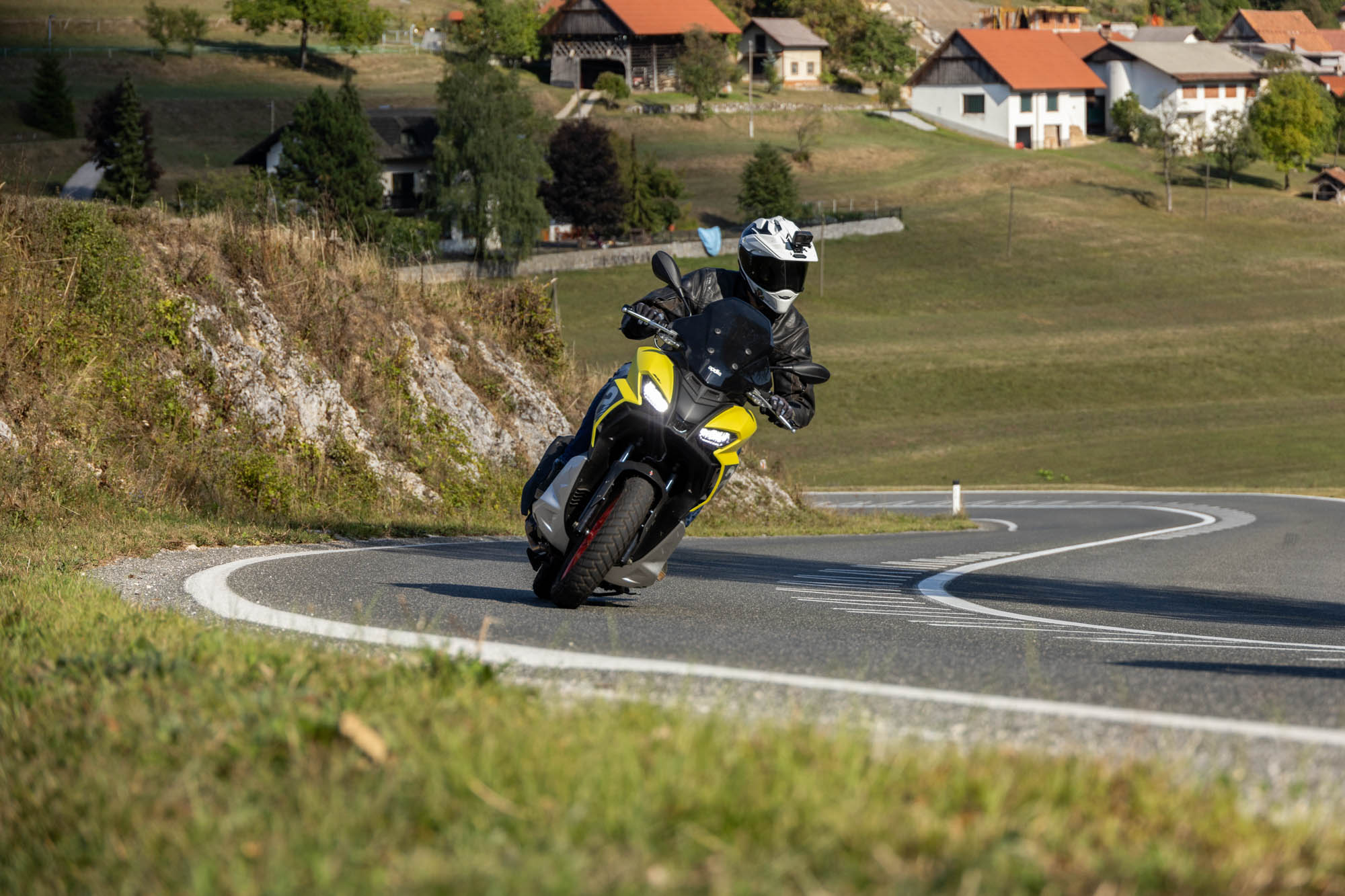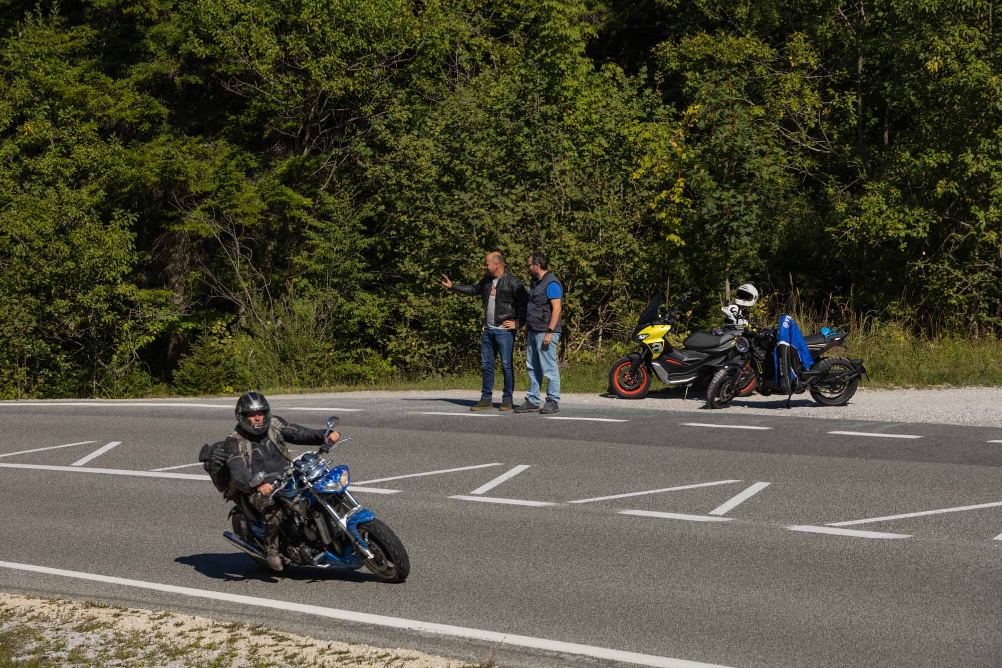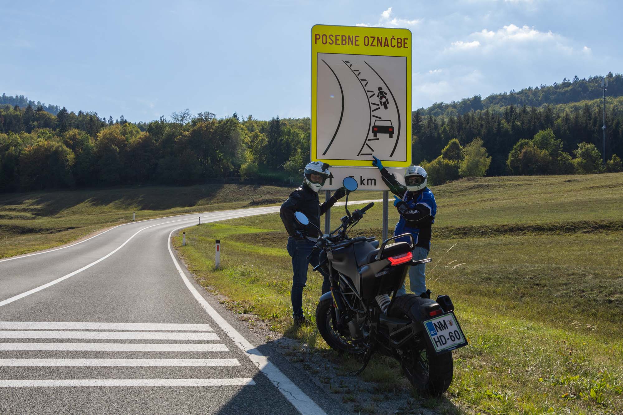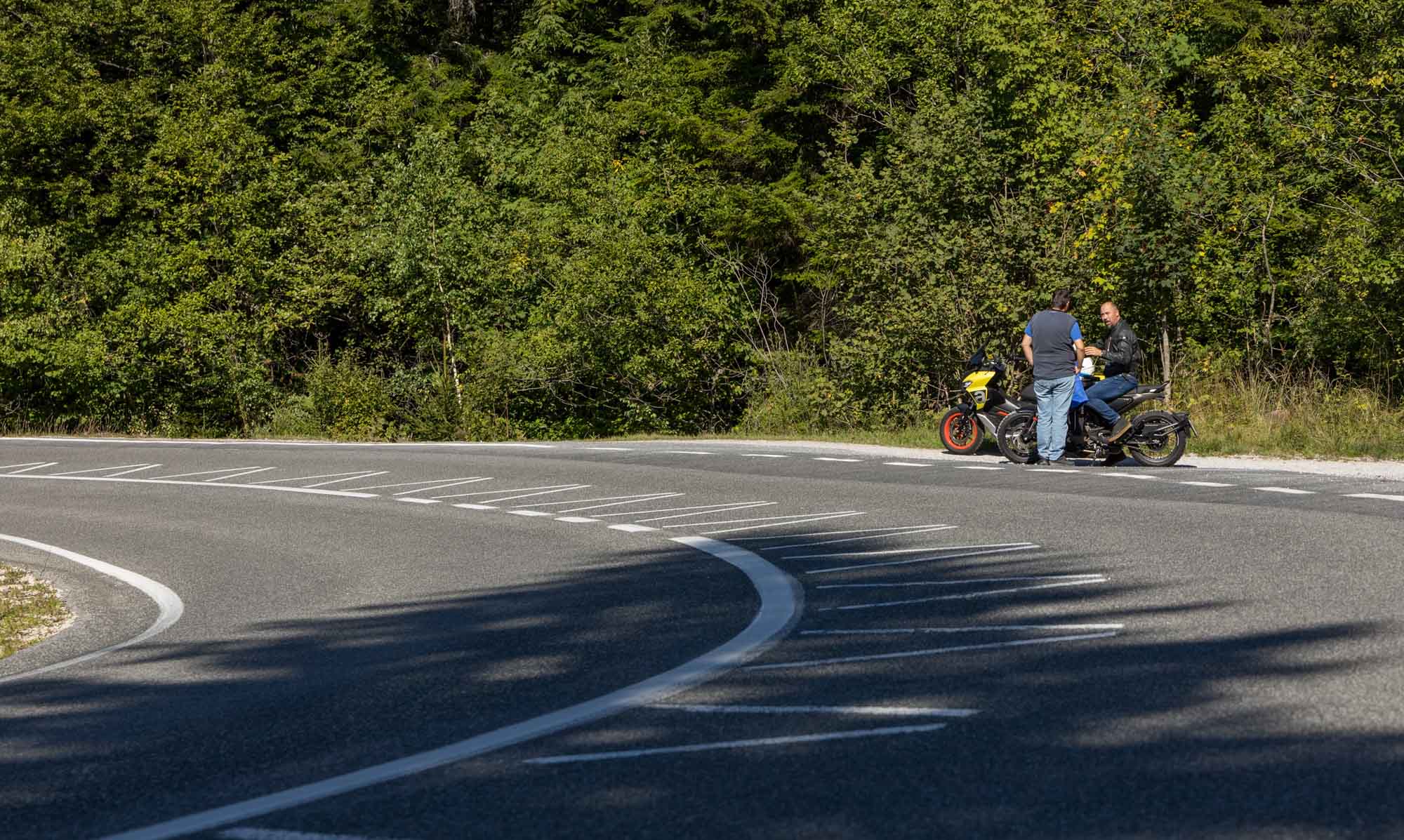 Preden sva se s Petrom odpeljala, sva ponovila tisto, kar me je v AMZS šoli vožnje učil inštruktor: počasi v križišče, pogled nazaj pri menjavi smeri, predvidevanje, ustrezna varnostna razdalja in dva prsta vedno pripravljena za hitro posredovanje na ročici zavor oziroma sklopki. V Podpeči sva zavila navkreber med asfaltne ovinke motoristične klasike proti Rakitni, ki jo je mogoče podaljšati naprej proti Cerknici. Peter je izbral odlično cesto, na kateri je pridobivanje motorističnih izkušenj lažje zaradi talnih označb, ki motoristu začetniku pomagajo pri ohranjanju varne in pravilne linije skozi ovinek. Če se pelješ ob začrtani smeri, pri nagibanju v ovinek z glavo nikoli ne boš segel na nasprotni vozni pas. To je zelo pomembna lekcija, ki preprečuje tragedije. Prvo serijo ovinkov je pred menoj vozil Peter, da sem videl, kako pomembna je linija in kako učinkovito motor pomaga usmerjati pogled daleč naprej.